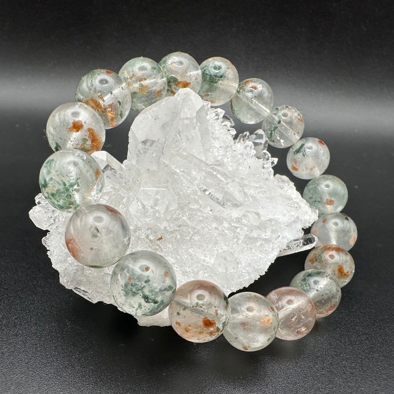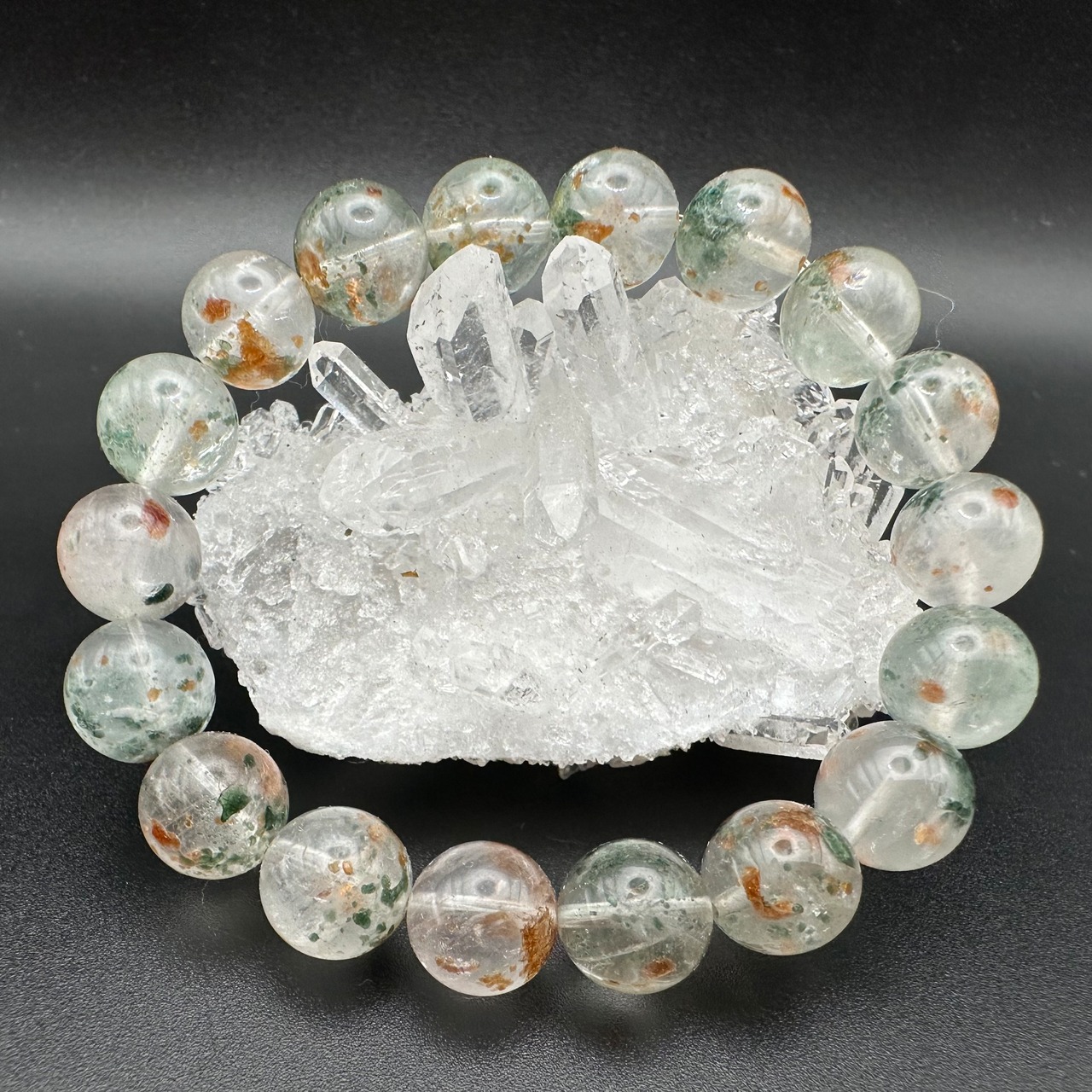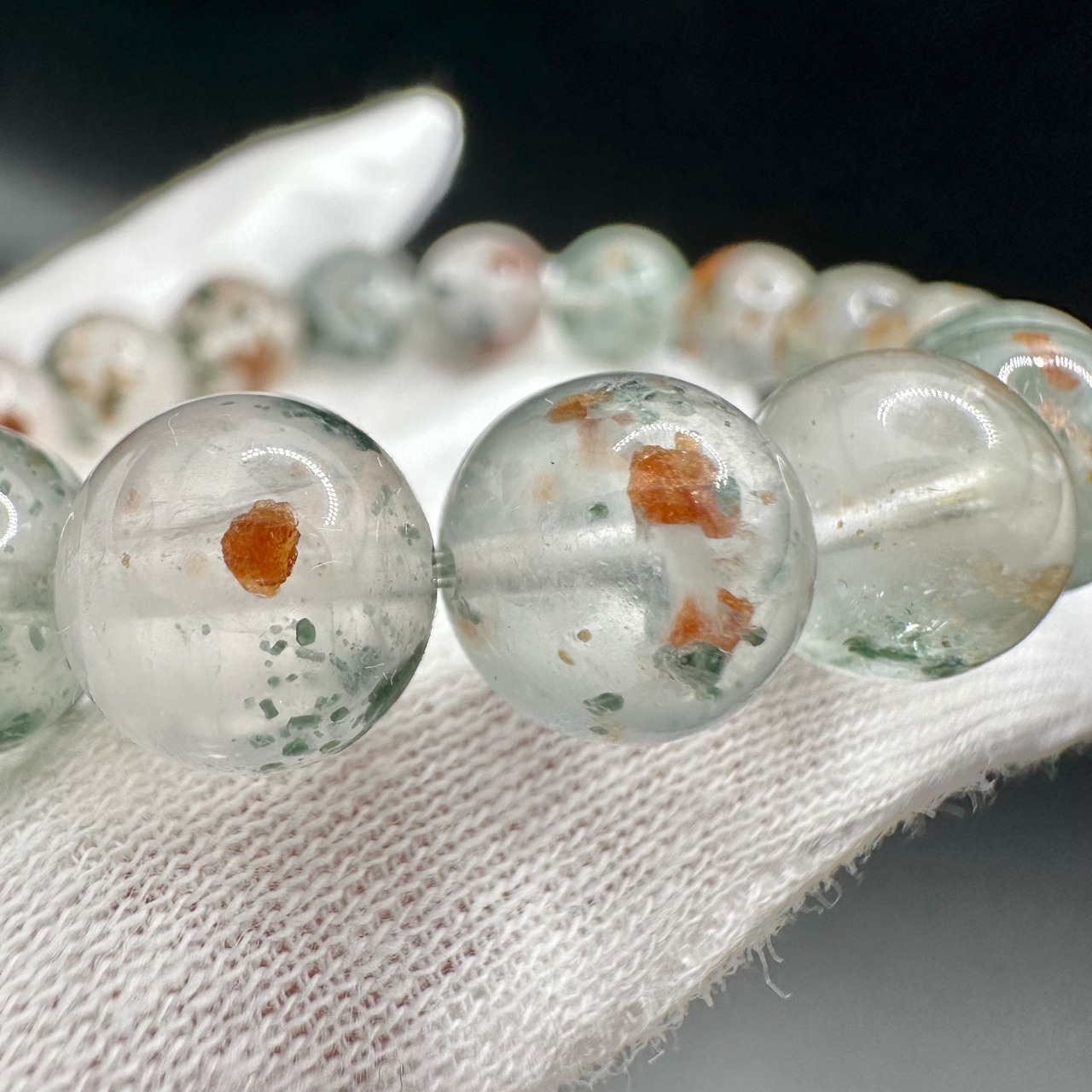 オレンジとグリーンのコントラストがとても美しく、水晶の透明感と抜群の組み合わせです。
