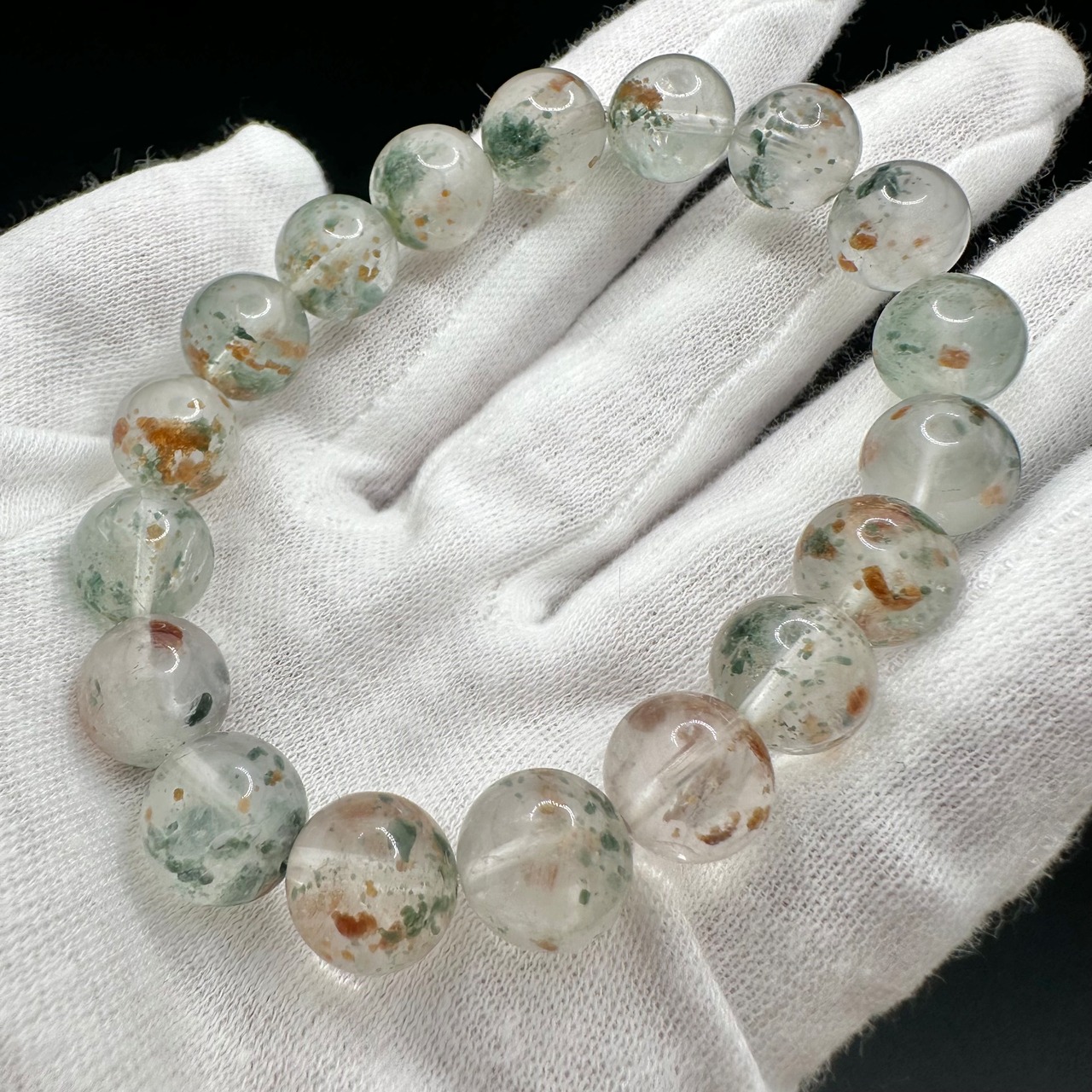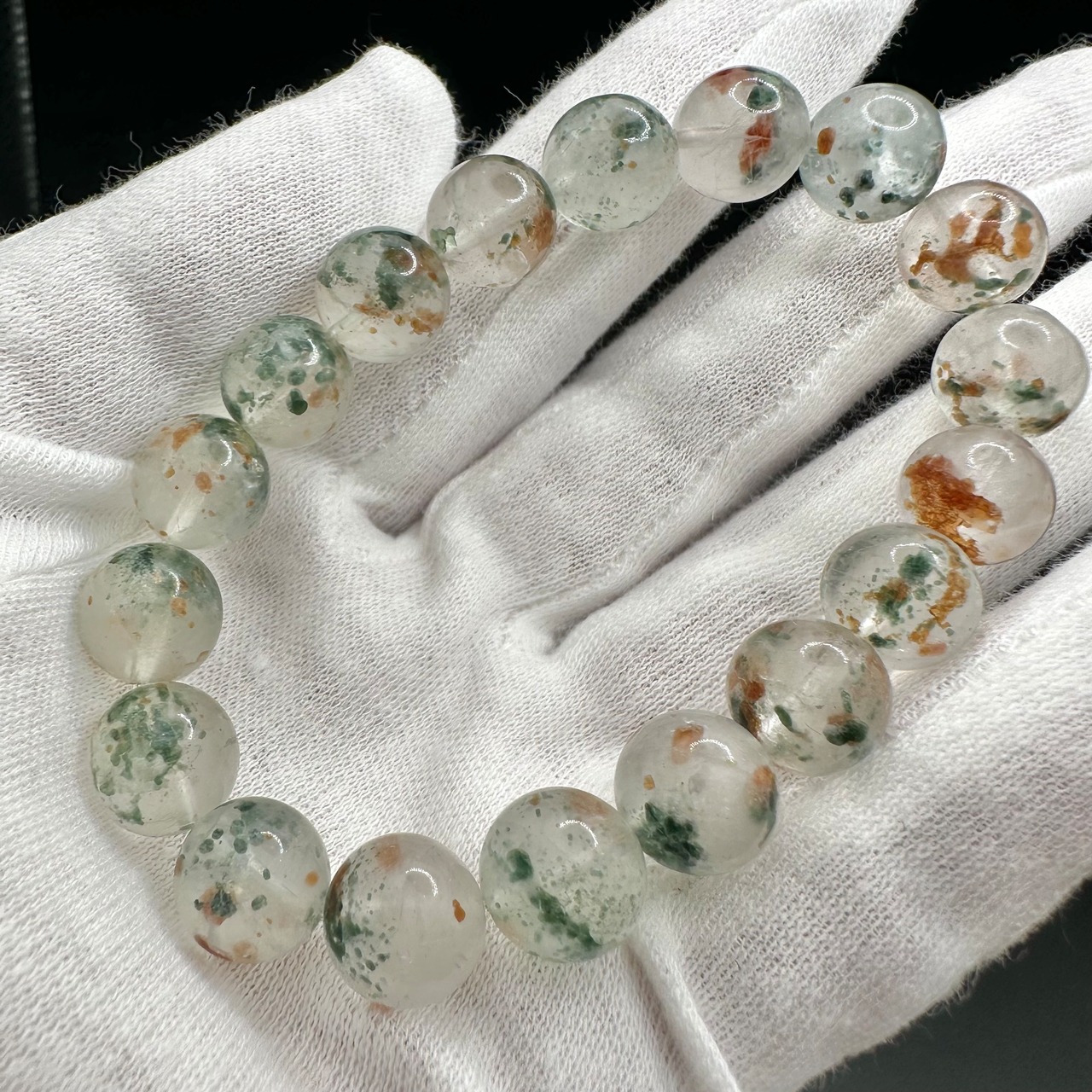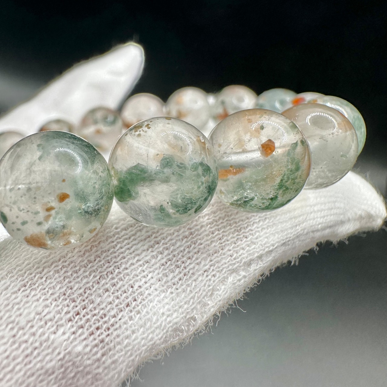 オレンジとグリーンのコントラストがとても美しく、水晶の透明感と抜群の組み合わせです。