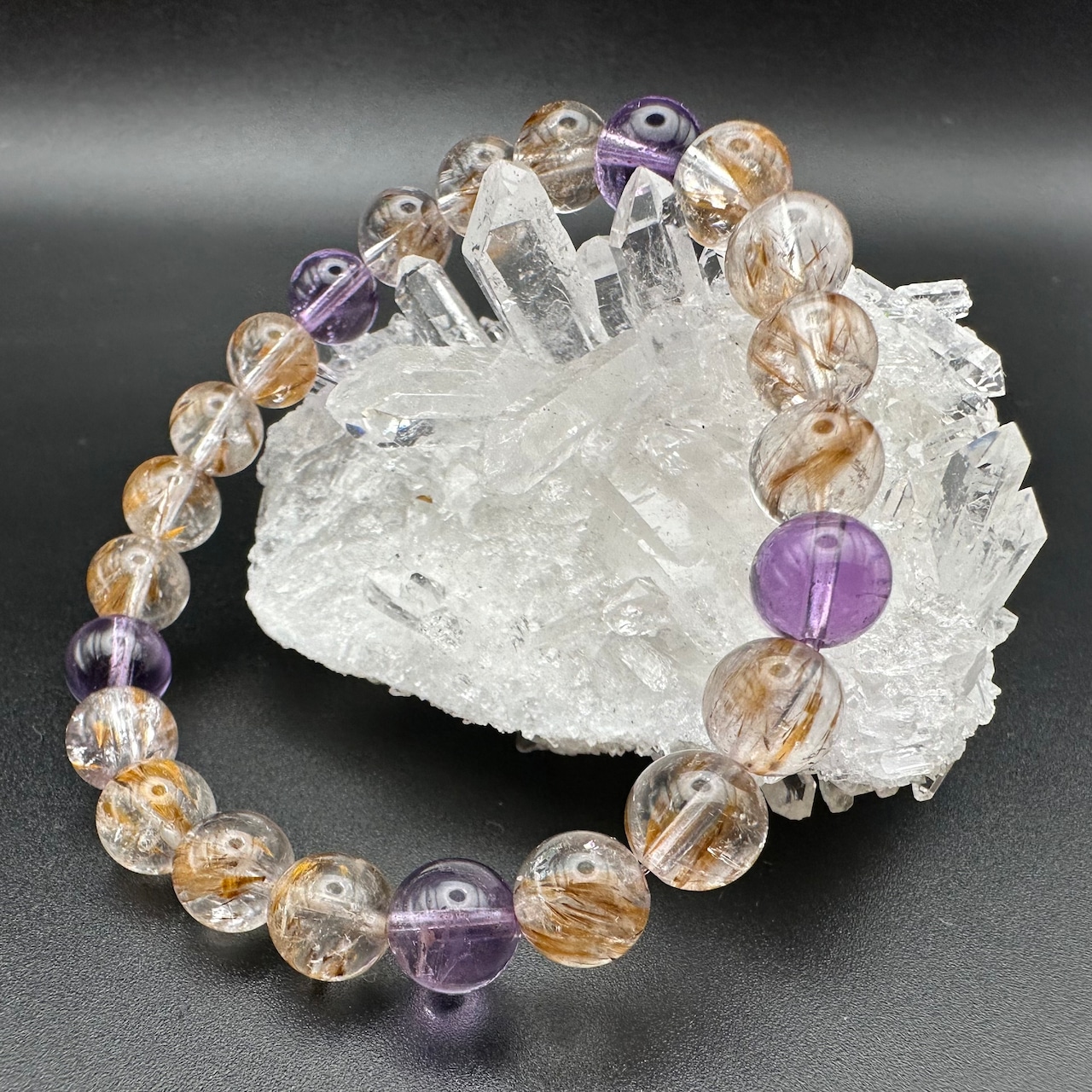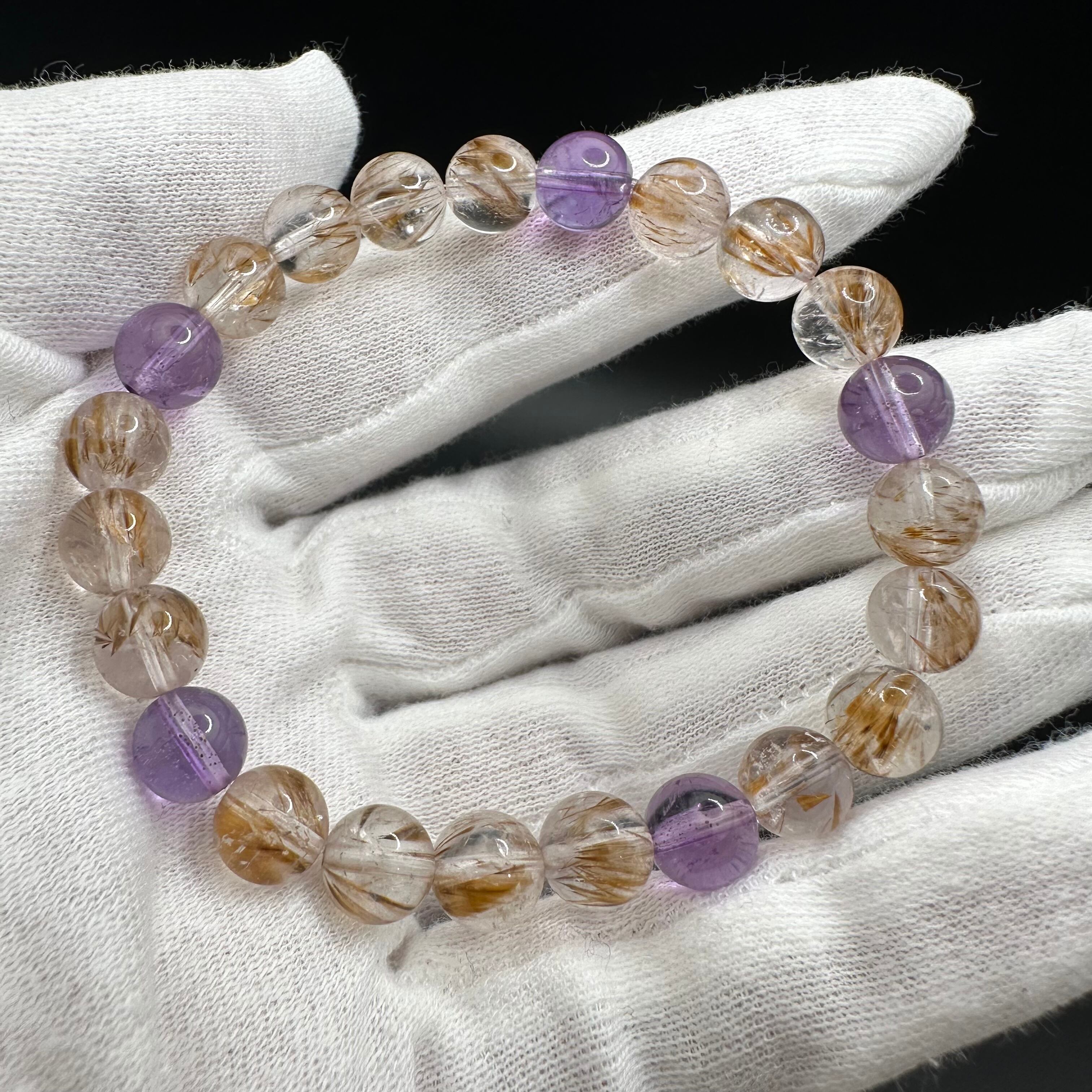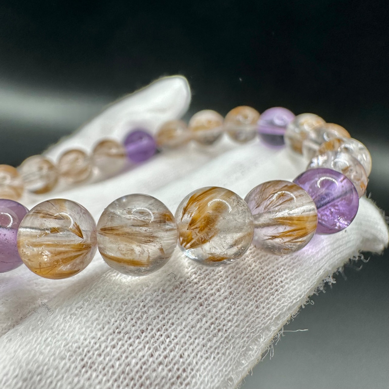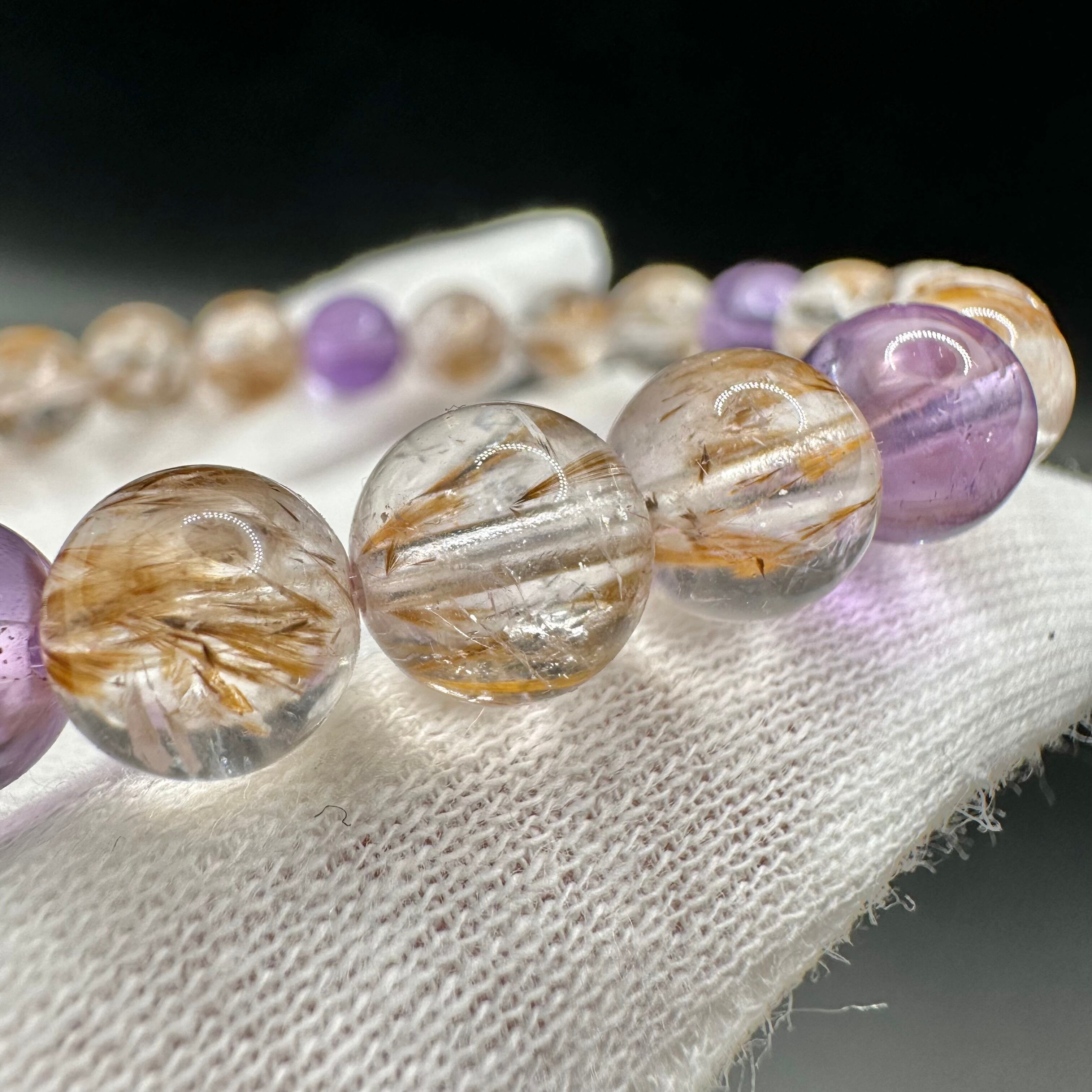 こちらのブレスレットは白地の上に置くと分かるくらいほんのりとした透明感が素晴らしい紫に金色のカコクセナイトが美しく内包されています。