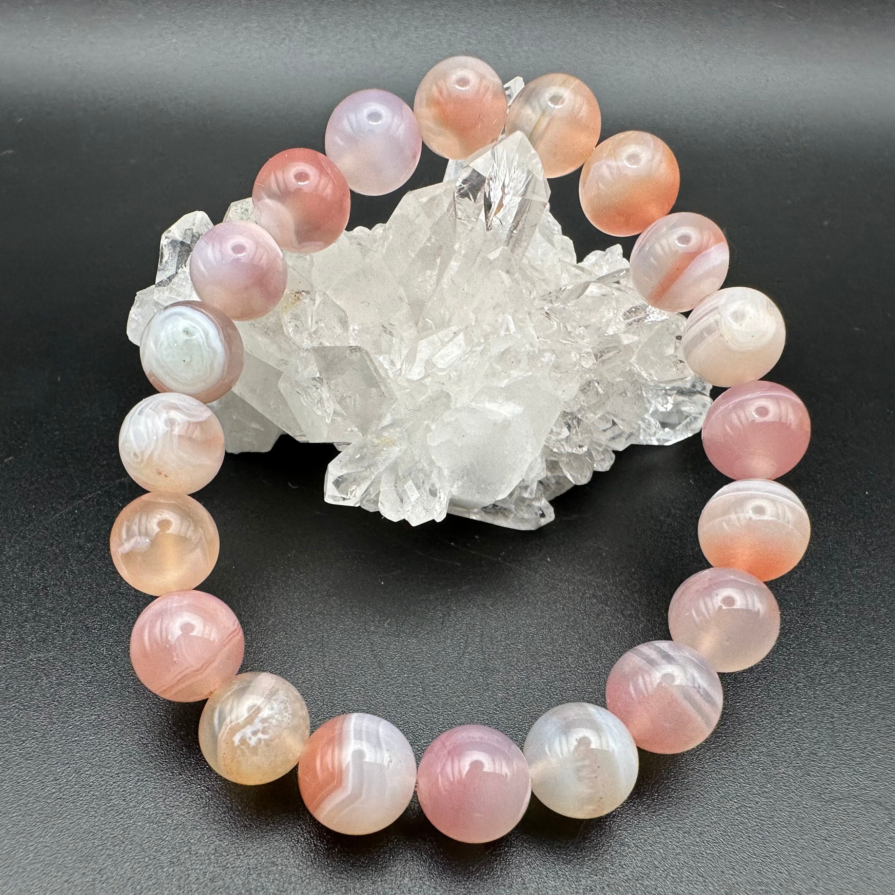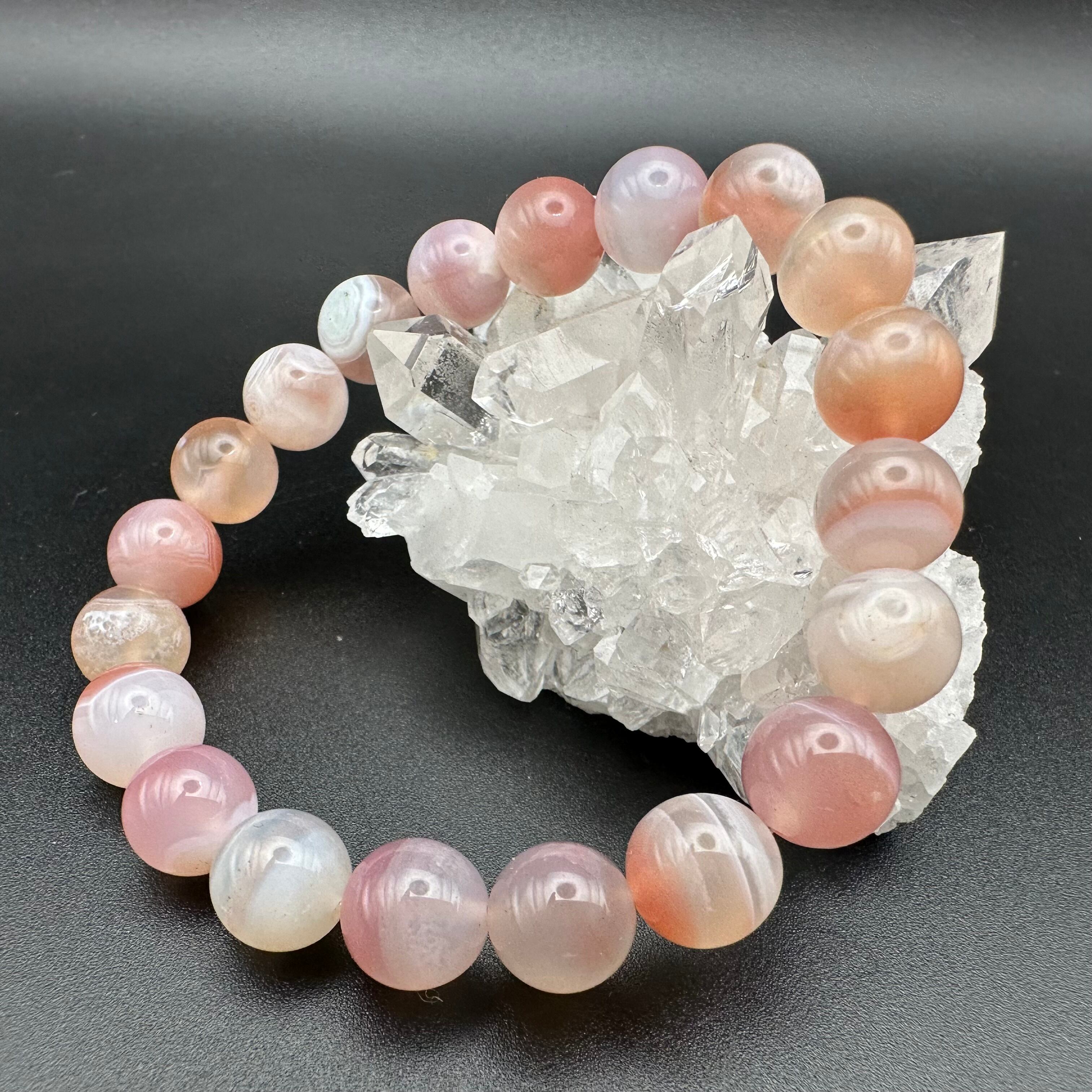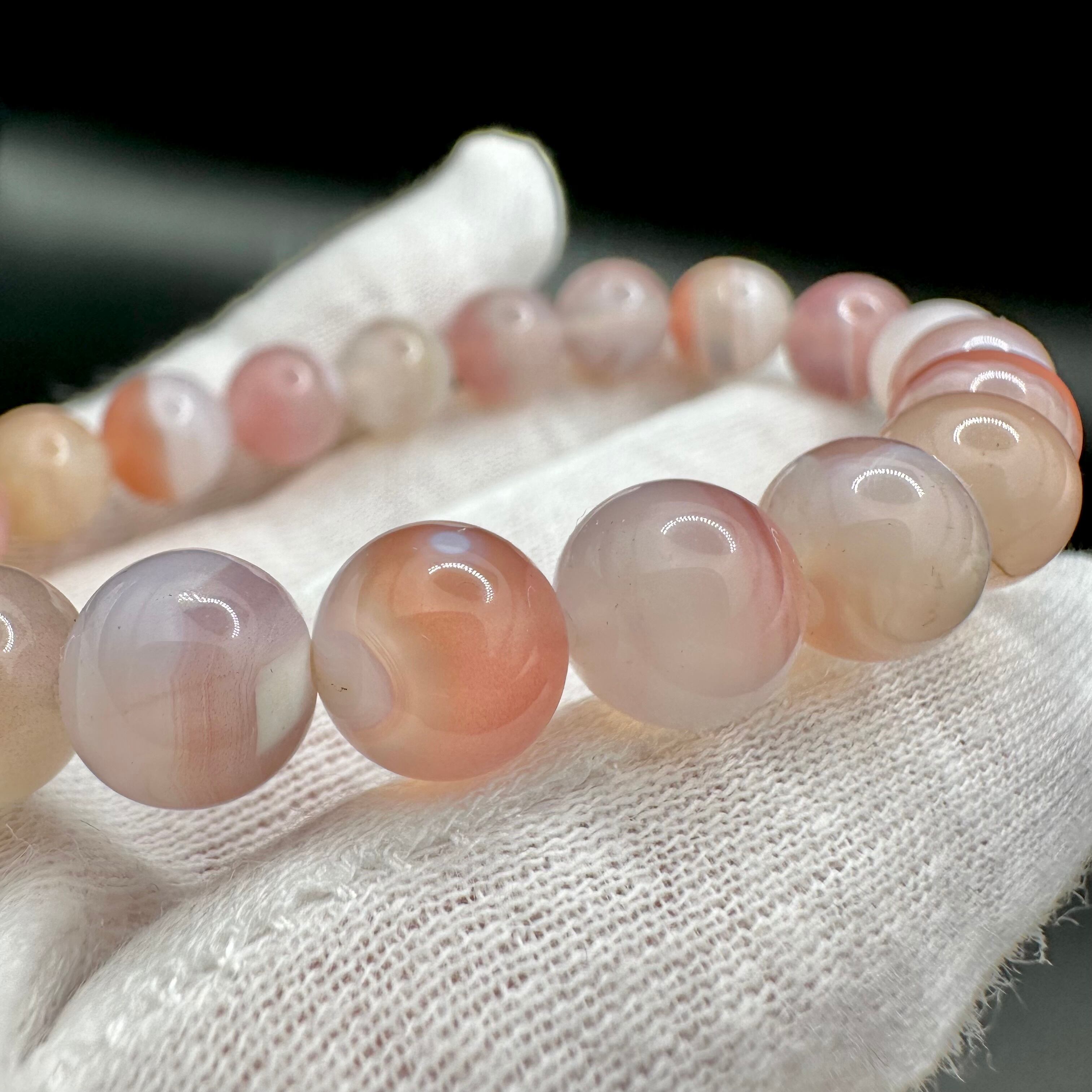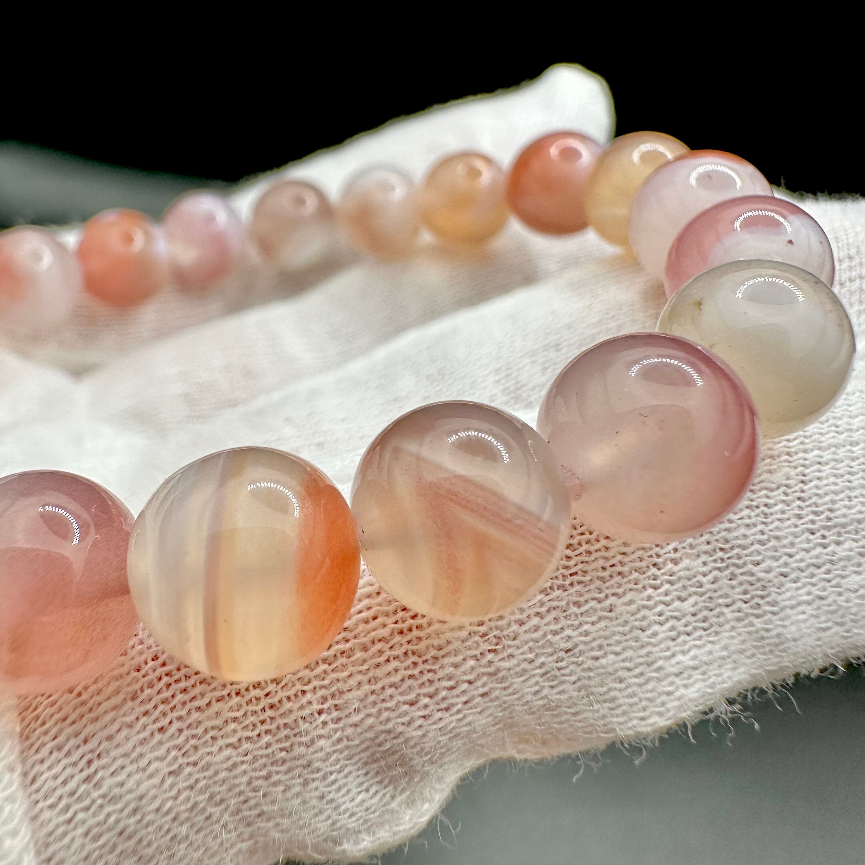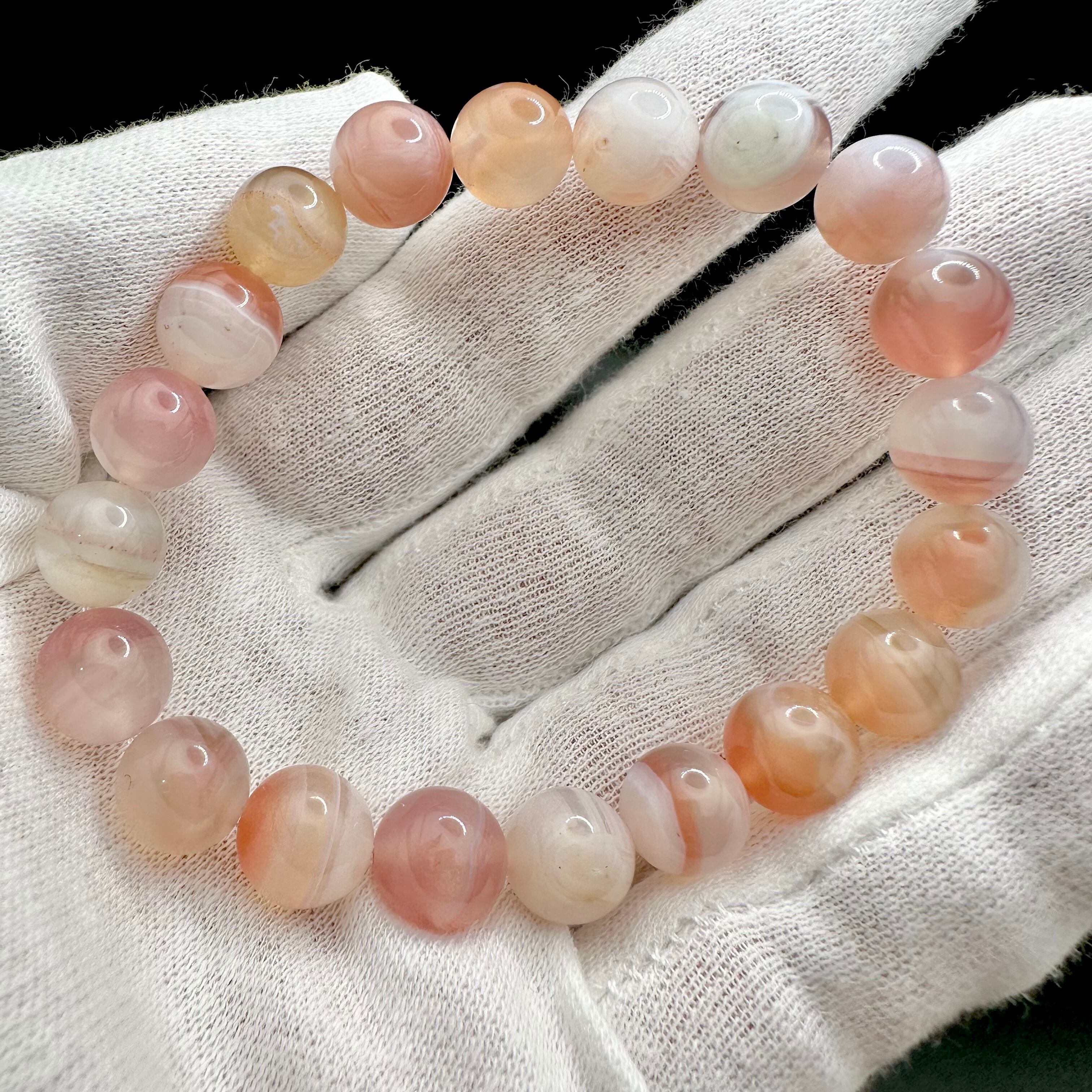 縞模様やフクロウの目のような天眼模様、また抜群の透明感も楽しめる優しく美しい色をしたブレスレットです。