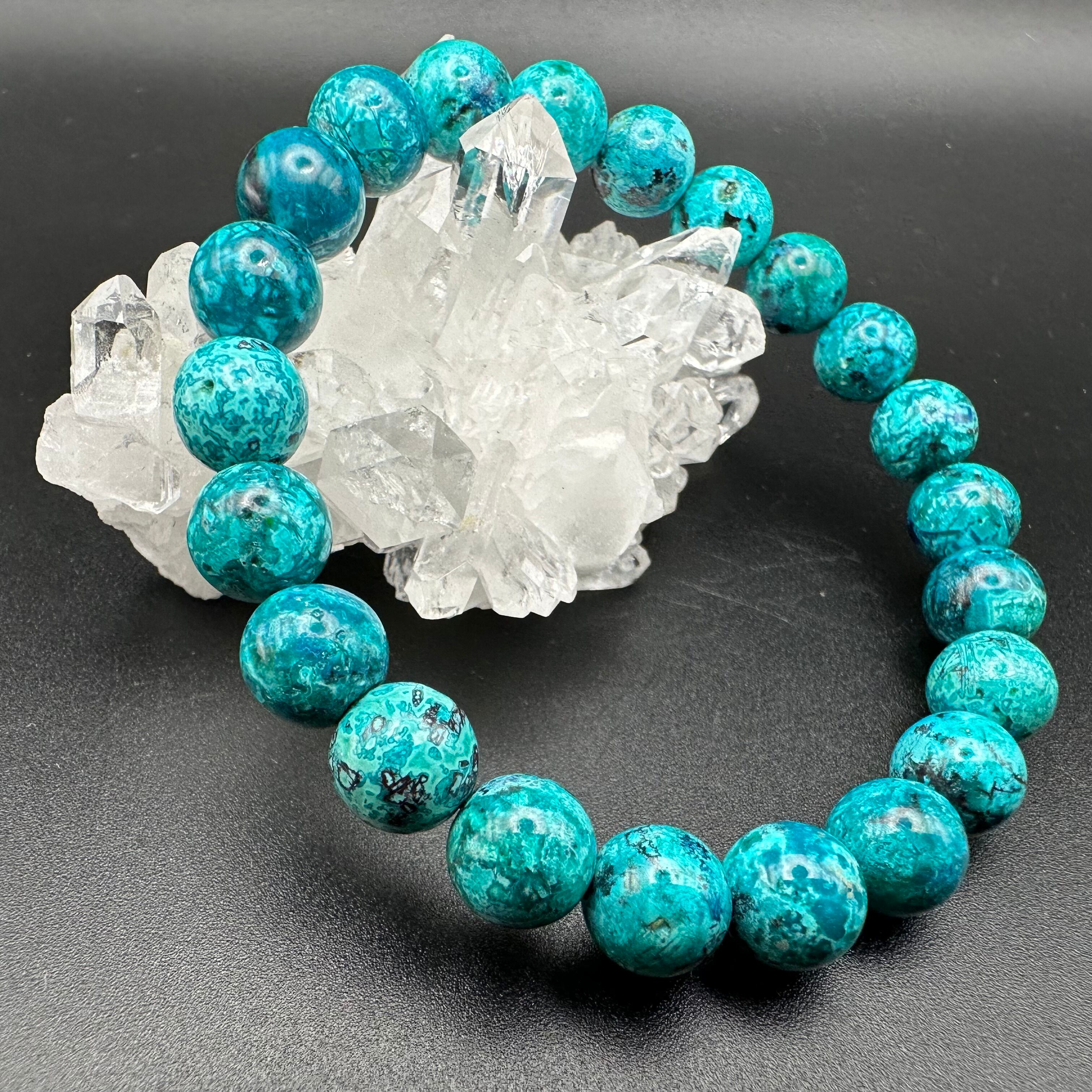 組成式はCu2+(SiO3)4(OH)2。クリソコラやクォンタムクアトロシリカ、アズライトなどと間違われやすいですが、まったく別の鉱物です。