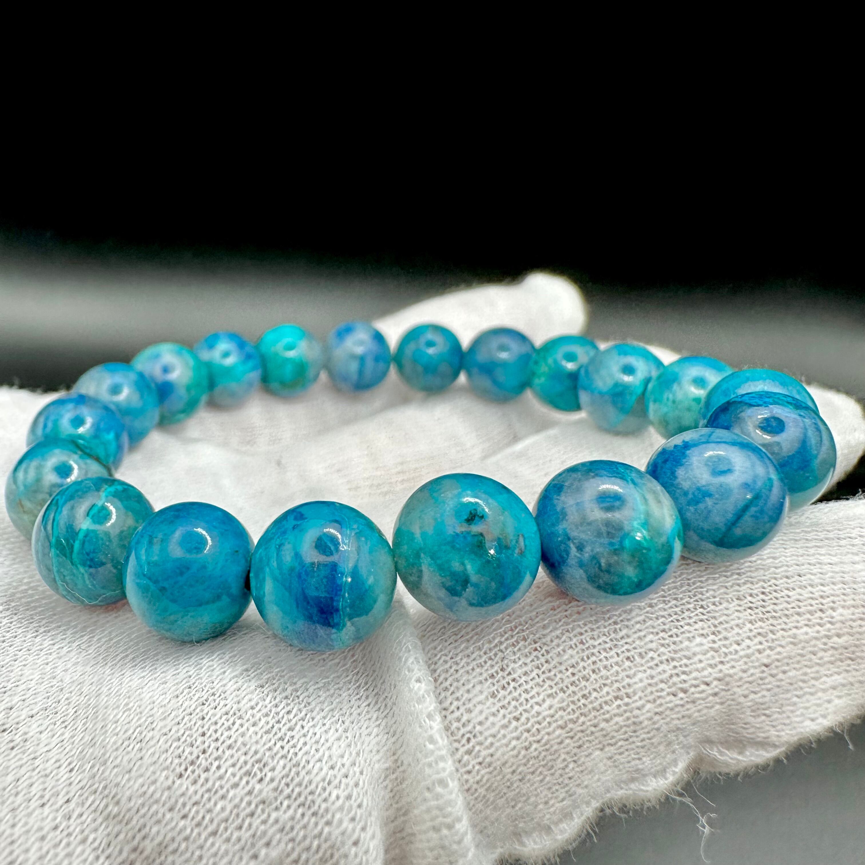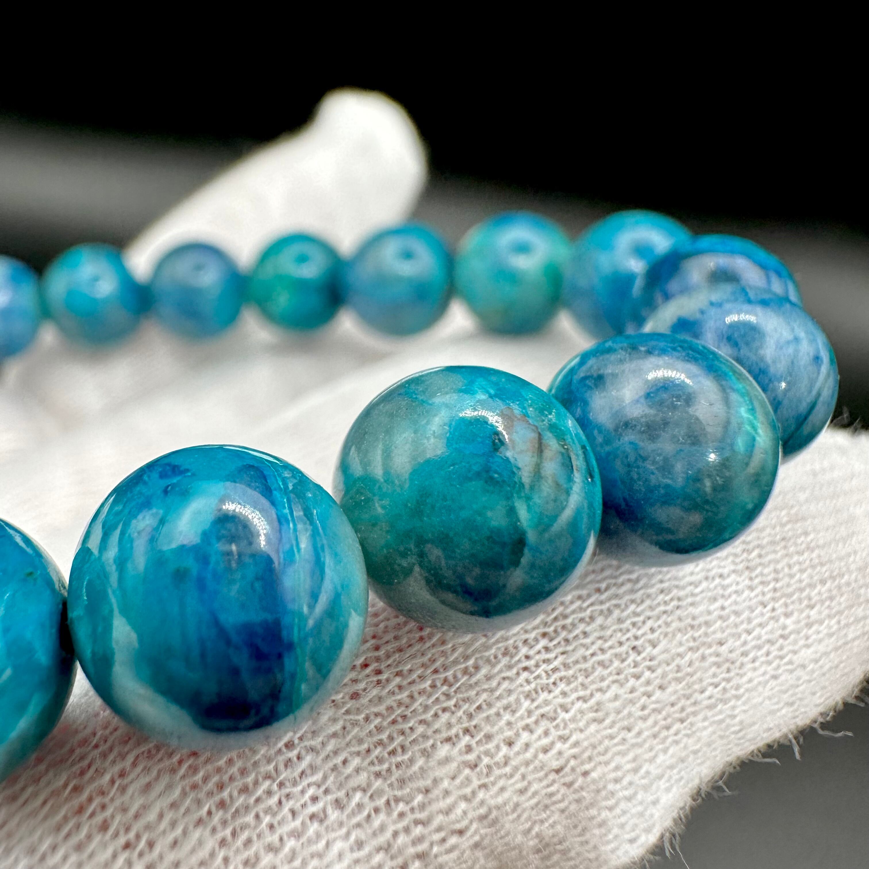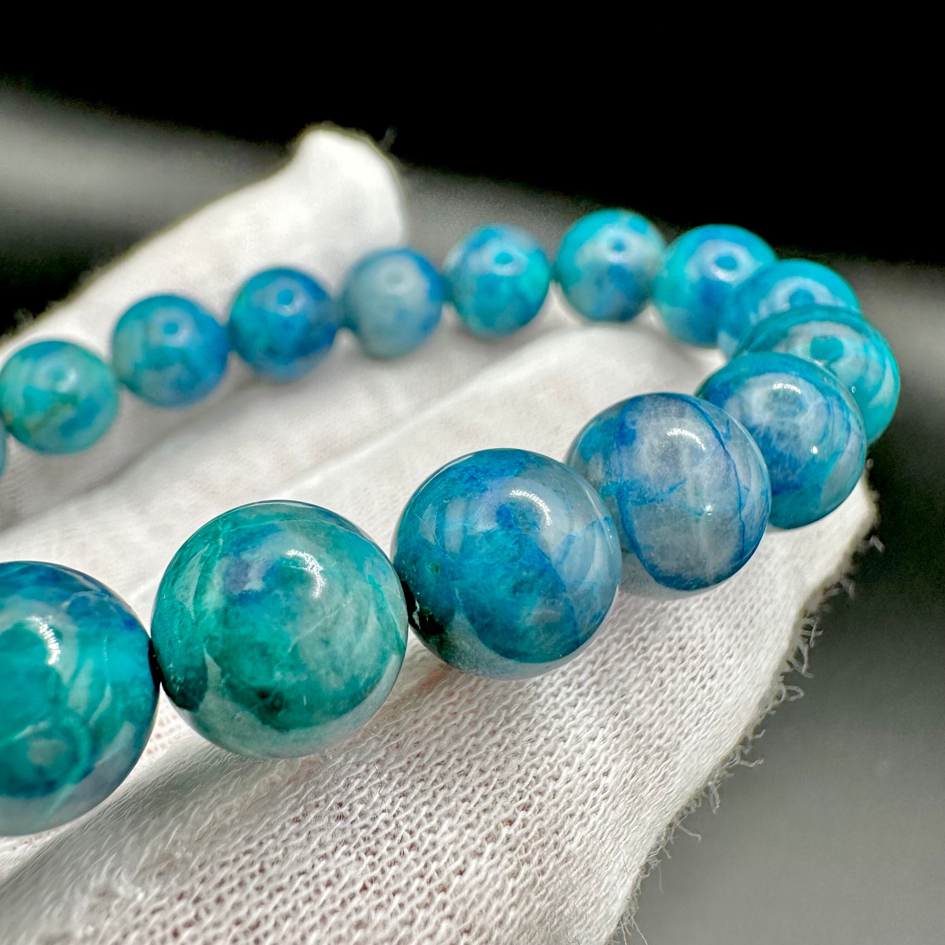 茶色のインクルージョンが多く入っていたり、発色が緑っぽいものが多い中、今回は水色がとてもキレイでスモーキークォーツの透明感も楽しめる素晴らしいクオリティの中々見ないレベルのブレスレットです。