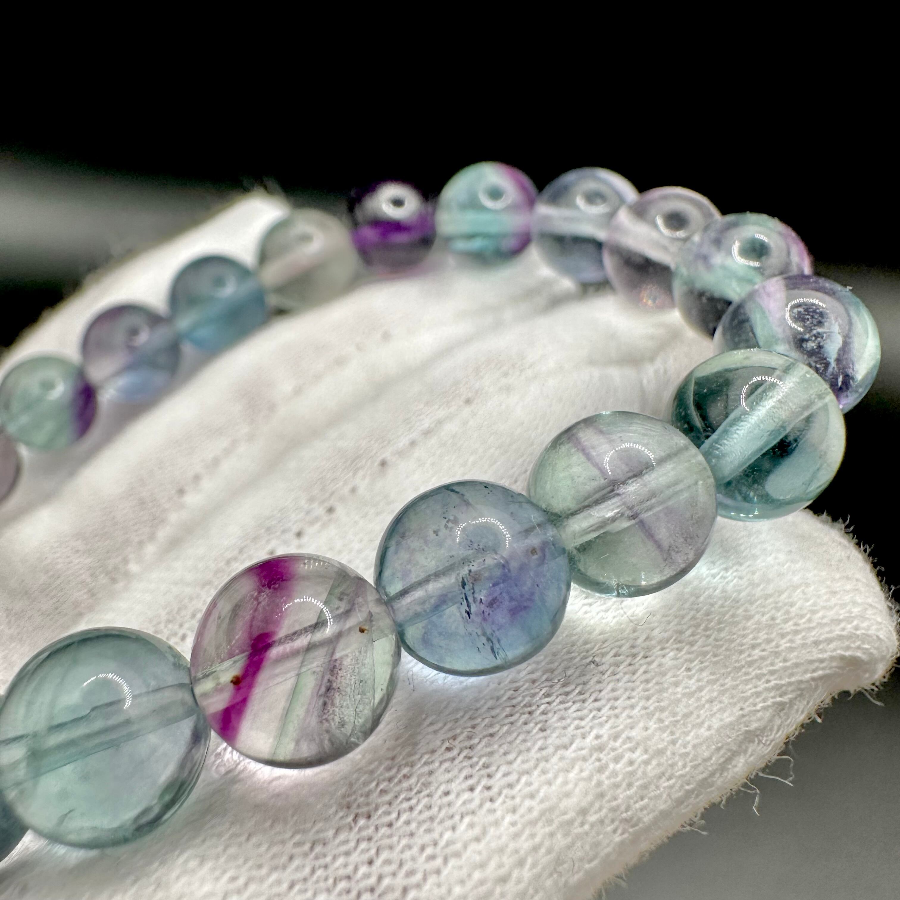 透明感が高くブルー・パープル・クリアを中心にピンクやグリーンなど様々な色が見られる見入ってしまうブレスレットです。