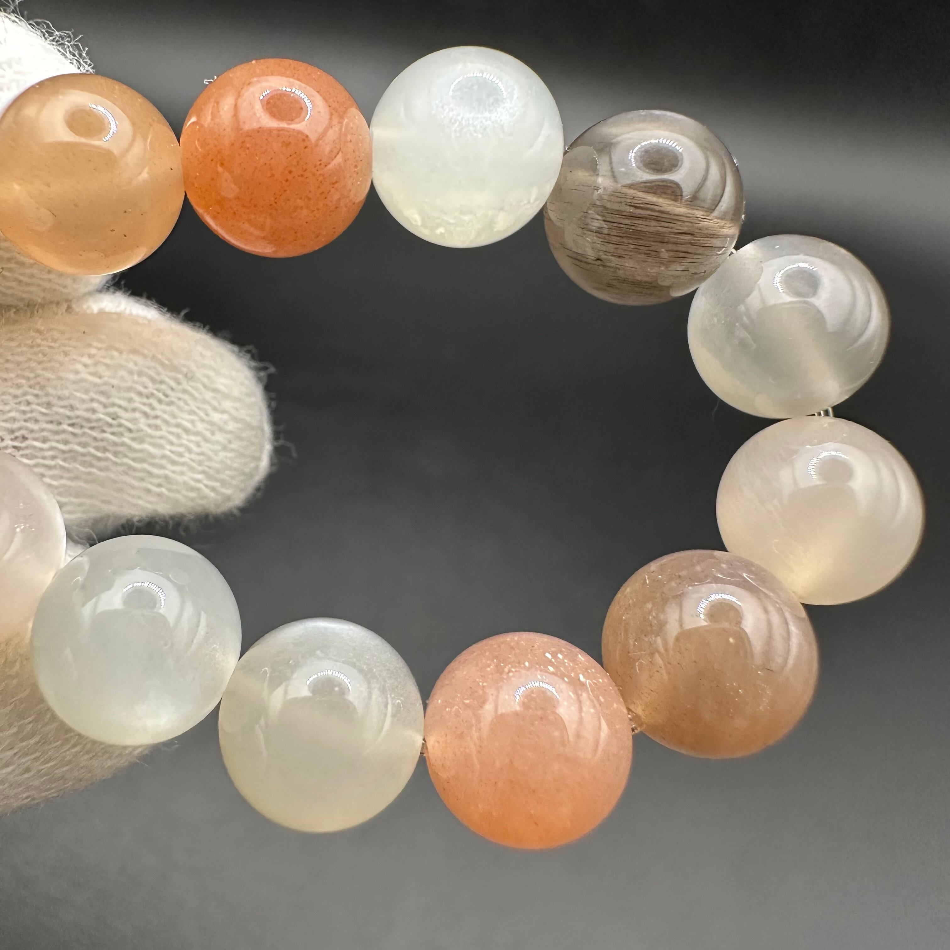 とても優しい雰囲気の淡いオレンジやシルバー・ブラン・ベージュなど様々なカラーに、シラーが幻想的な大変美しいオレンジムーンストーンのブレスレットです。