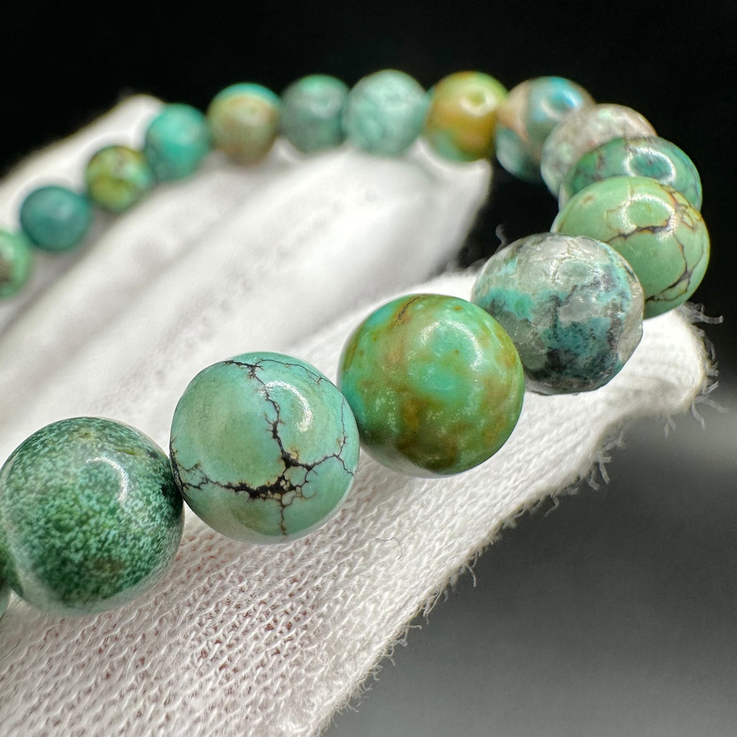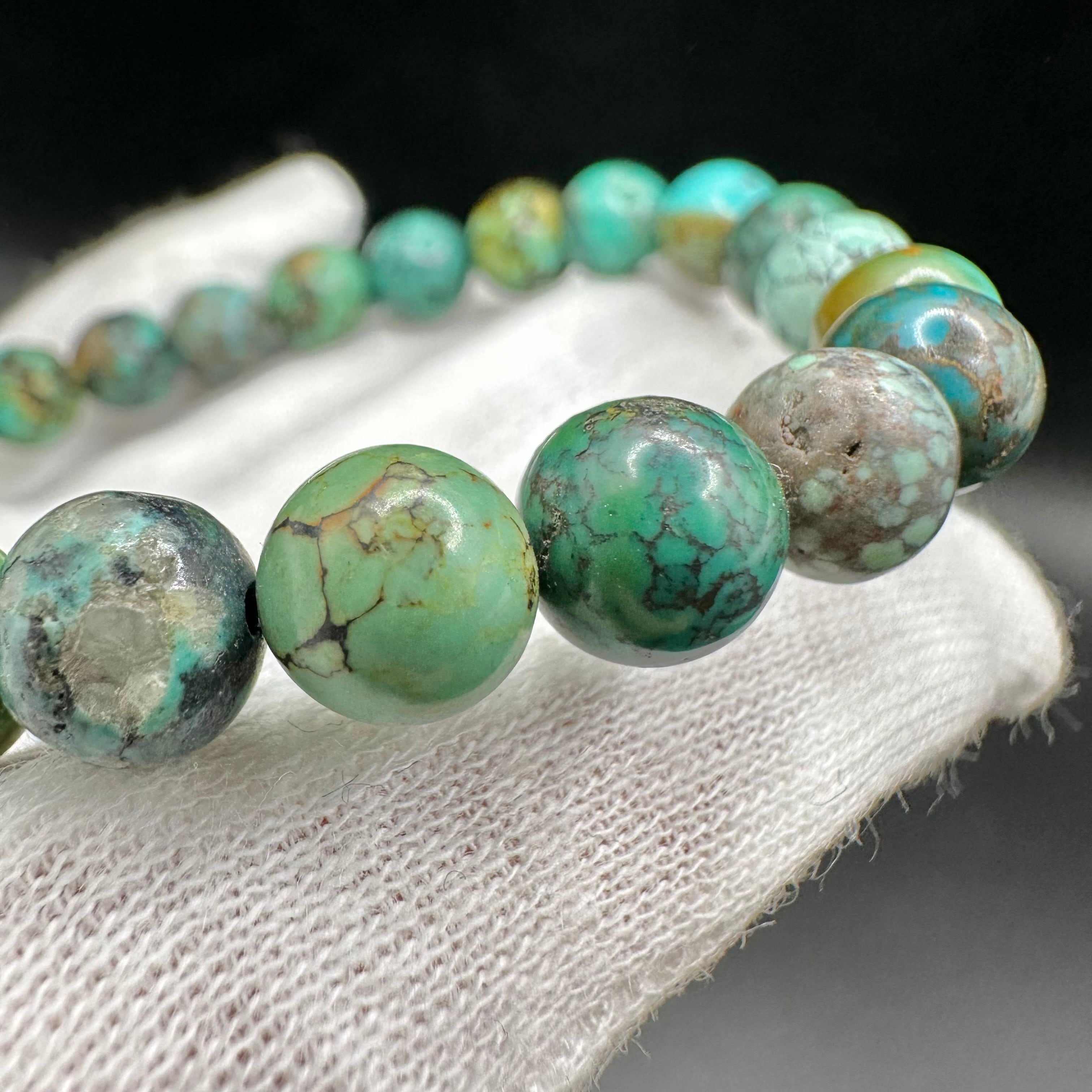 こちらは、ターコイズ特有の黒茶の美しい模様がある玉を集めて、自然味がある玉を選びブレスレットにしました。