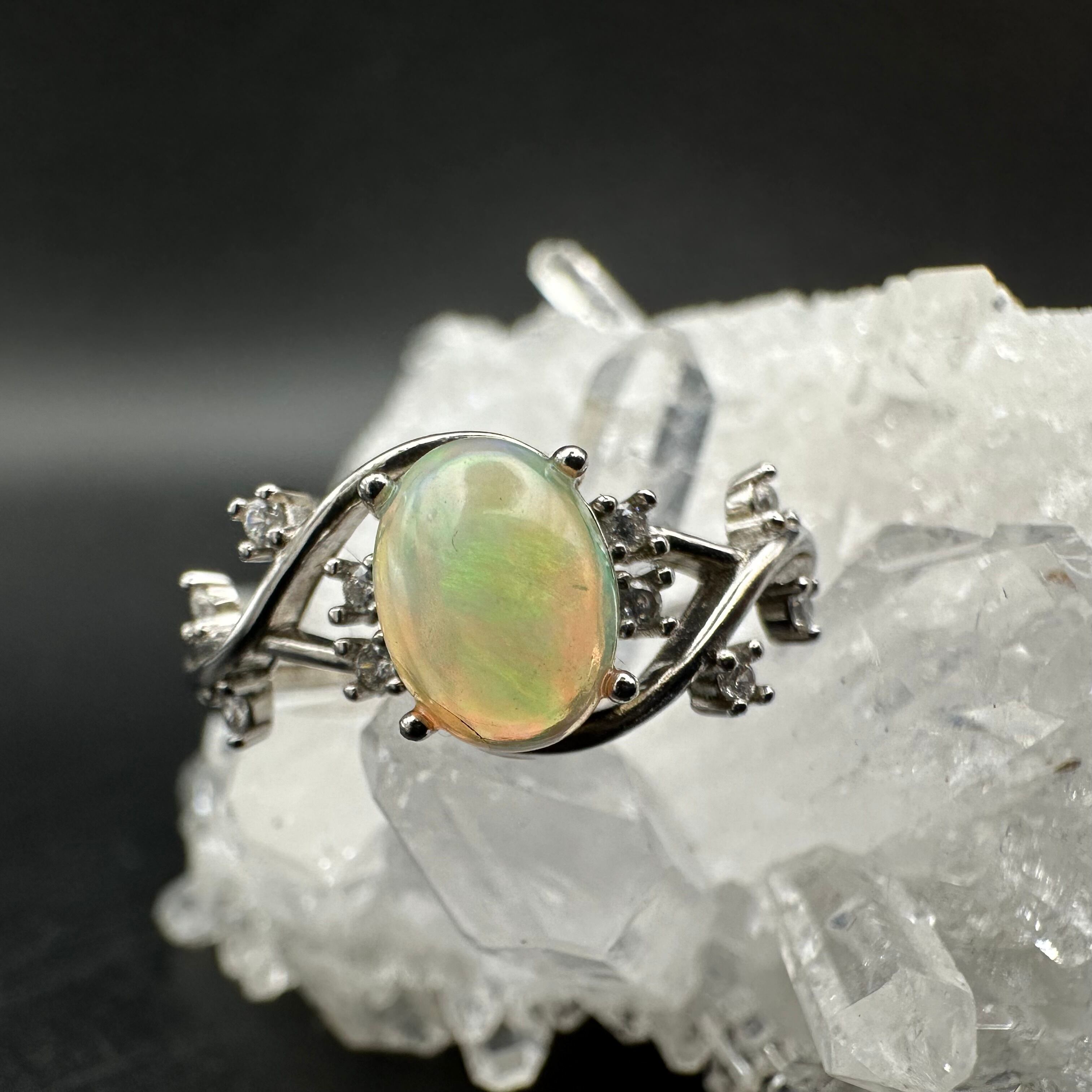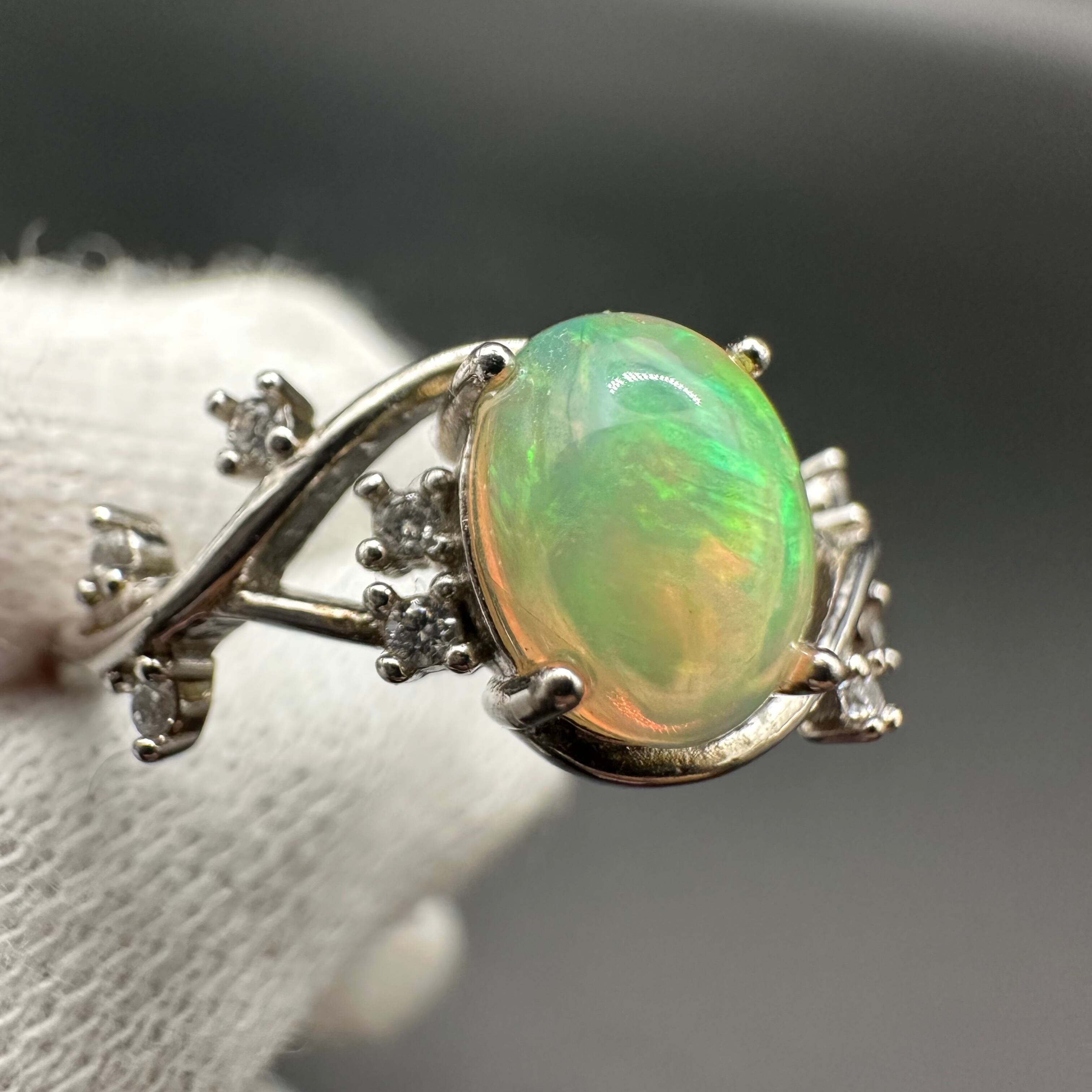 キラキラと細かく輝くものすごく美しいエチオピア産のプレシャスオパールをお花の様に仕立てた素敵なリングです。