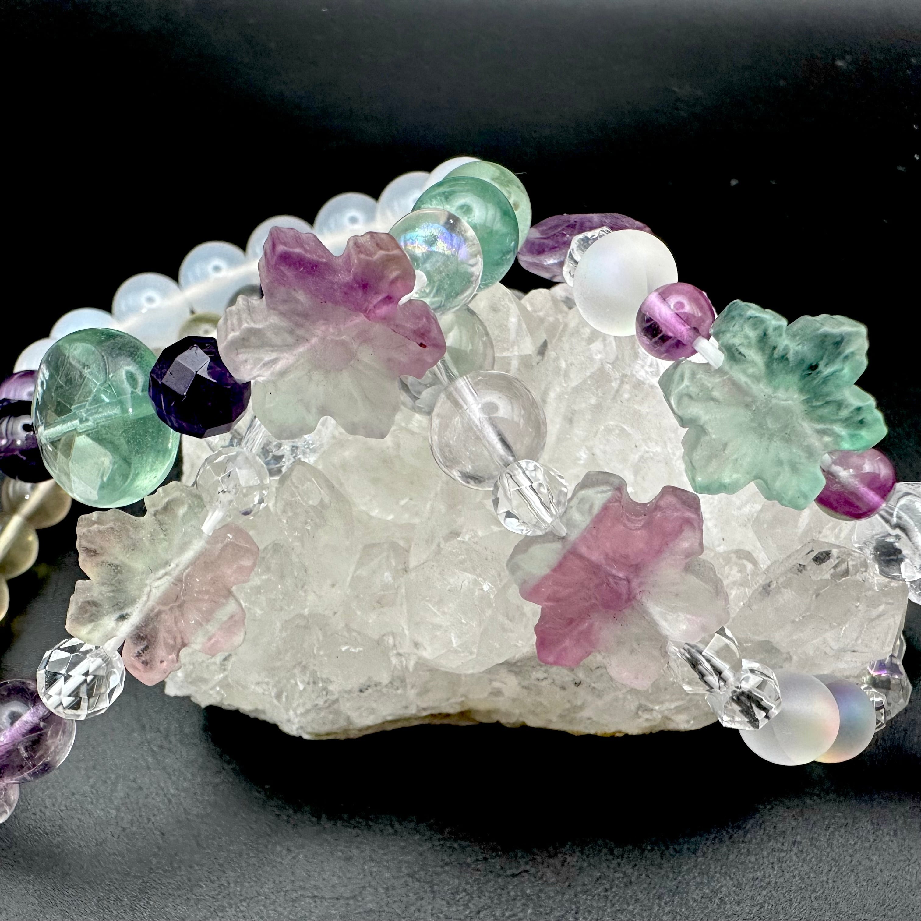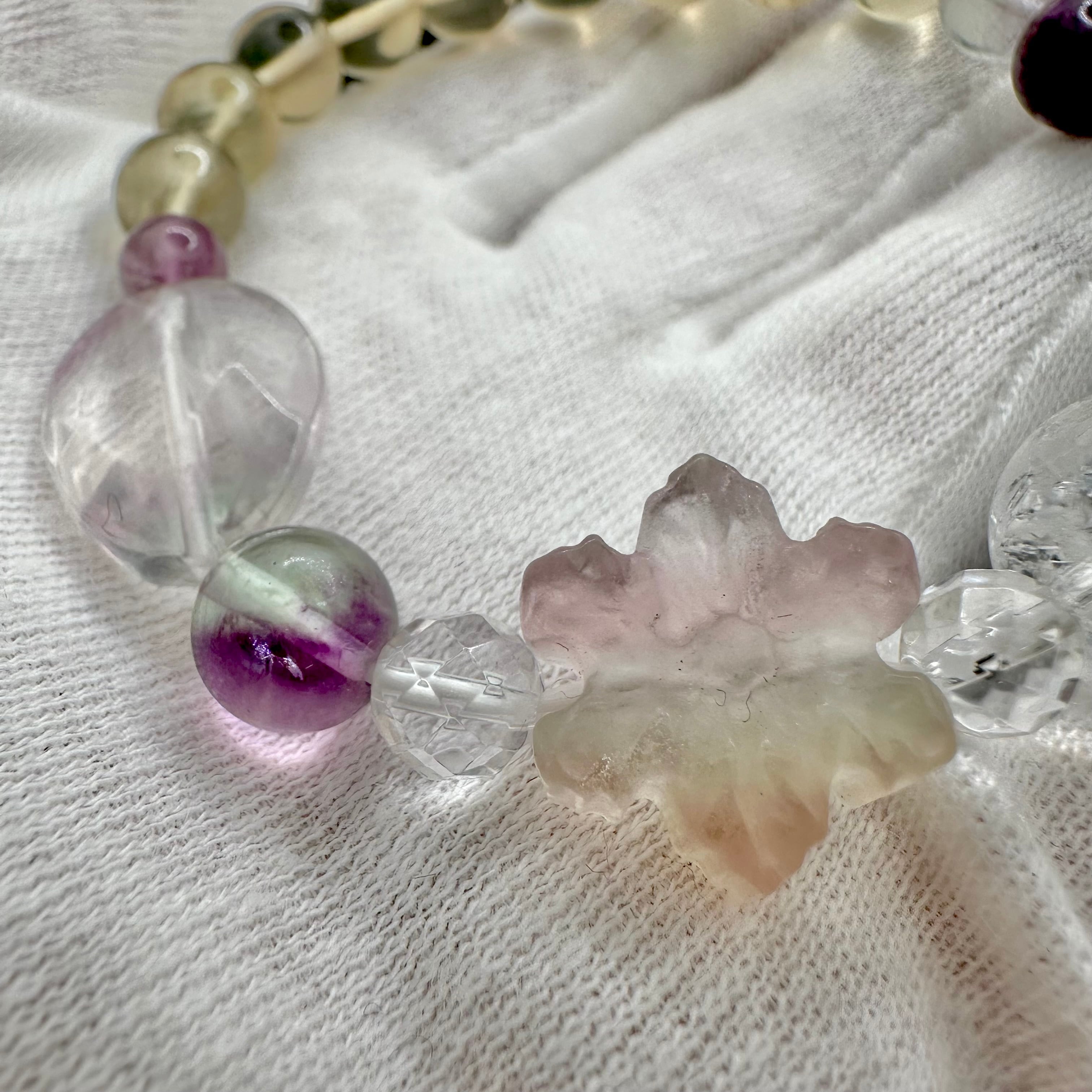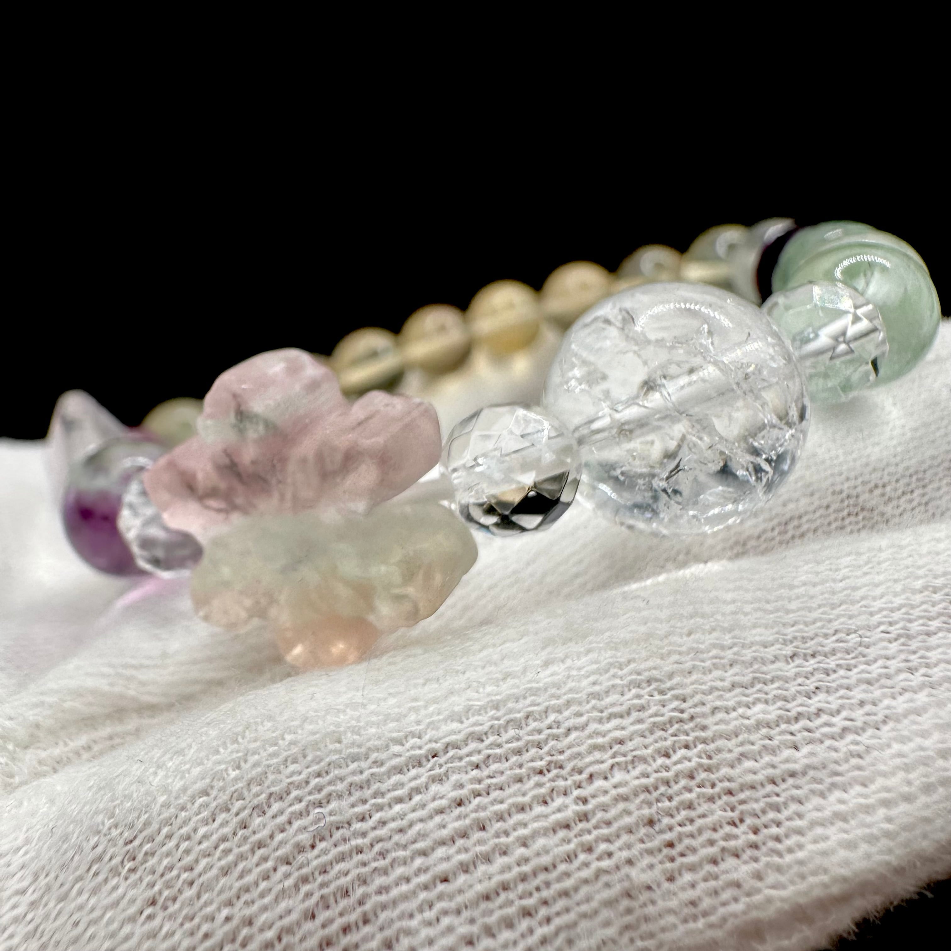 まるで砂糖菓子のような雪の結晶に模られたフローライトをトップにそれぞれのスノーフレークフローライトに合う天然石を選びブレスレットに仕立てました。