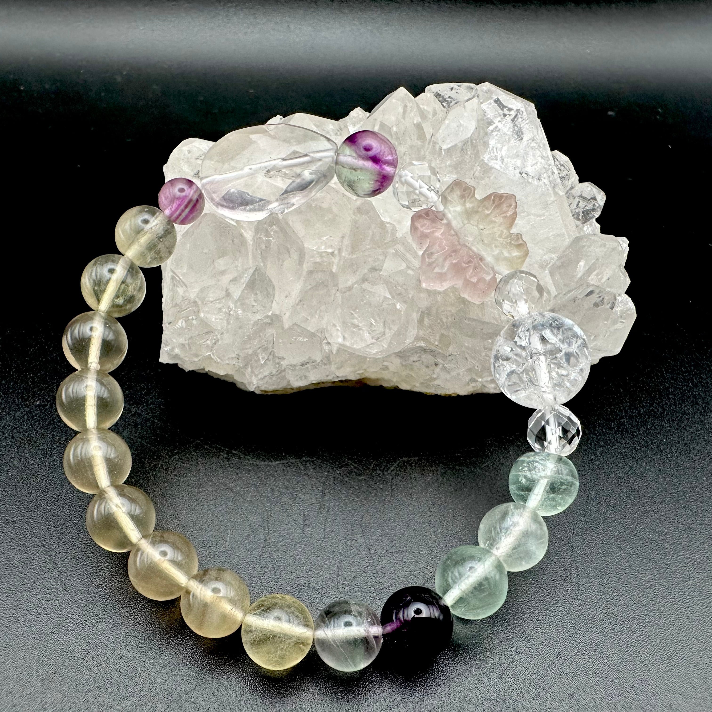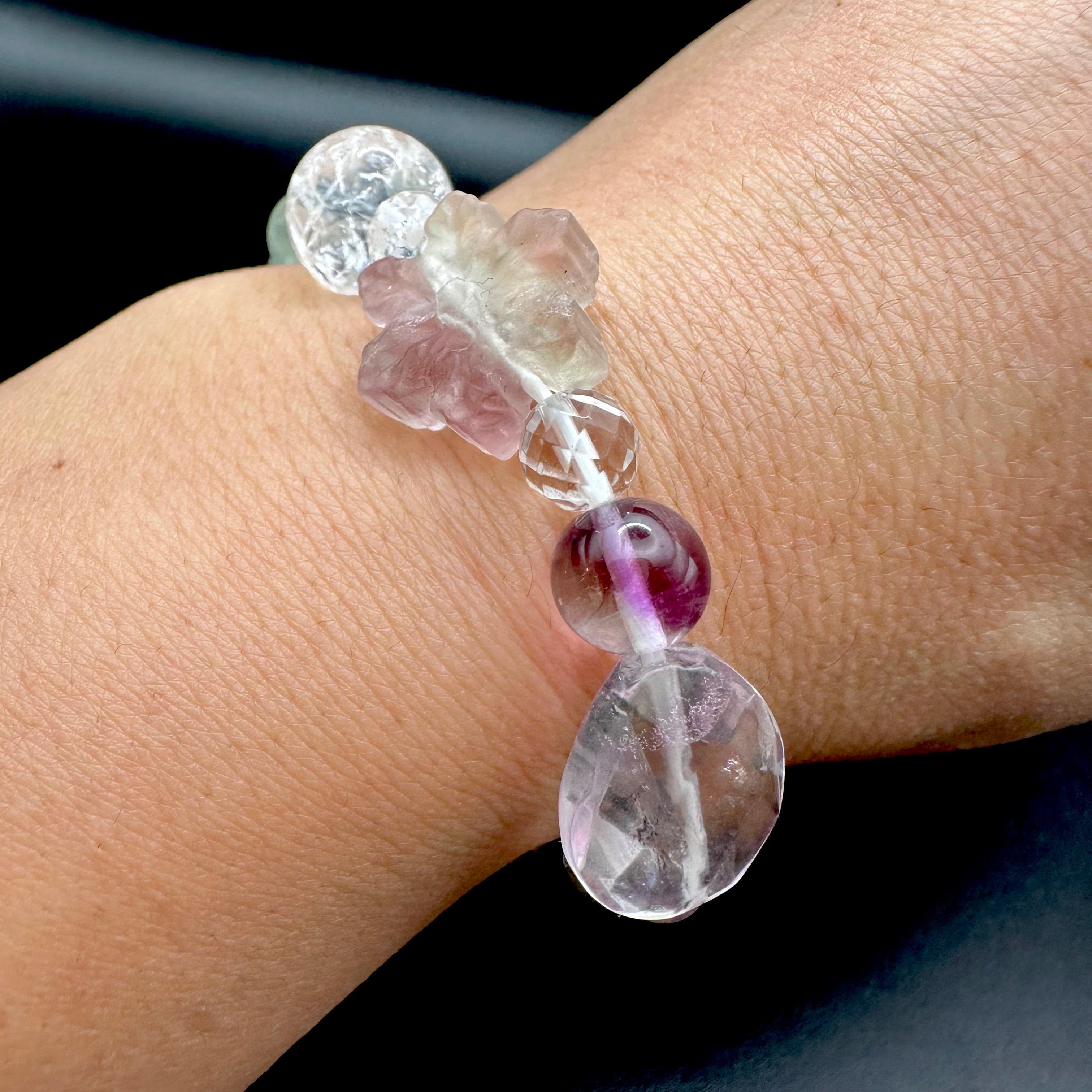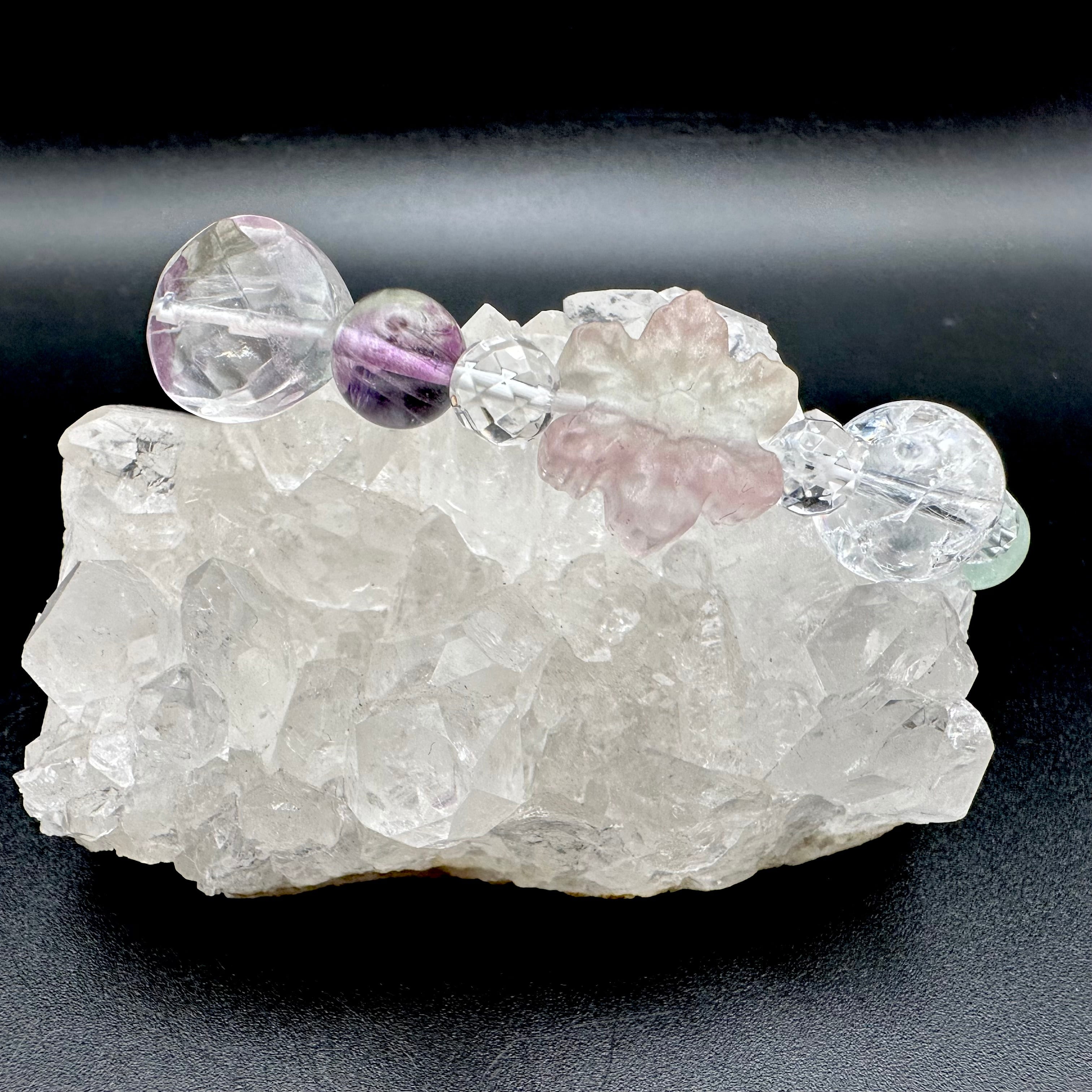 まるで砂糖菓子のような雪の結晶に模られたフローライトをトップにそれぞれのスノーフレークフローライトに合う天然石を選びブレスレットに仕立てました。