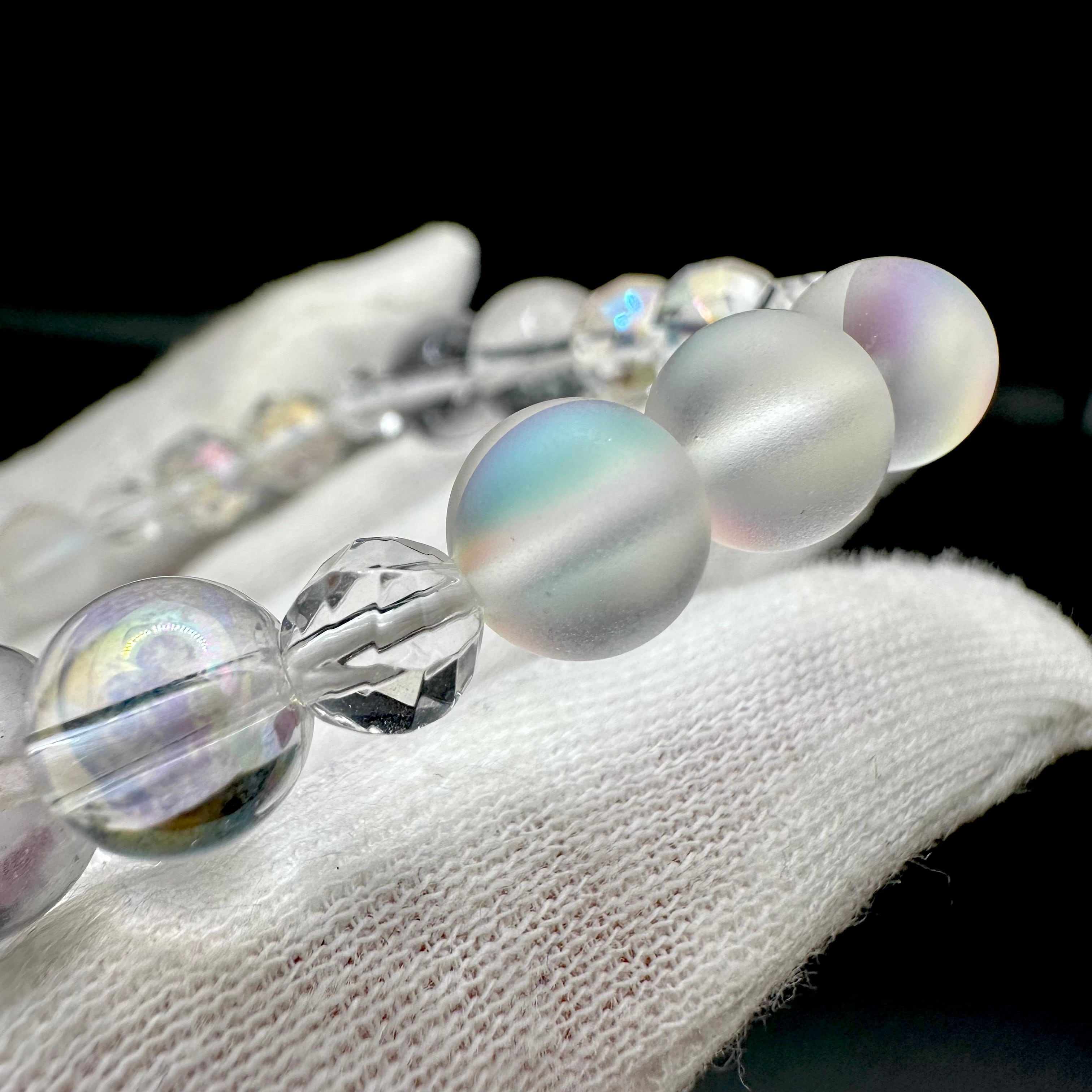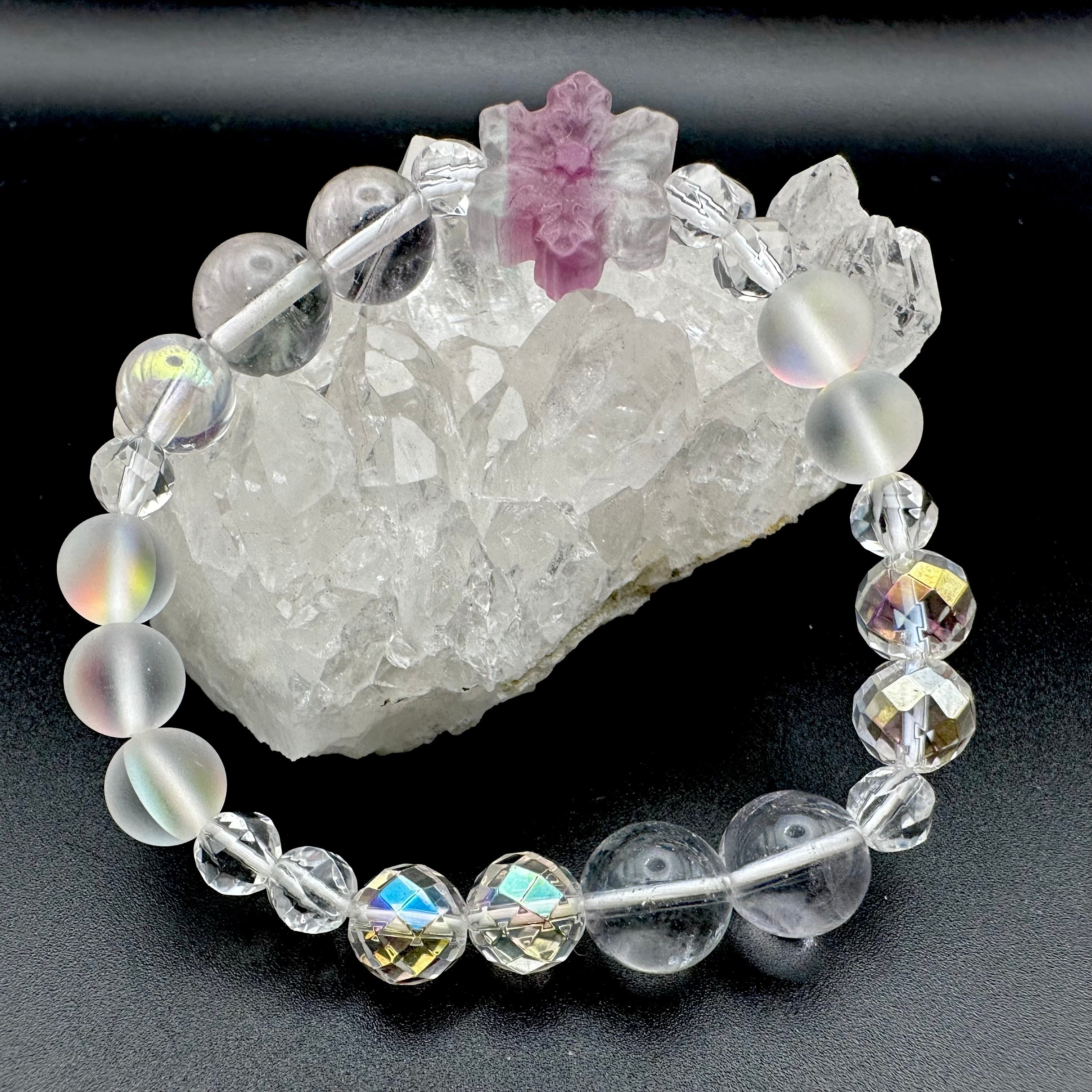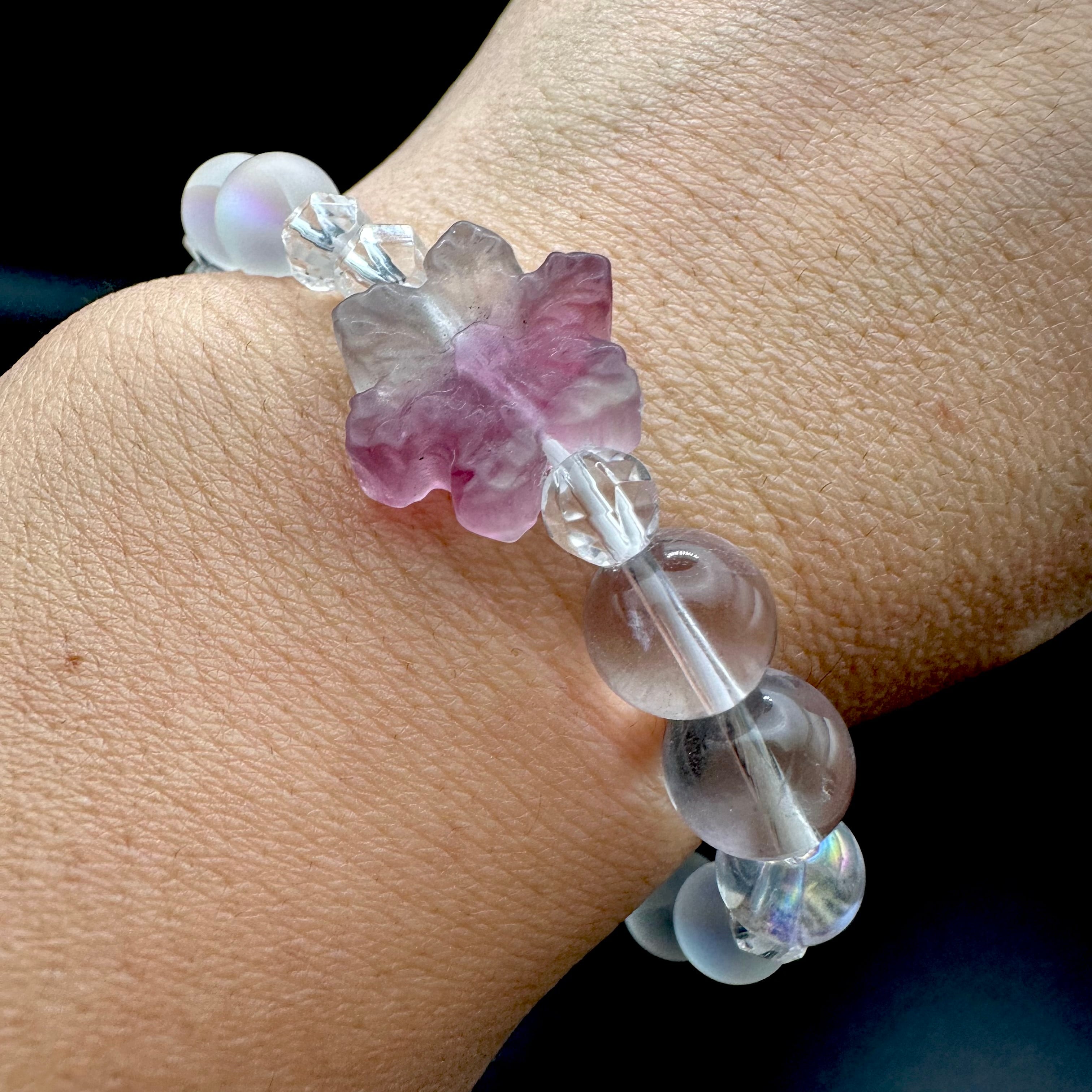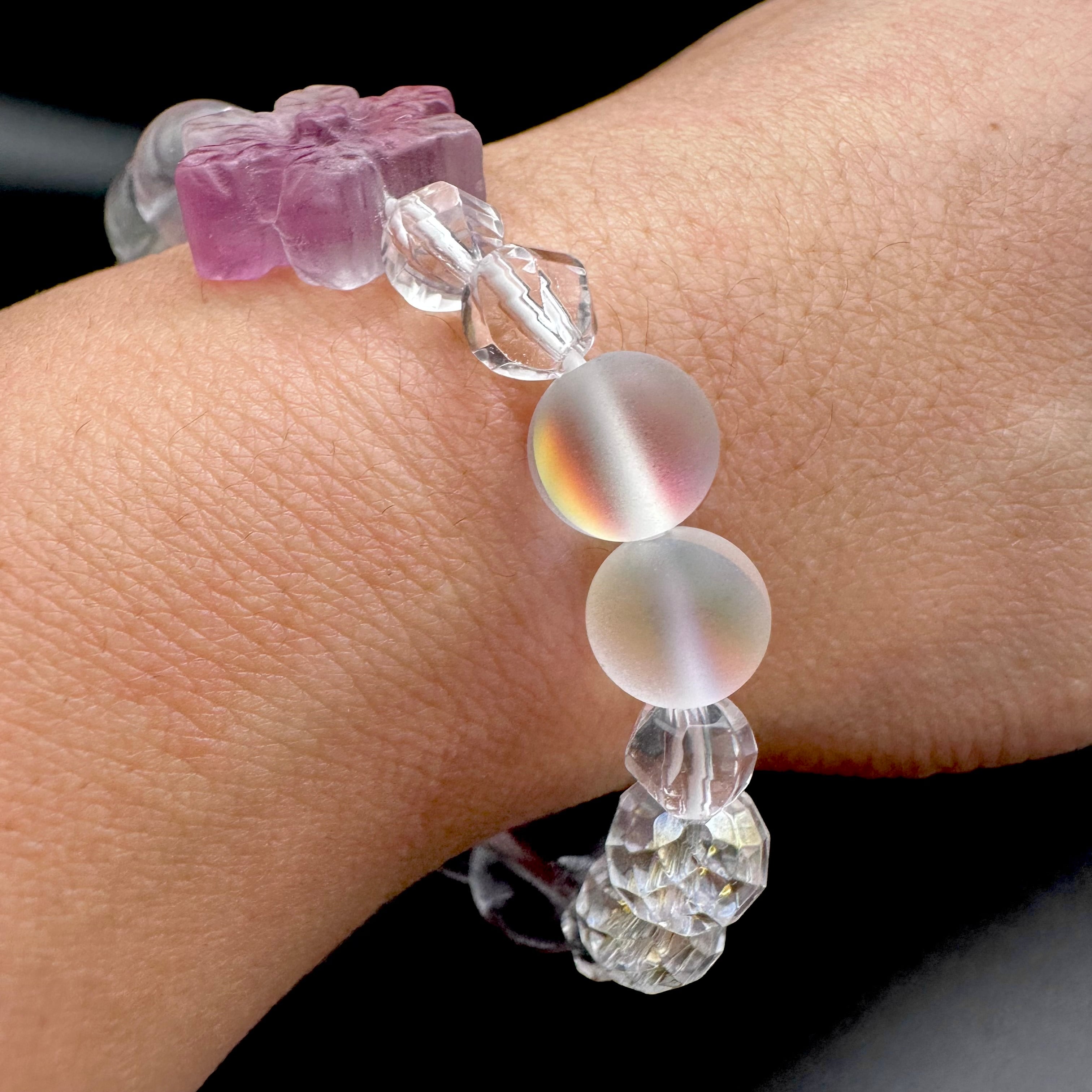 まるで砂糖菓子のような雪の結晶に模られたフローライトをトップにそれぞれのスノーフレークフローライトに合う天然石を選びブレスレットに仕立てました。