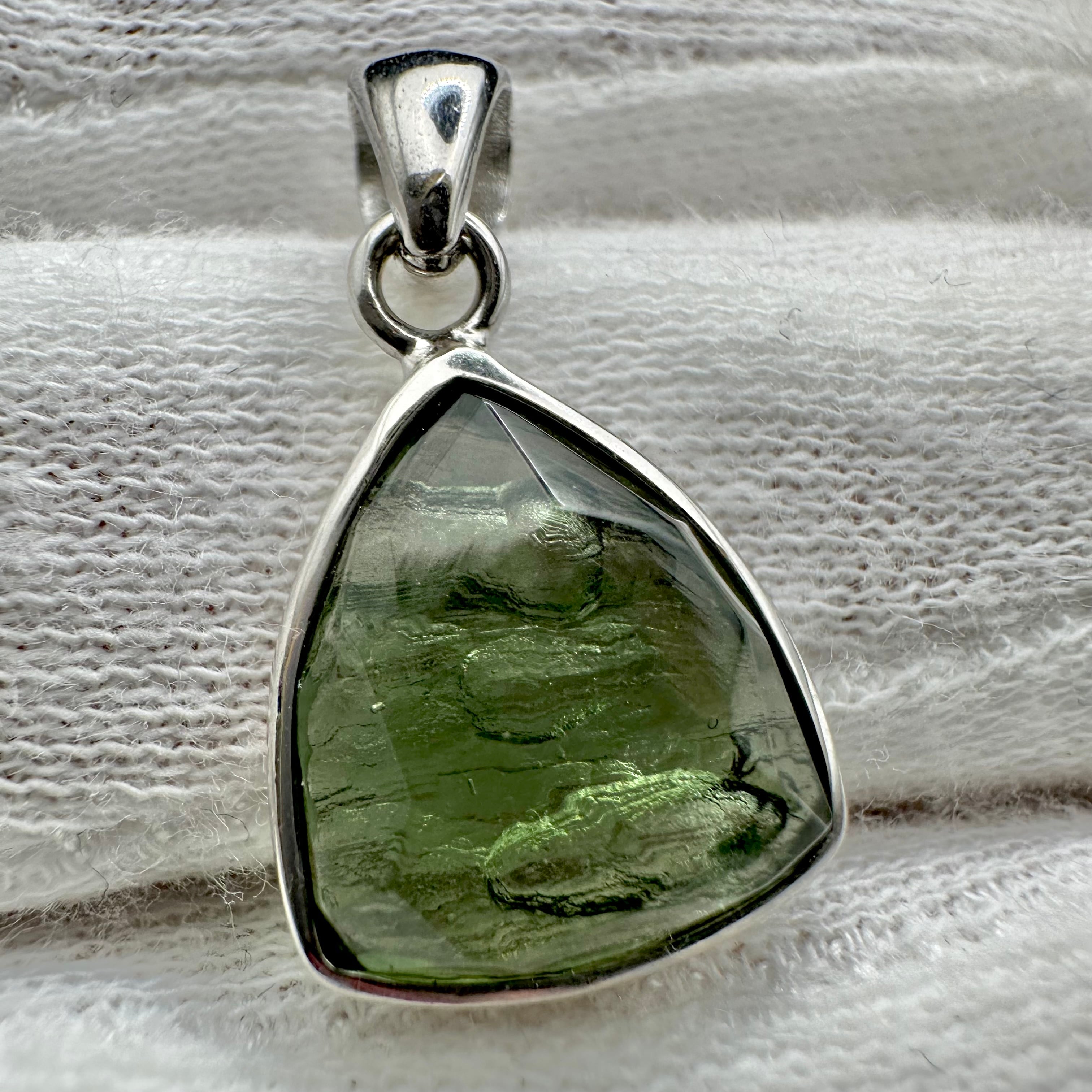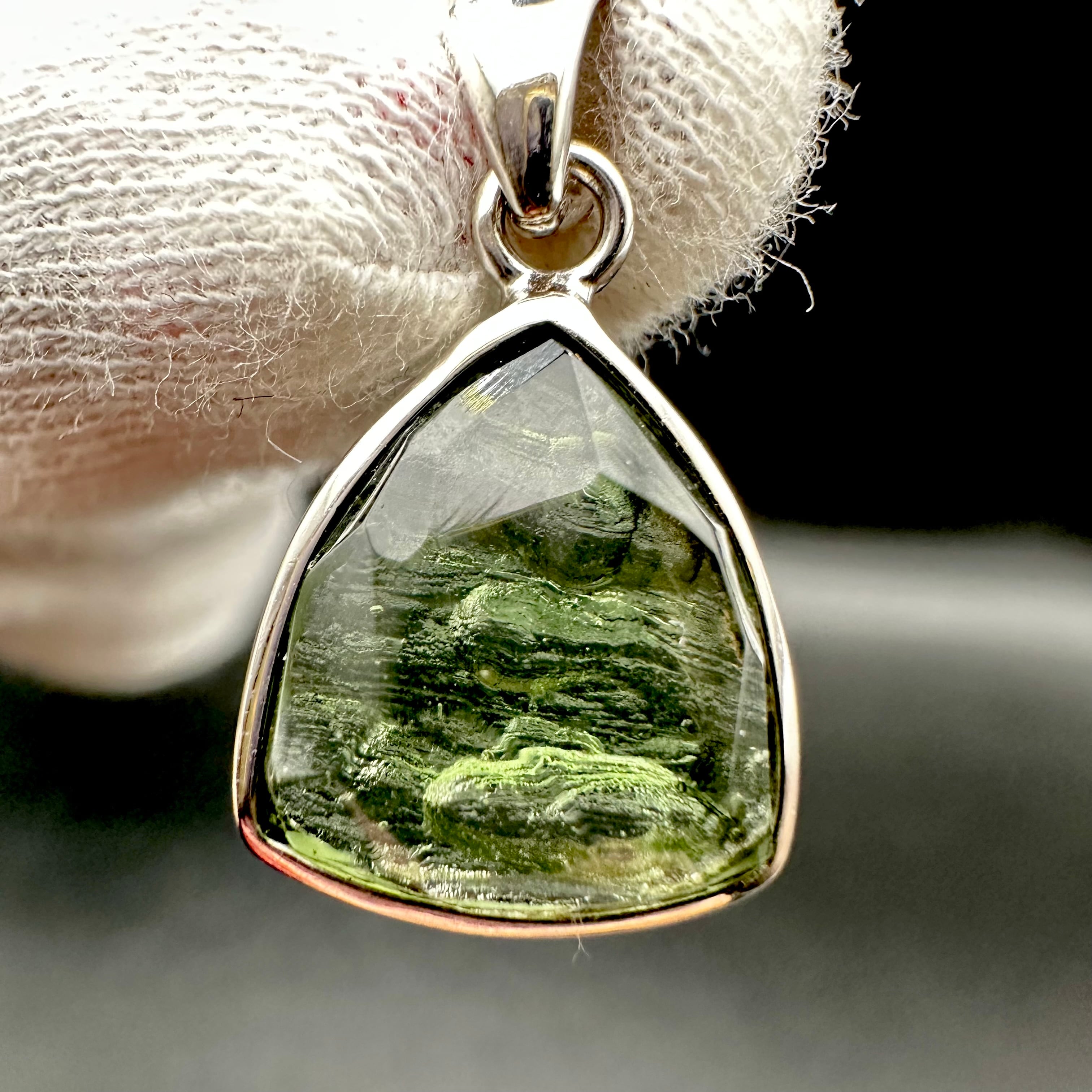 こちらのペンダントトップは裏面は磨いていないためモルダバイト特有のアボカドの様なゴツゴツとした肌や内部に細かい気泡や龍紋のモルダバイト特有の模様が見られ独特な個性も楽しめます。