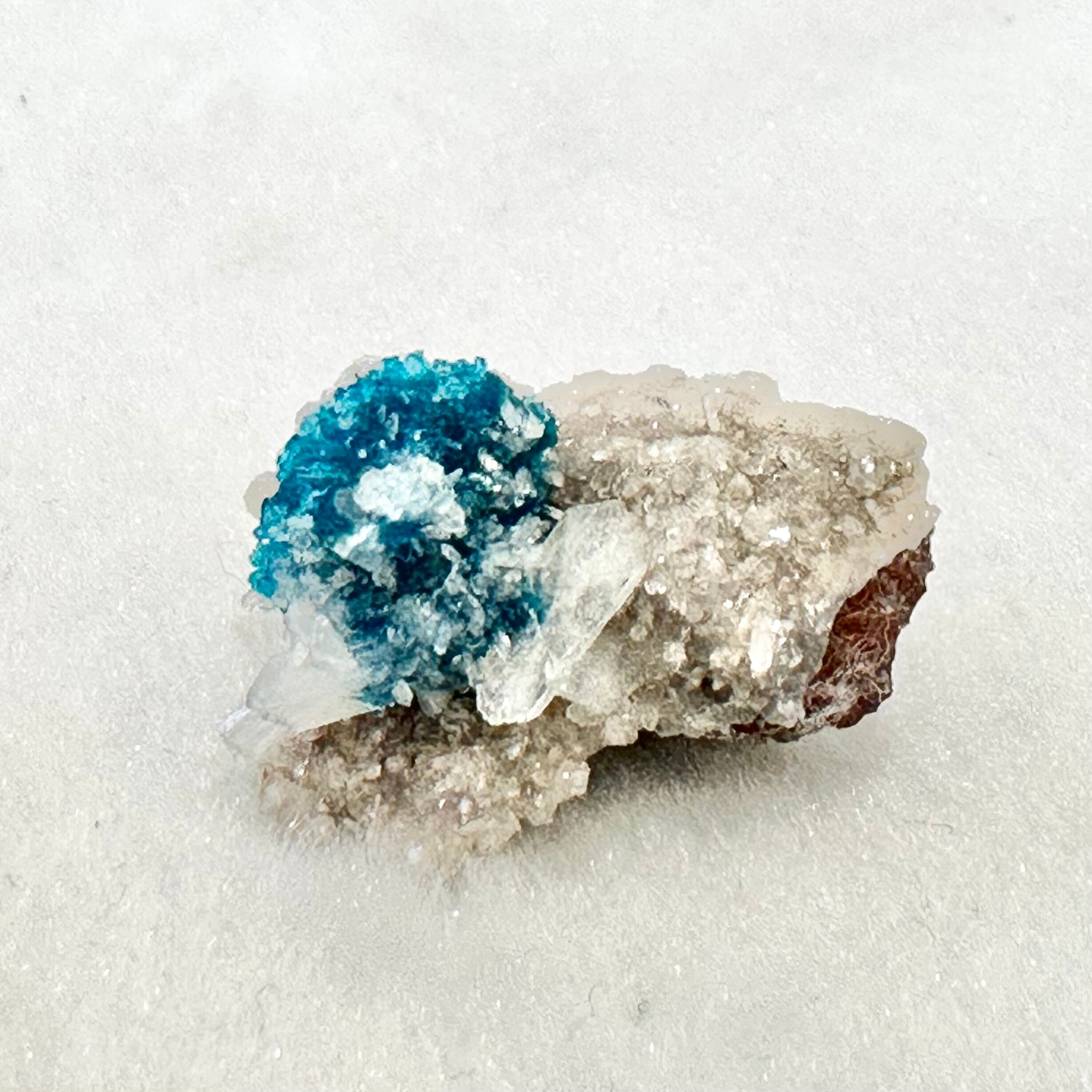 マリモのようなコロンとした形に形成したカバンサイトがドゥルージー化したクォーツの上に乗っかった、すごく可愛くキレイな個体です。カバンサイトの反面には雲母が共生しておりブルーグリーンのカバンサイトにザラメを付けたようなキラキラ感と雲母の独特の艶感が楽しめる結晶もくっついています。