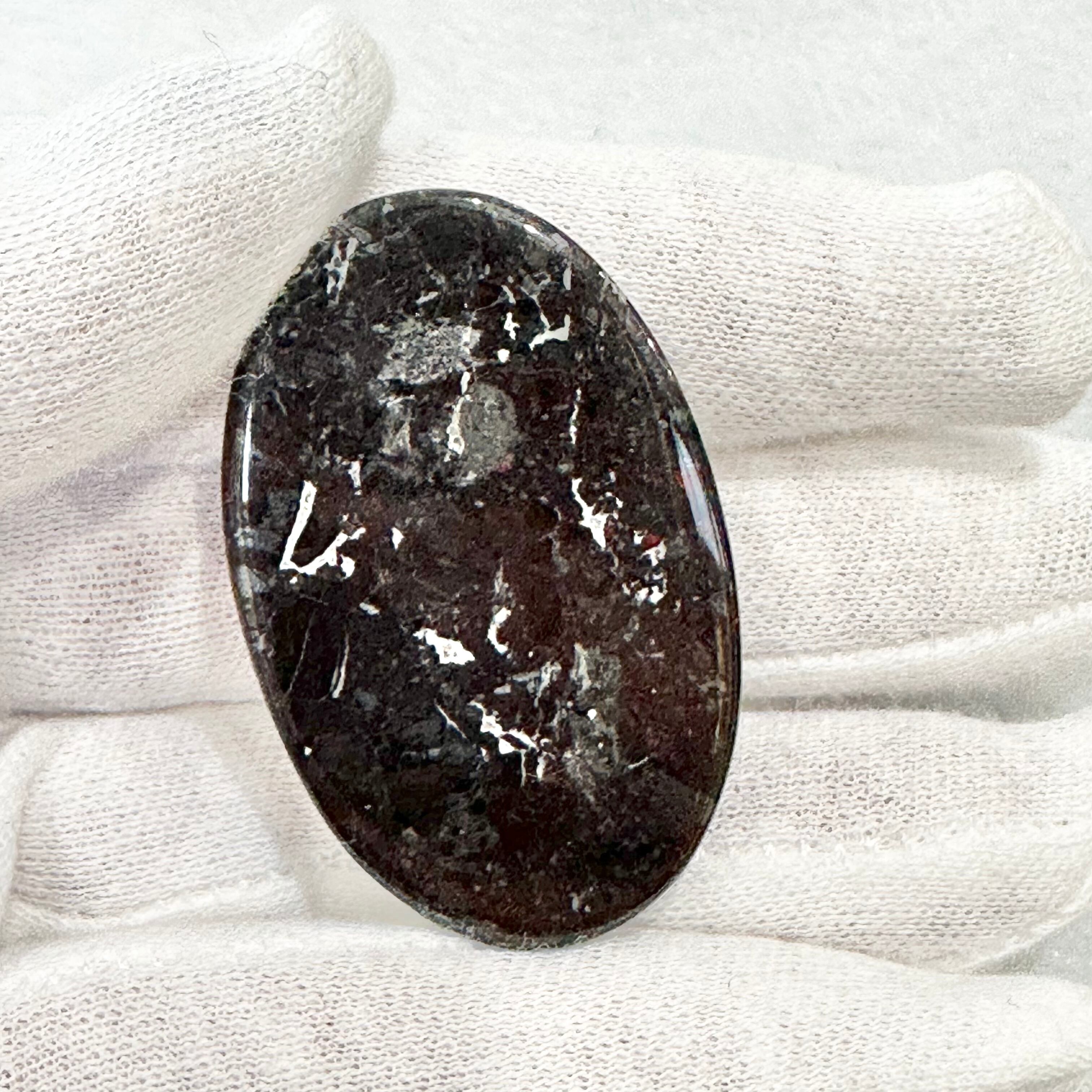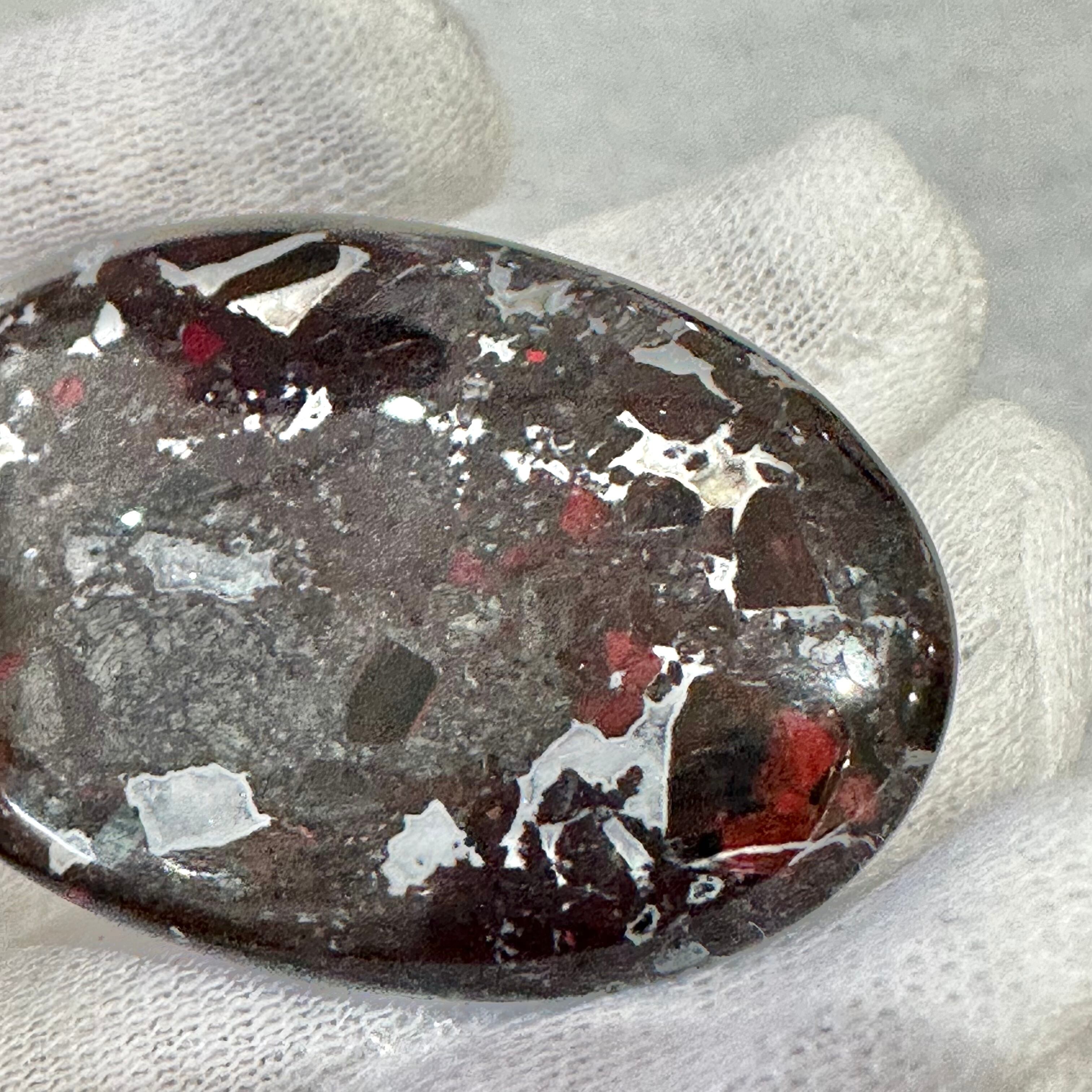 金属的な光沢を持つベースに赤やシリカ(?)の様な白が入ったかなり珍しいジャスパーのルースです。
