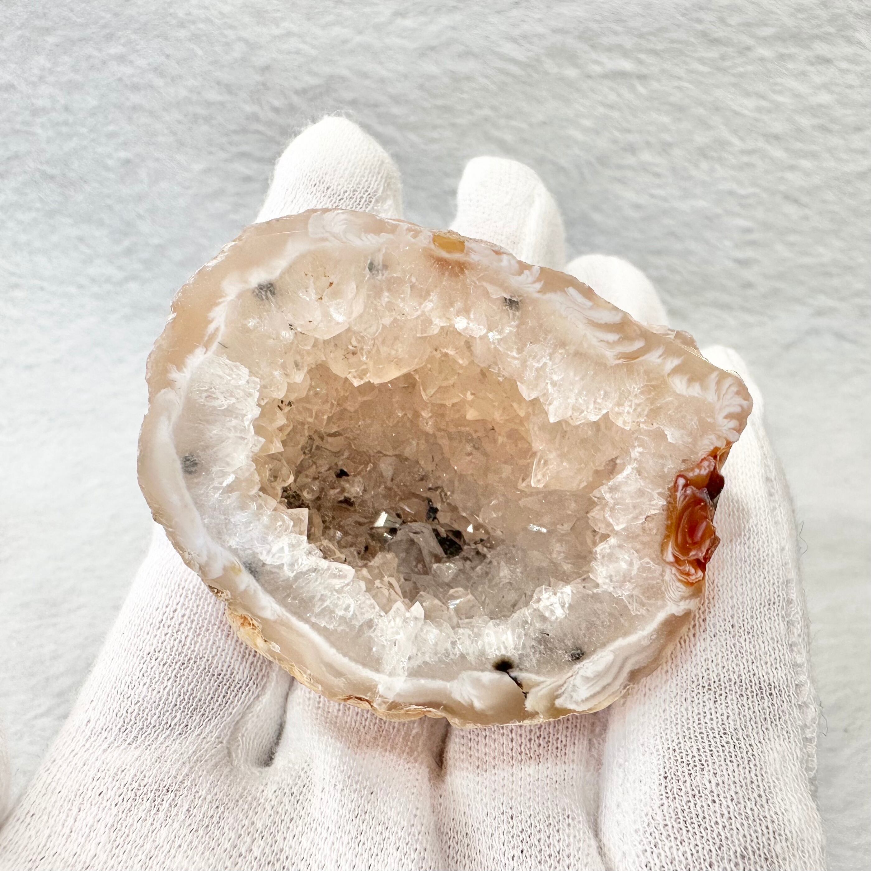その水晶を守るように囲むのが樹木の様にも、雪や霜柱に見える美しい模様が印象的なアゲートです。