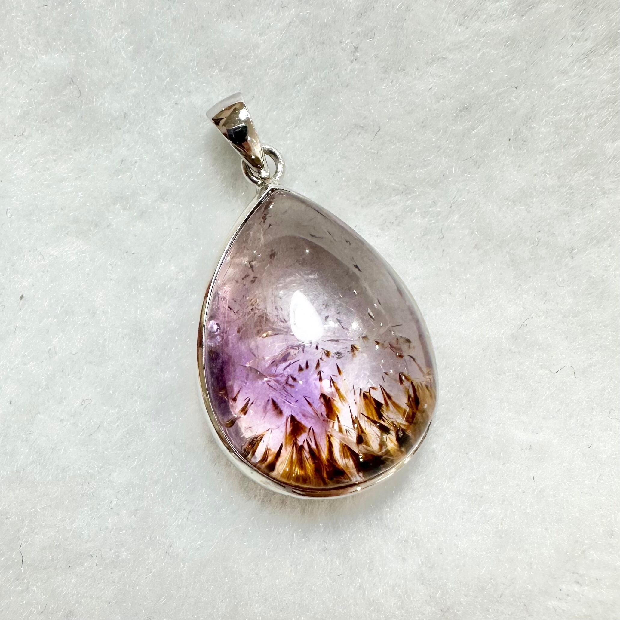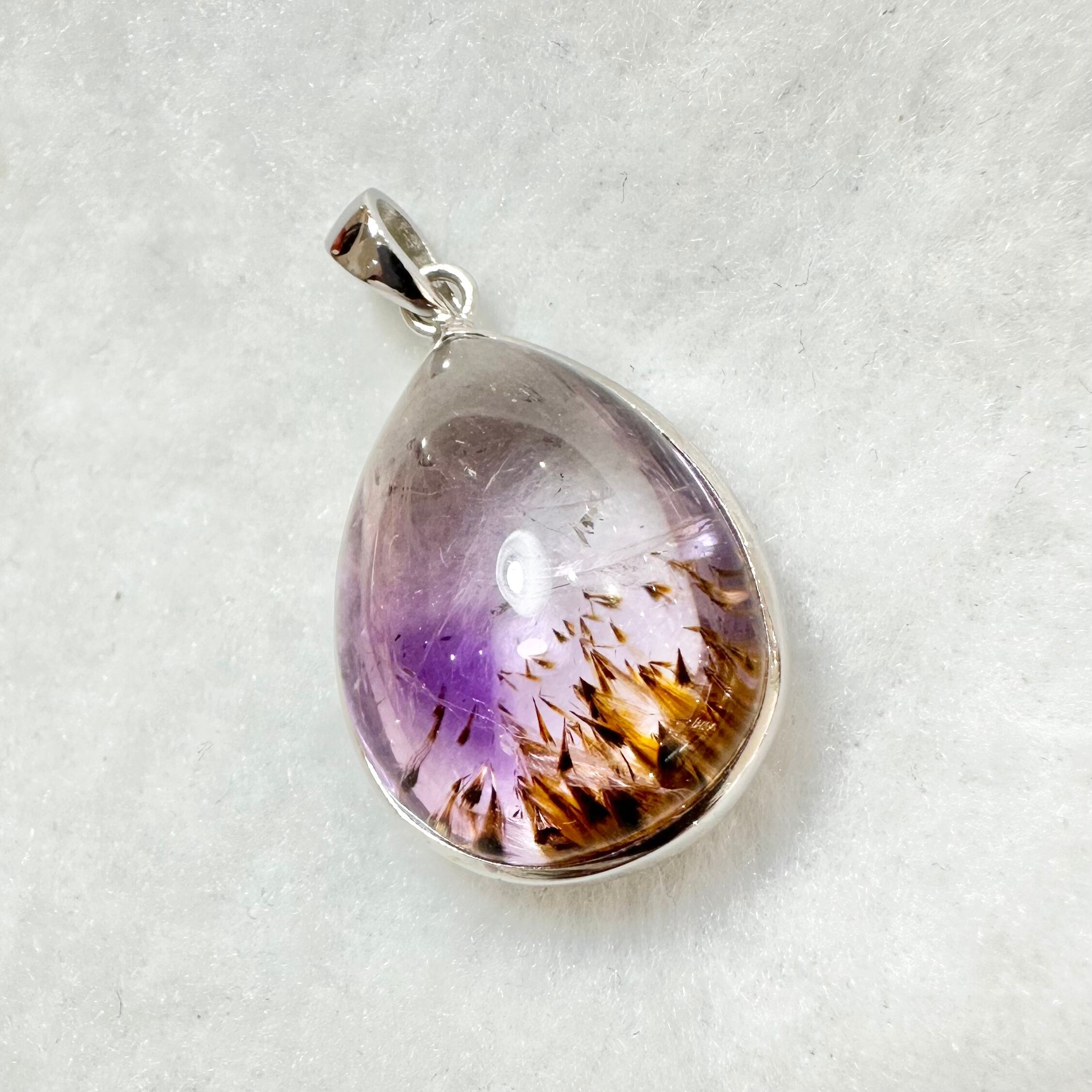 アメシストの部分も紫に濃淡があり、そこに立体的にカコクセナイトが入りとても美しいです。
