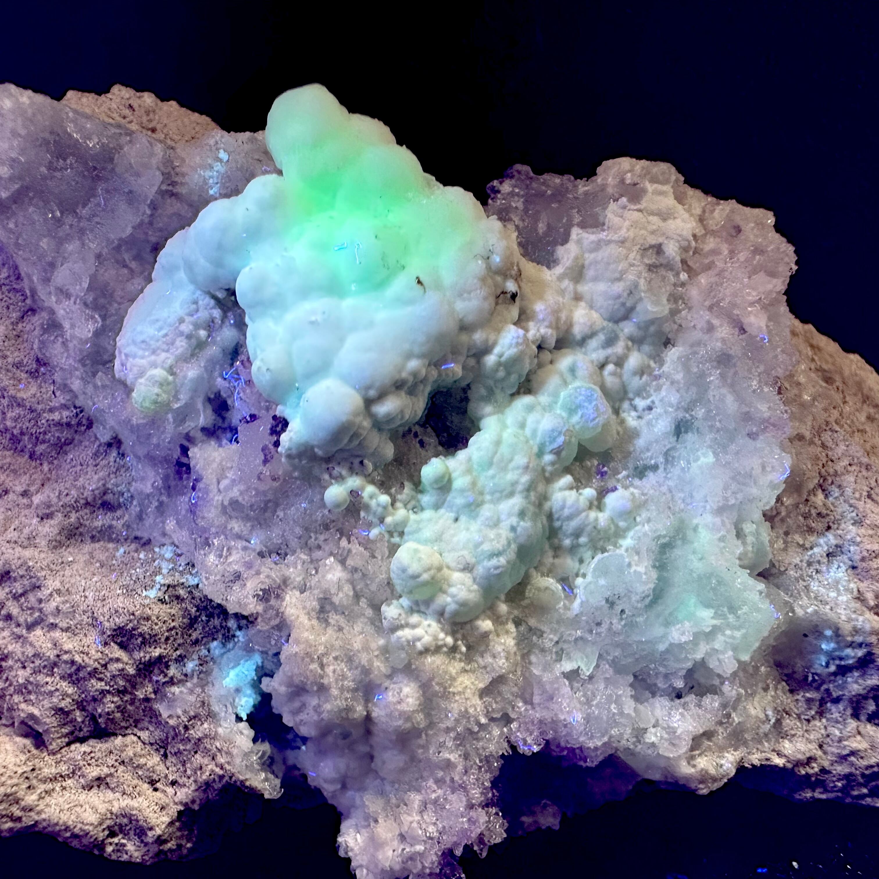 色々な所が蛍光し、UVライトを当てても面白く見どころ満載の標本です。