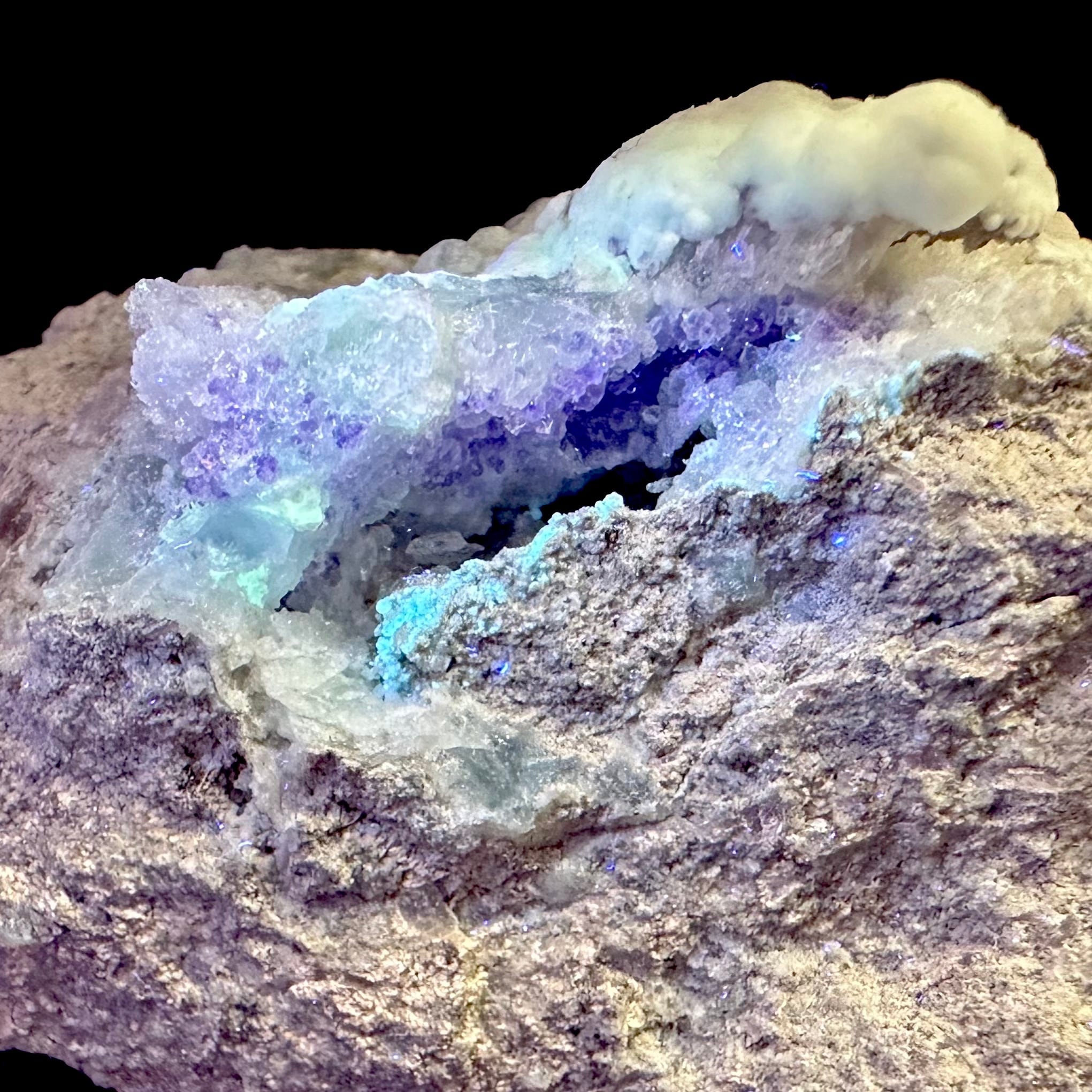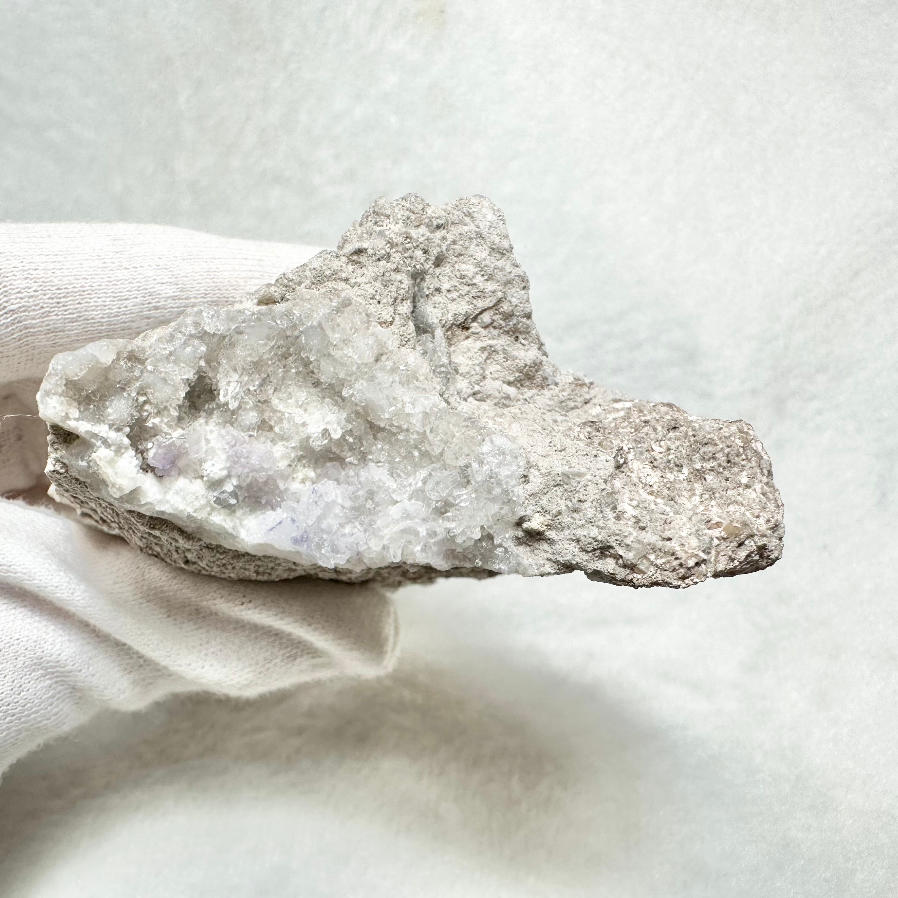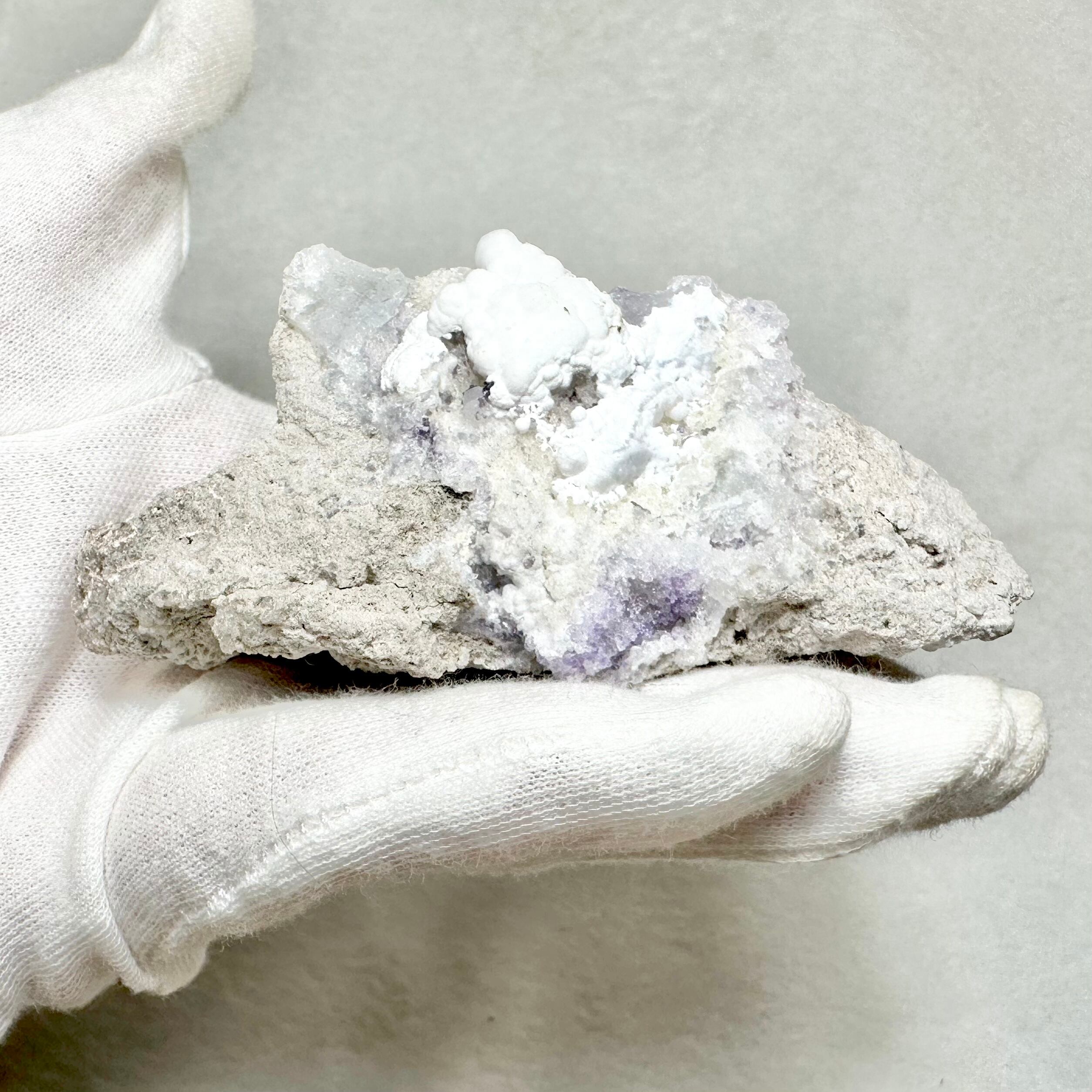 白いモコモコした所がカルセドニー、細かなパープルの結晶がフローライト、写真だと分かりにくいのですが、モコモコしたカルセドニーのしたの不透明なミルキーパープルがオパール、そして細かな透明感ある結晶がクォーツです。