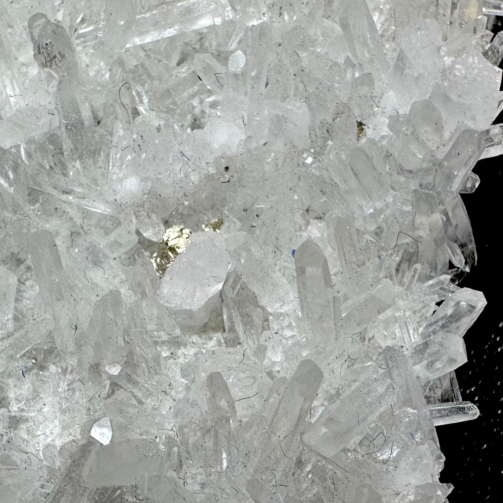 透明感がある細かな水晶の上に金色に輝く四角いパイライトが乗っかった、なんとも面白い原石です。