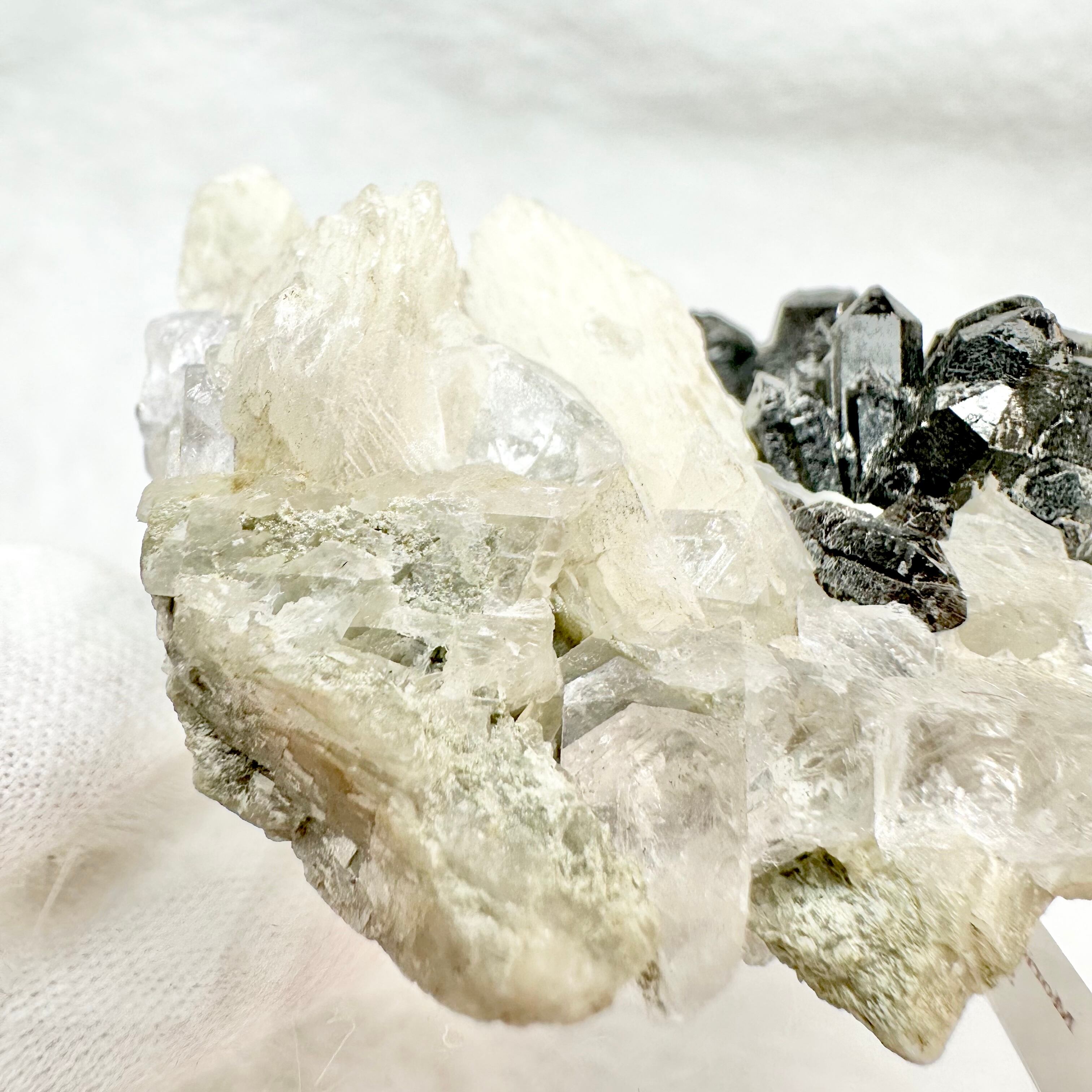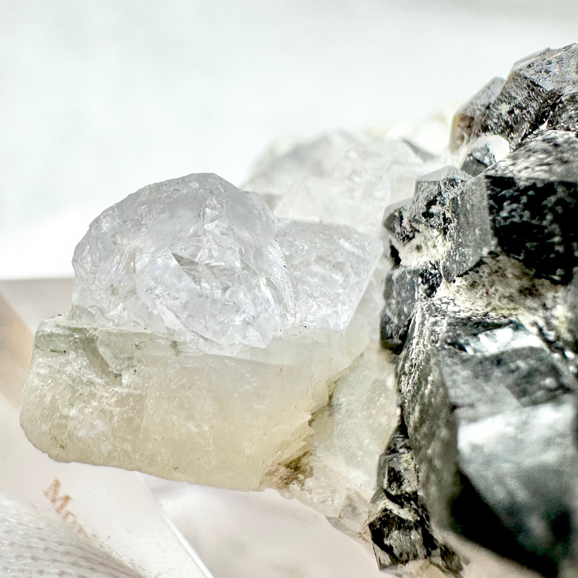 通常モリオン黒水晶は照射処理をして黒くしていることが多いですが、こちらはナチュラルでクリアに近い淡いブルーのフローライトとカルサイトというと3つの鉱物が共生しています。
