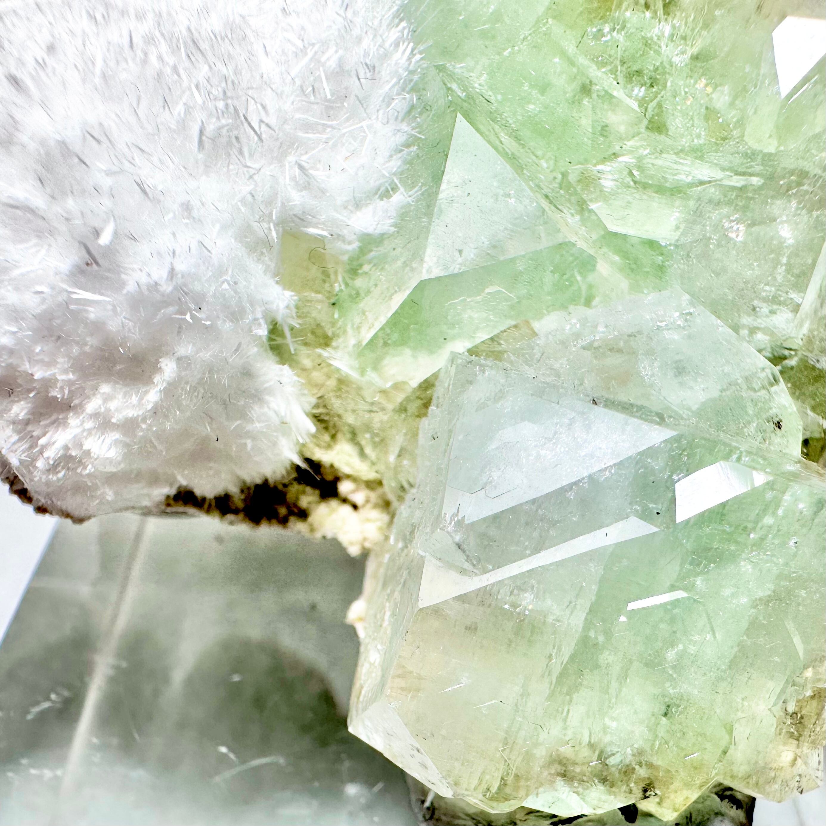 ふわふわ、モコモコのモルデナイトと美しく優しいグリーンのアポフィライトの組み合わせが芸術的な標本です。