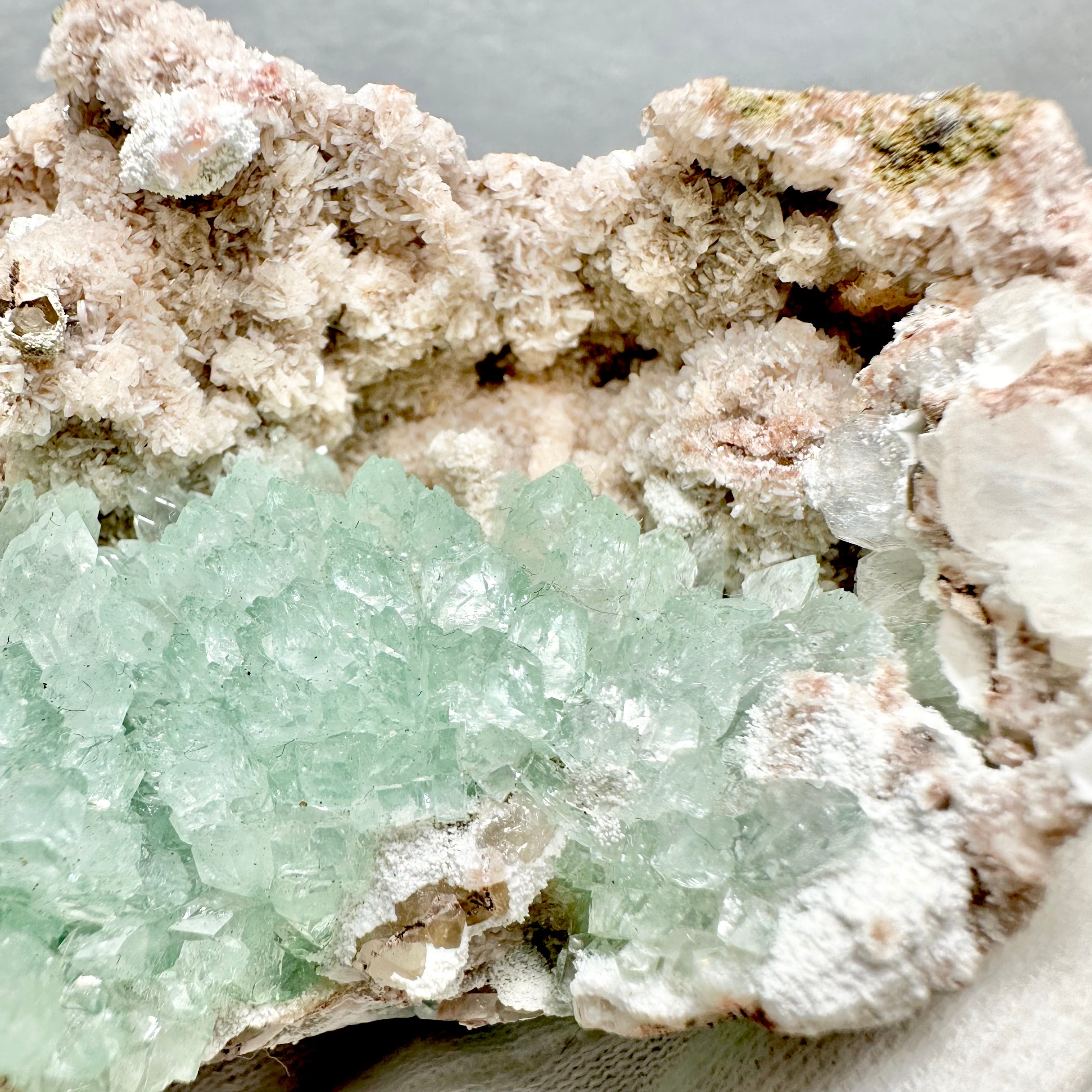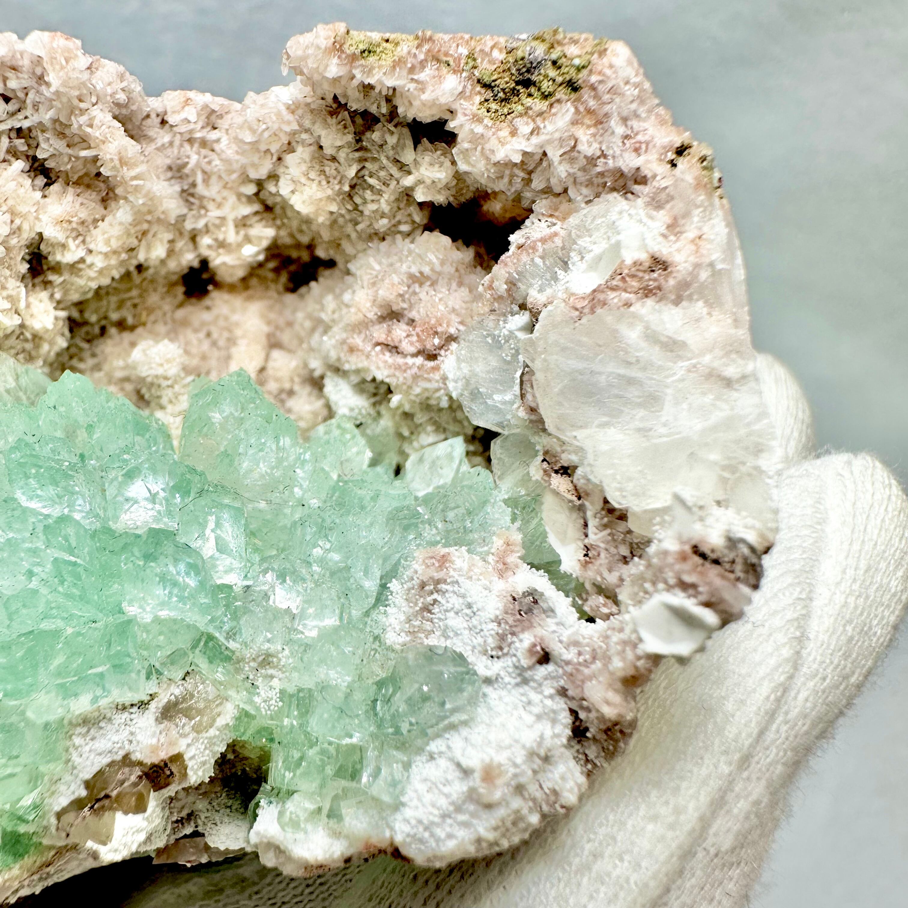 ゼオライトも共生し、アポフィライトとはまた違ったツヤ感と輝きを見せてくれます。