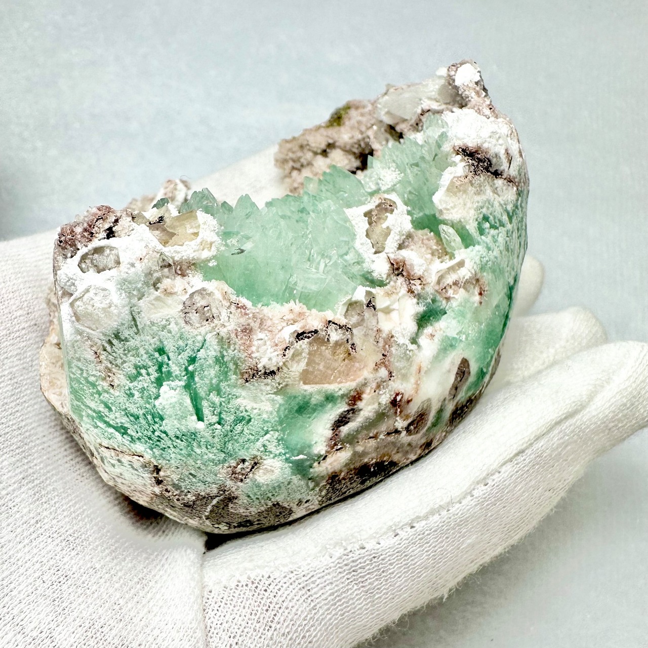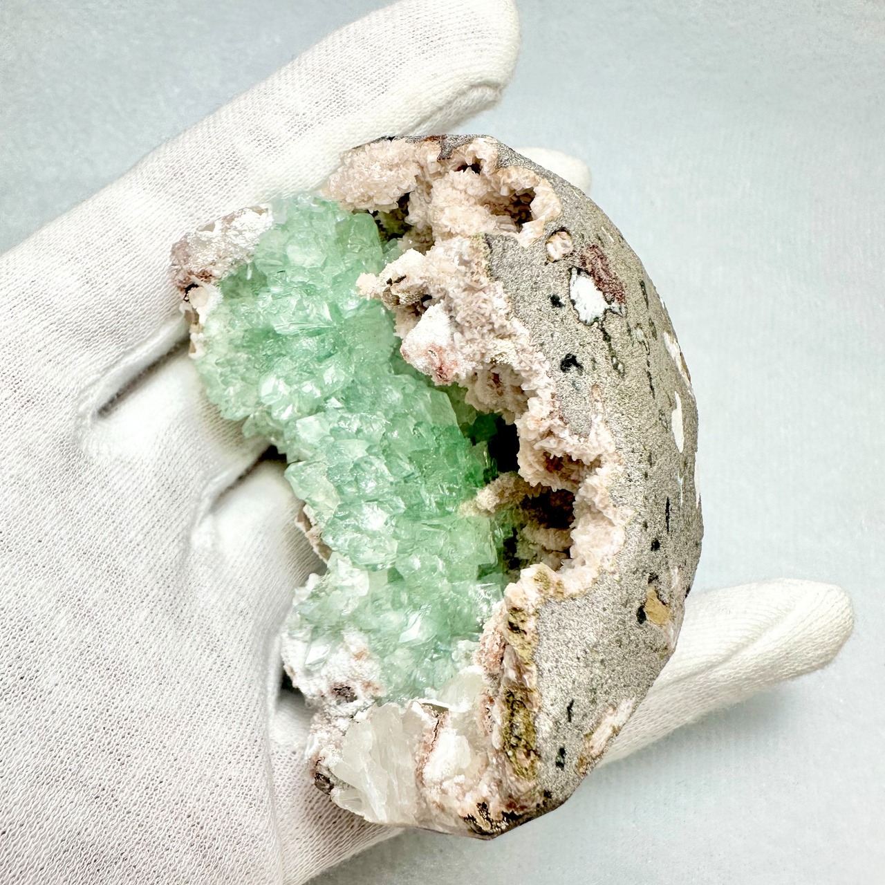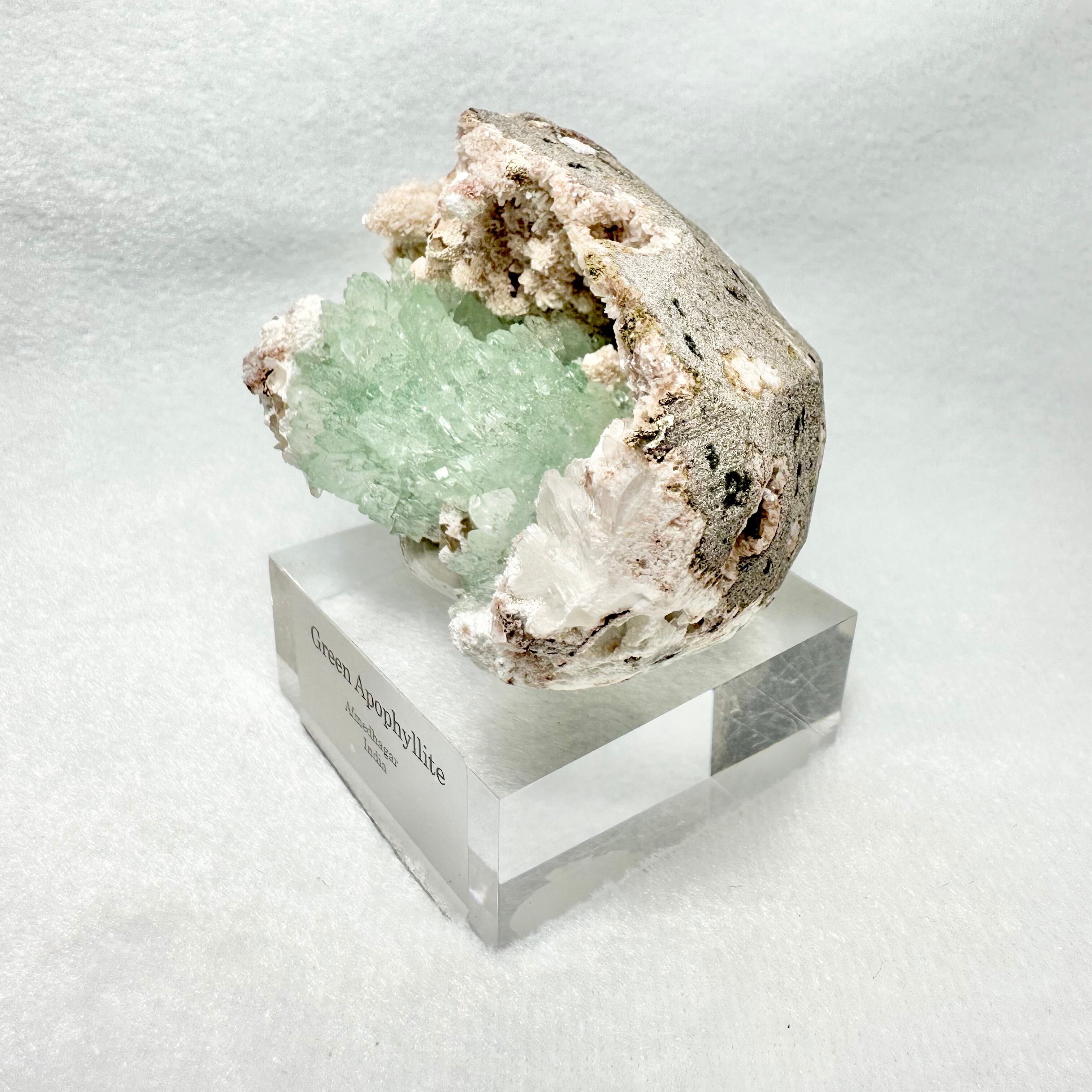 コロンとしたドーム型の下半分に美しいグリーンのアポフィライトがたっぷりと詰め込まれたような雰囲気です。