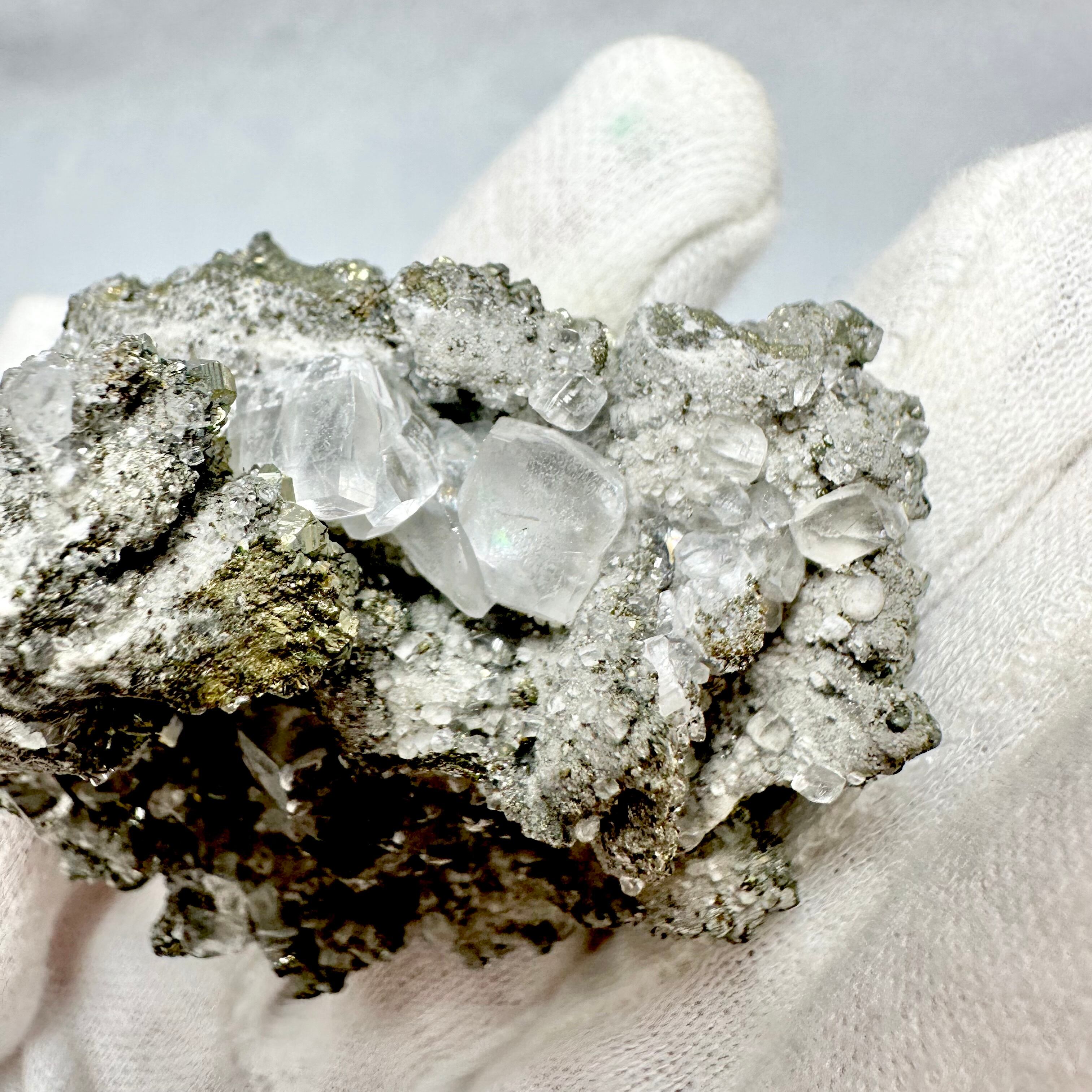 よく見ると虹色に輝く部分もあったり、裏面にはアポフィライトと水晶が共生していたりと見所も盛りだくさんです。