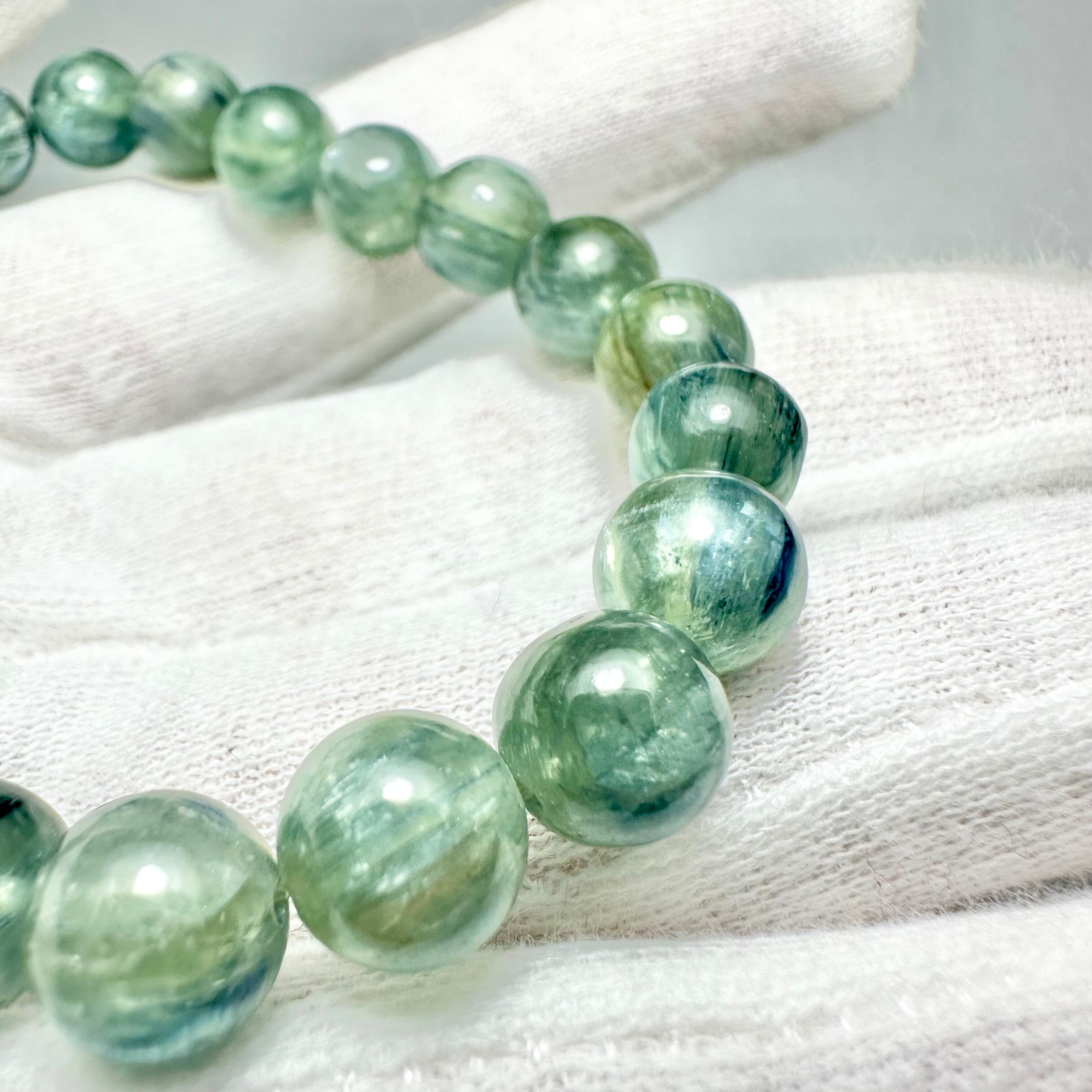 玉によってブルーとグリーンが入っていたり、若葉色のグリーンだったりどの玉もすごくキレイです。