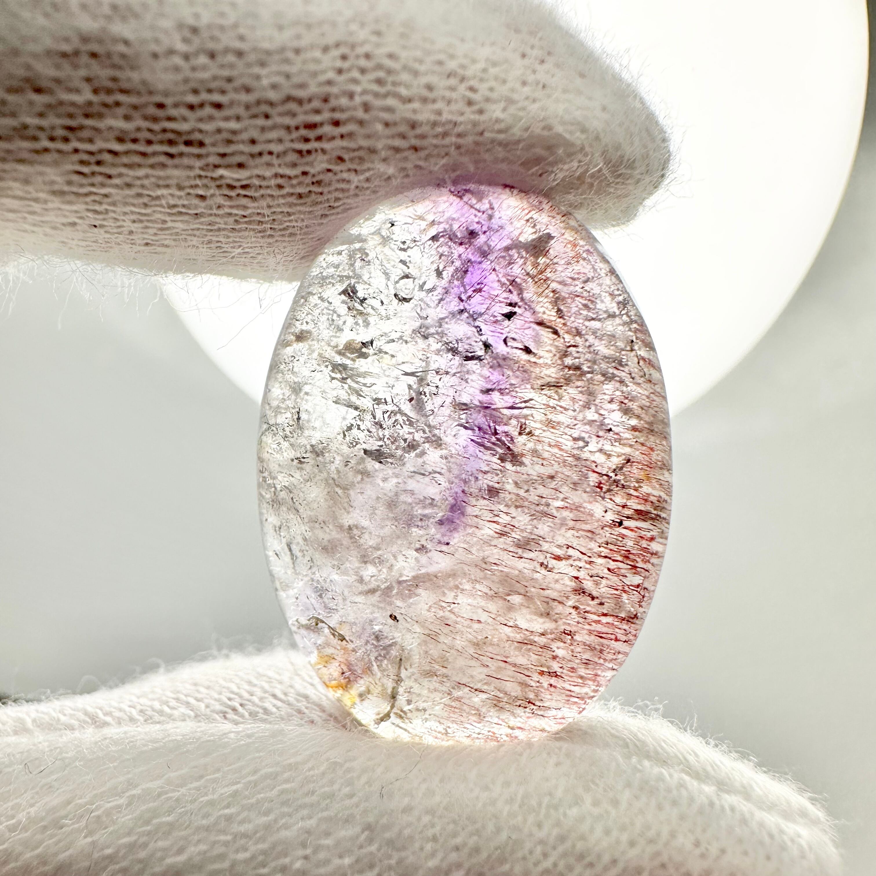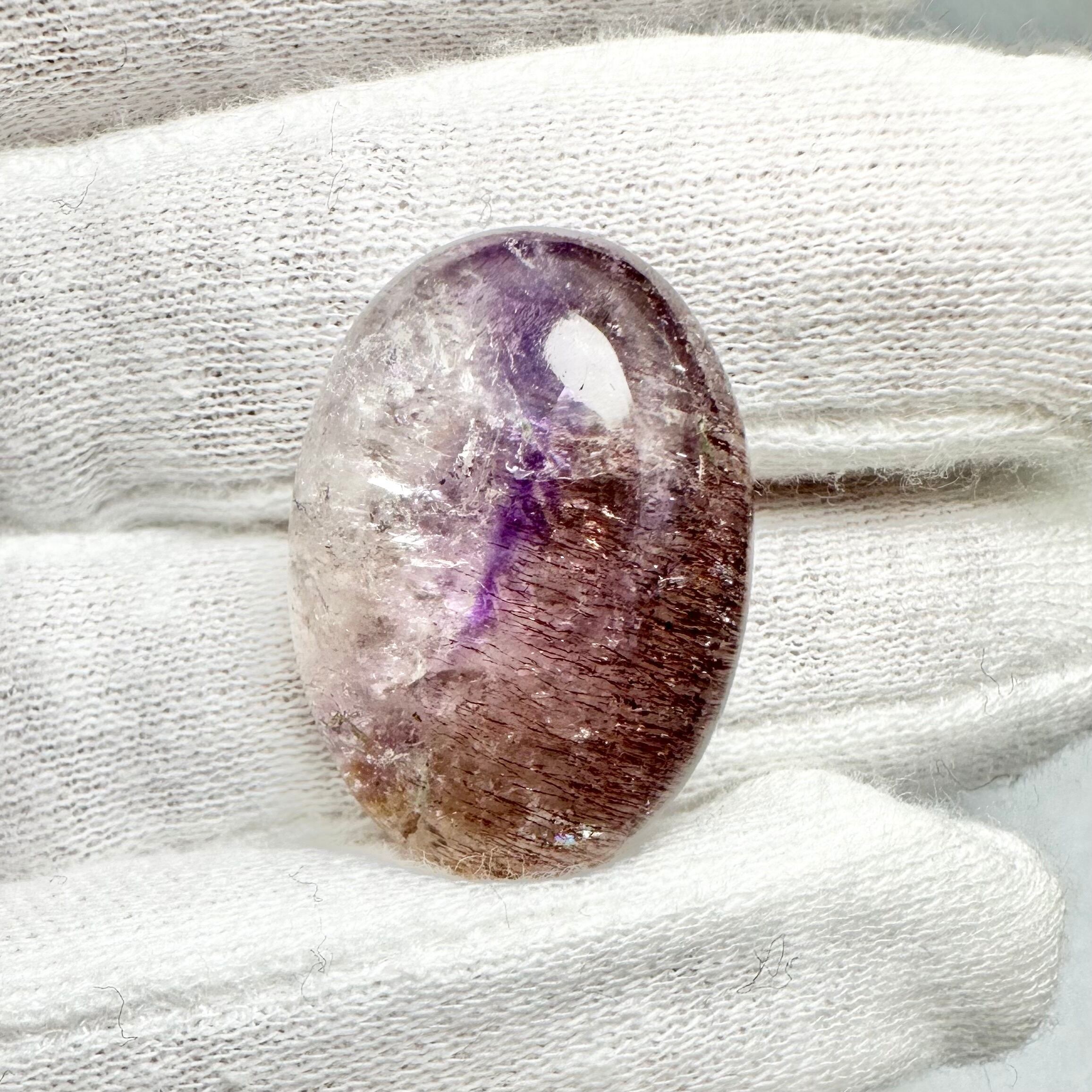 線の様に入ったアメシストの色味も美しいですし、ルースのちょうど半分に入ったゲーサイトが光を受けて虹色に輝く姿は息を呑むほどキレイです。