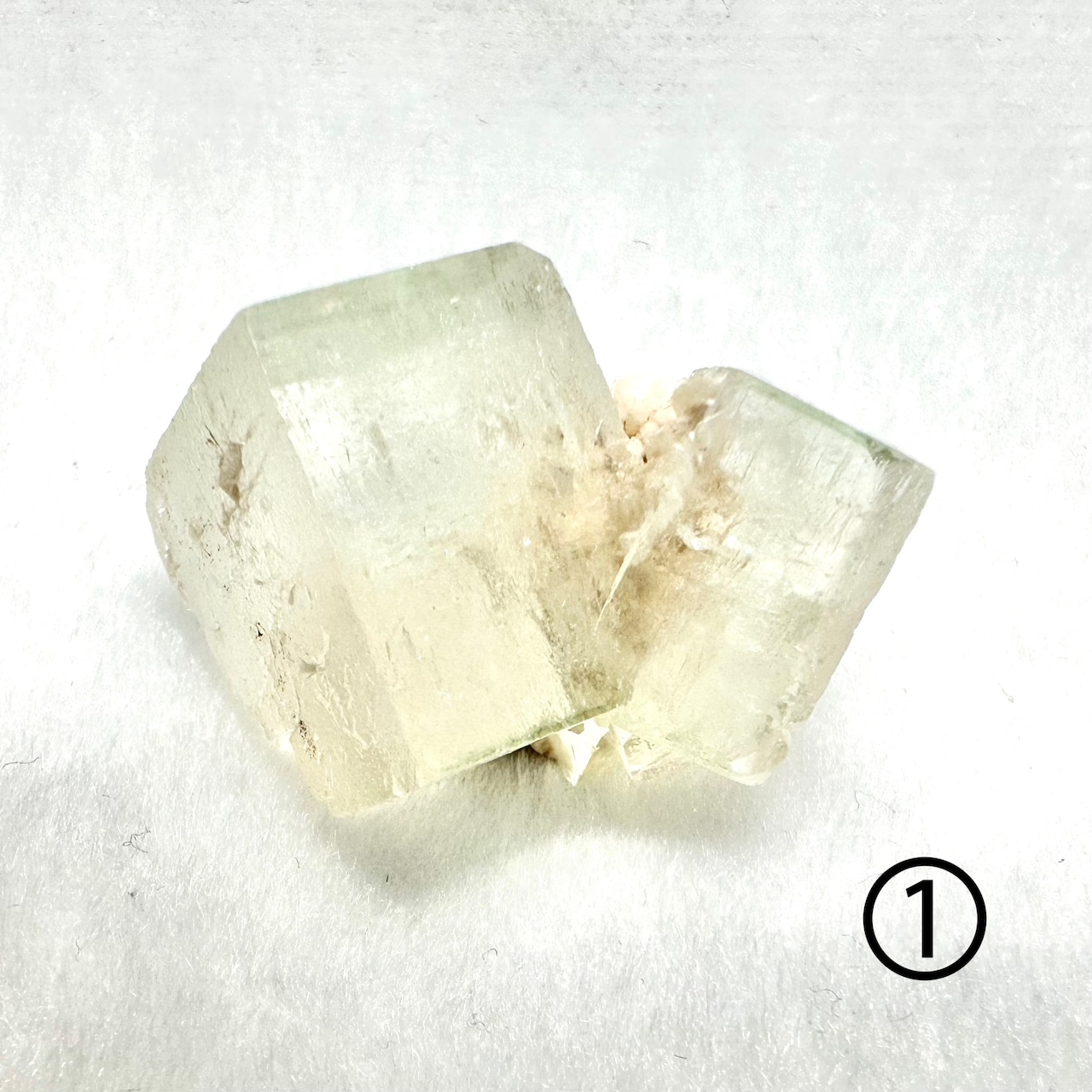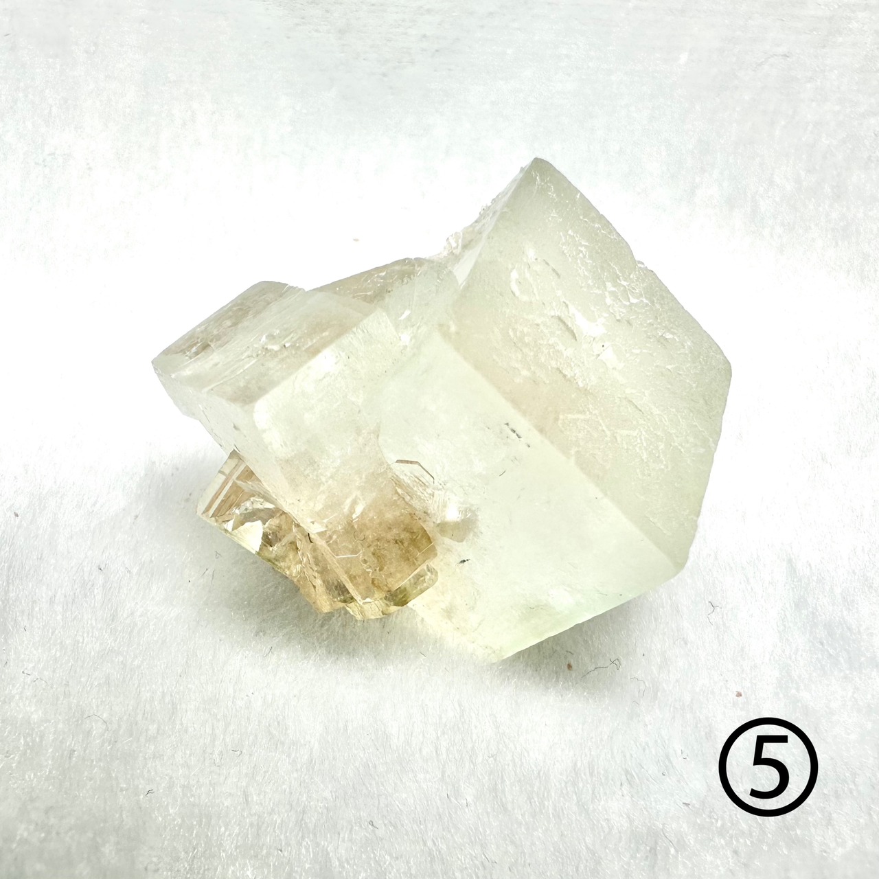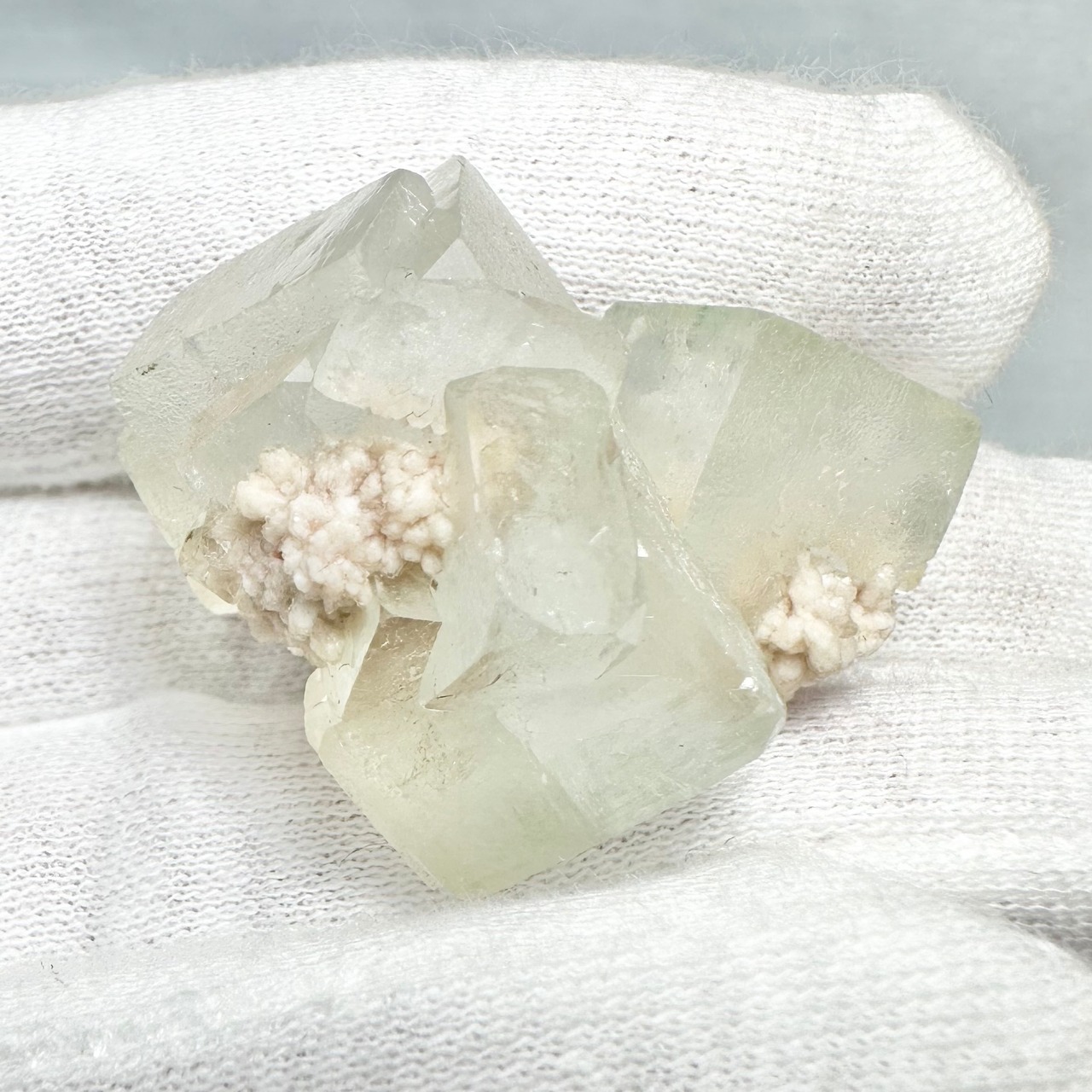 カルセドニーと水晶(石英)の中間の鉱物を芯にし、そこにキューブ状にアポフィライトが成長したようです。