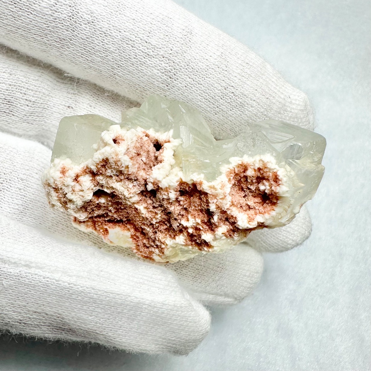 つい最近、インドのバイジャプルにて発見されたキューブ状になって連なった、アポフィライトの結晶とは一見思えない形をした可愛い原石です。