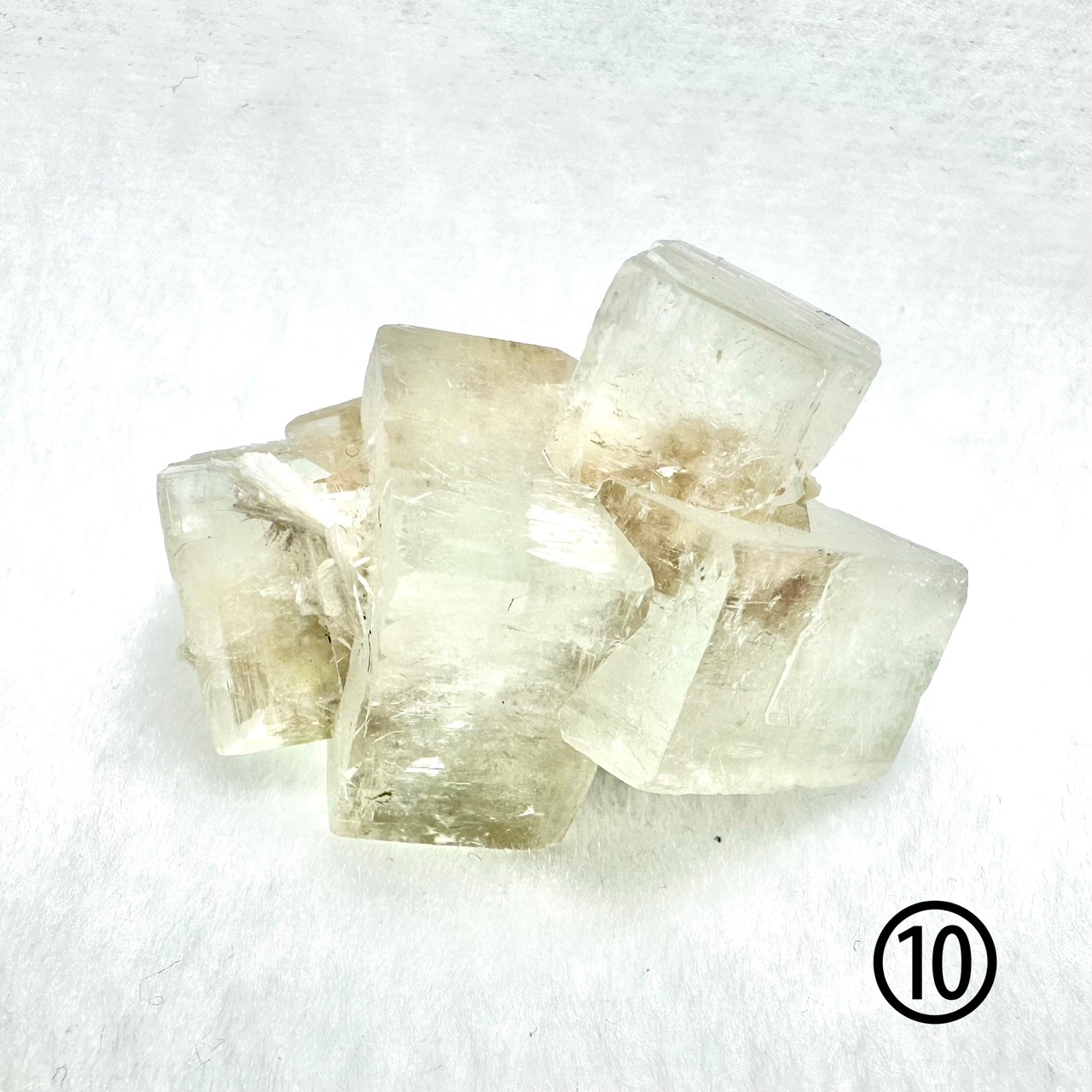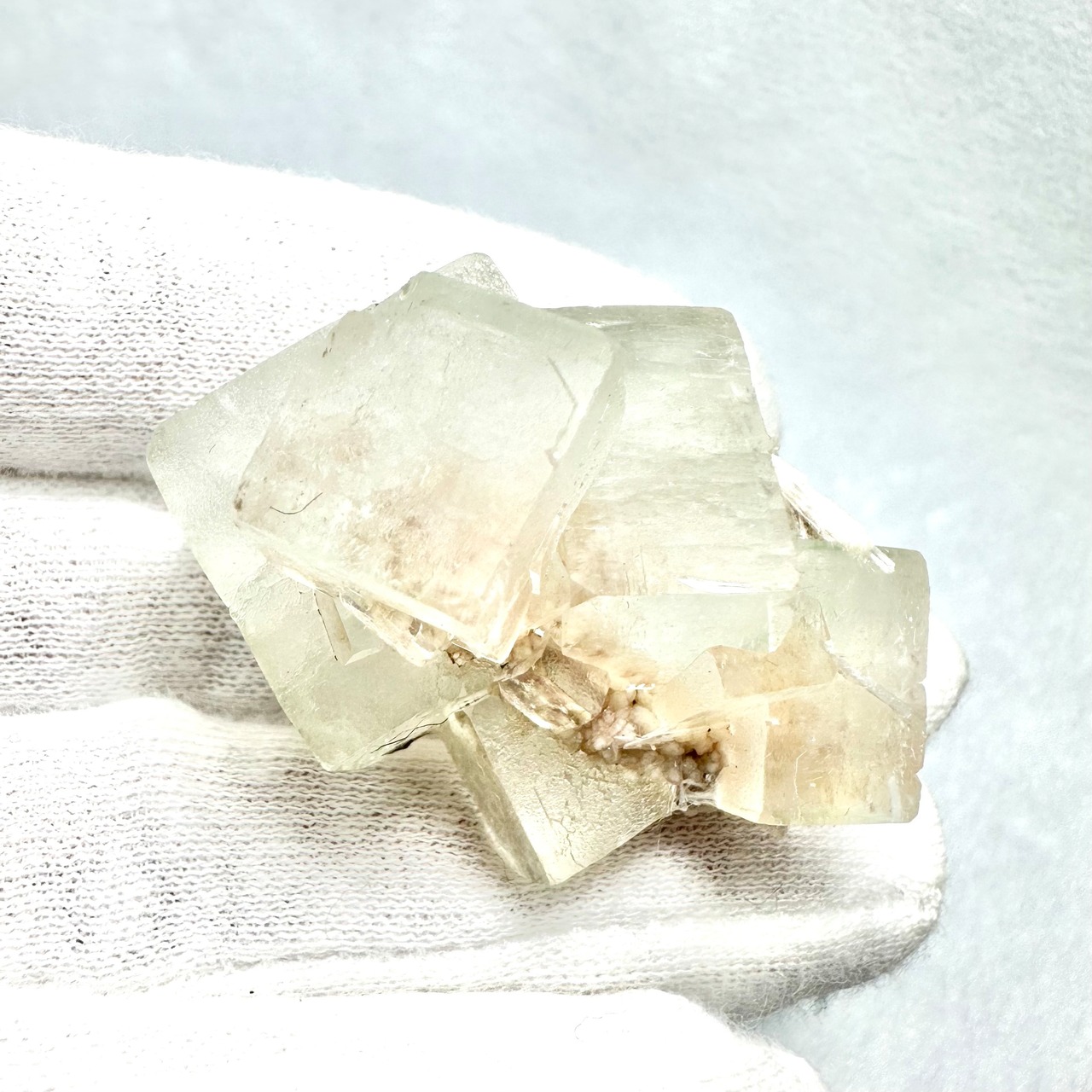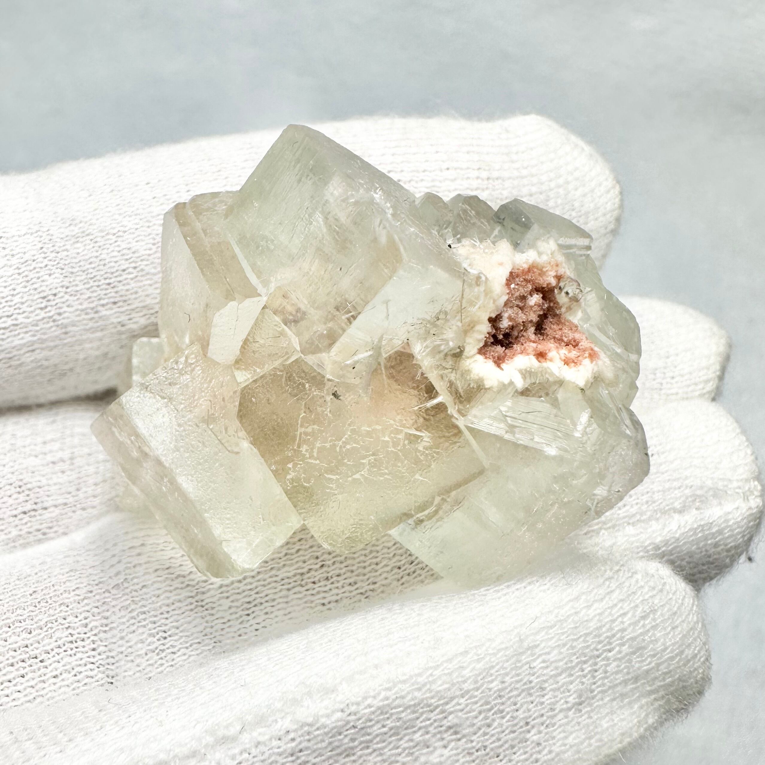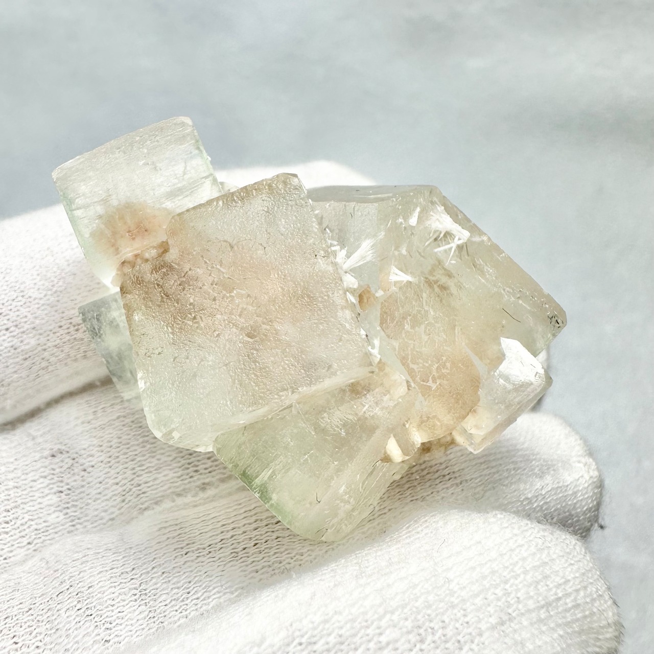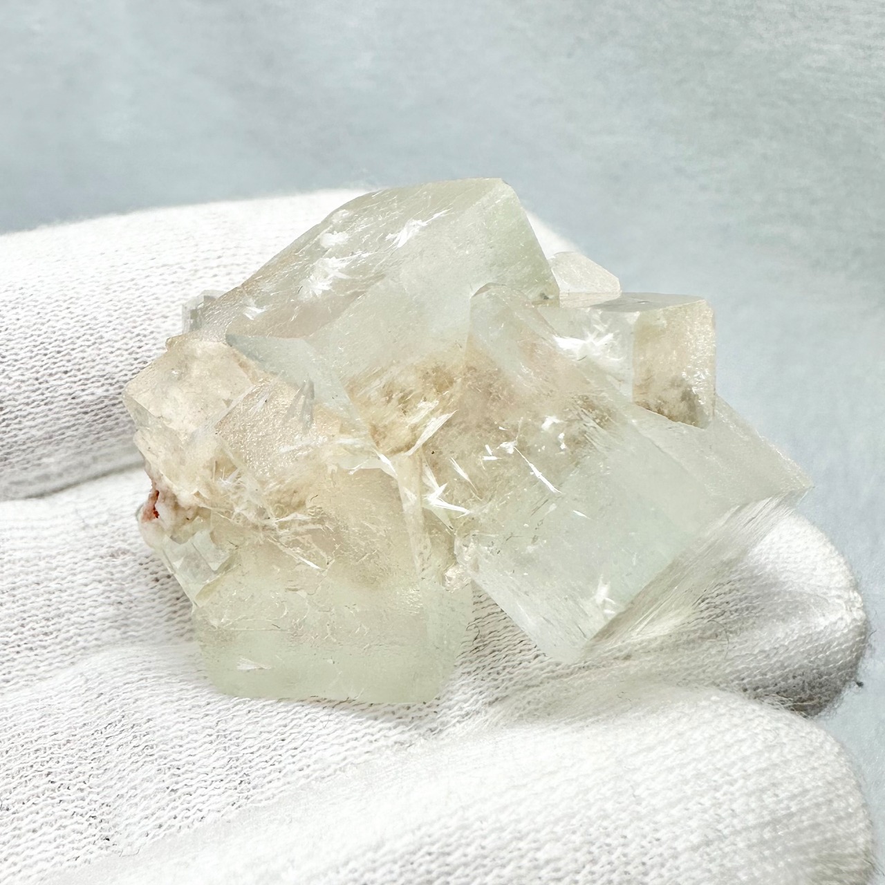 つい最近、インドのバイジャプルにて発見されたキューブ状になって連なった、アポフィライトの結晶とは一見思えない形をした可愛い原石です。