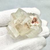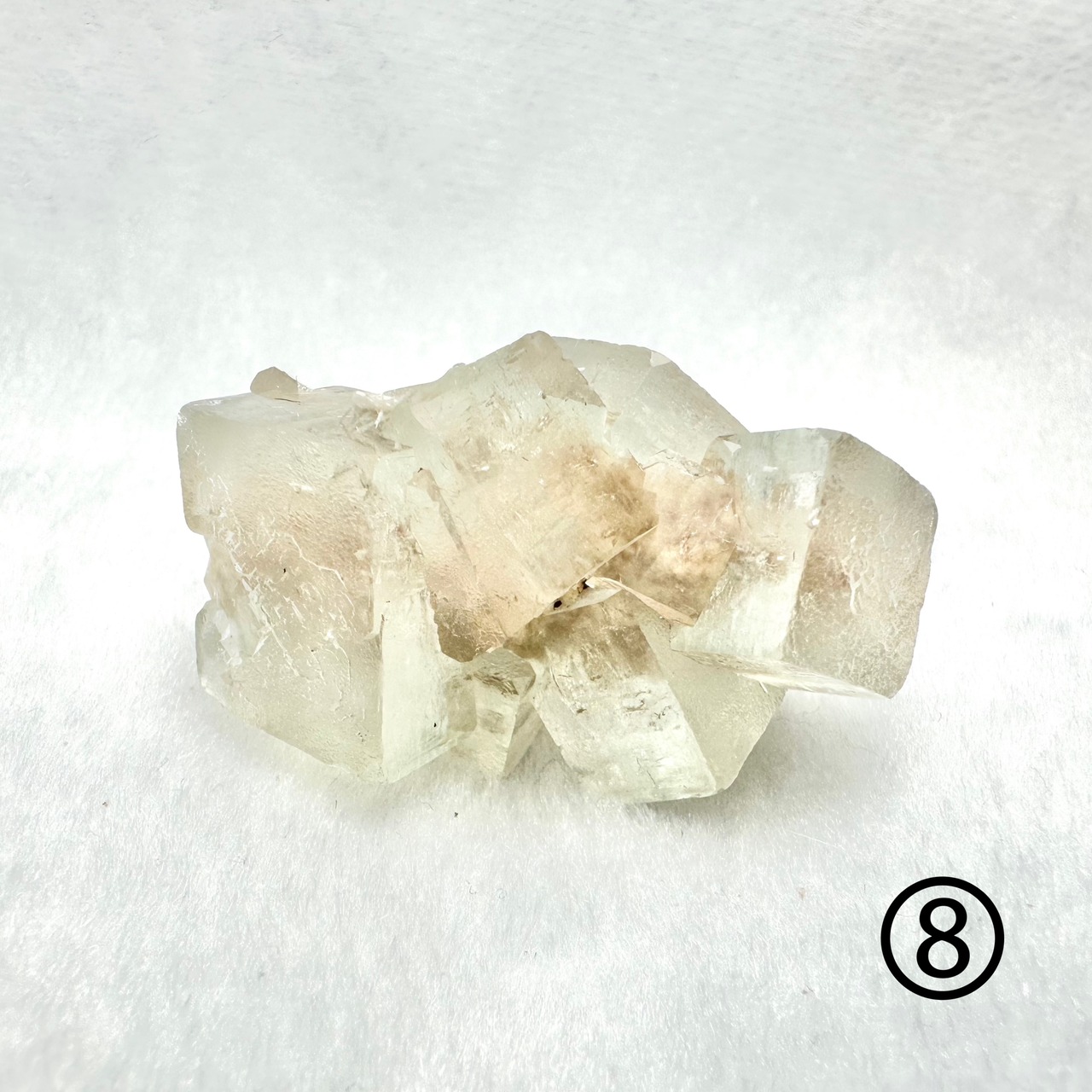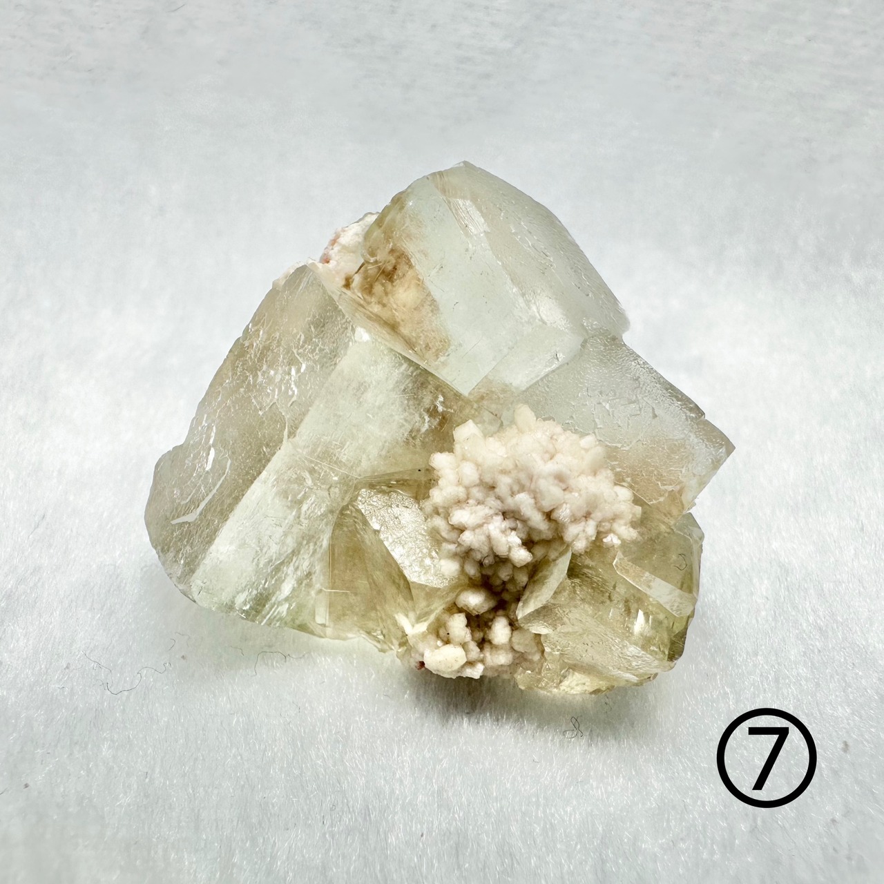 カルセドニーと水晶(石英)の中間の鉱物を芯にし、そこにキューブ状にアポフィライトが成長したようです。