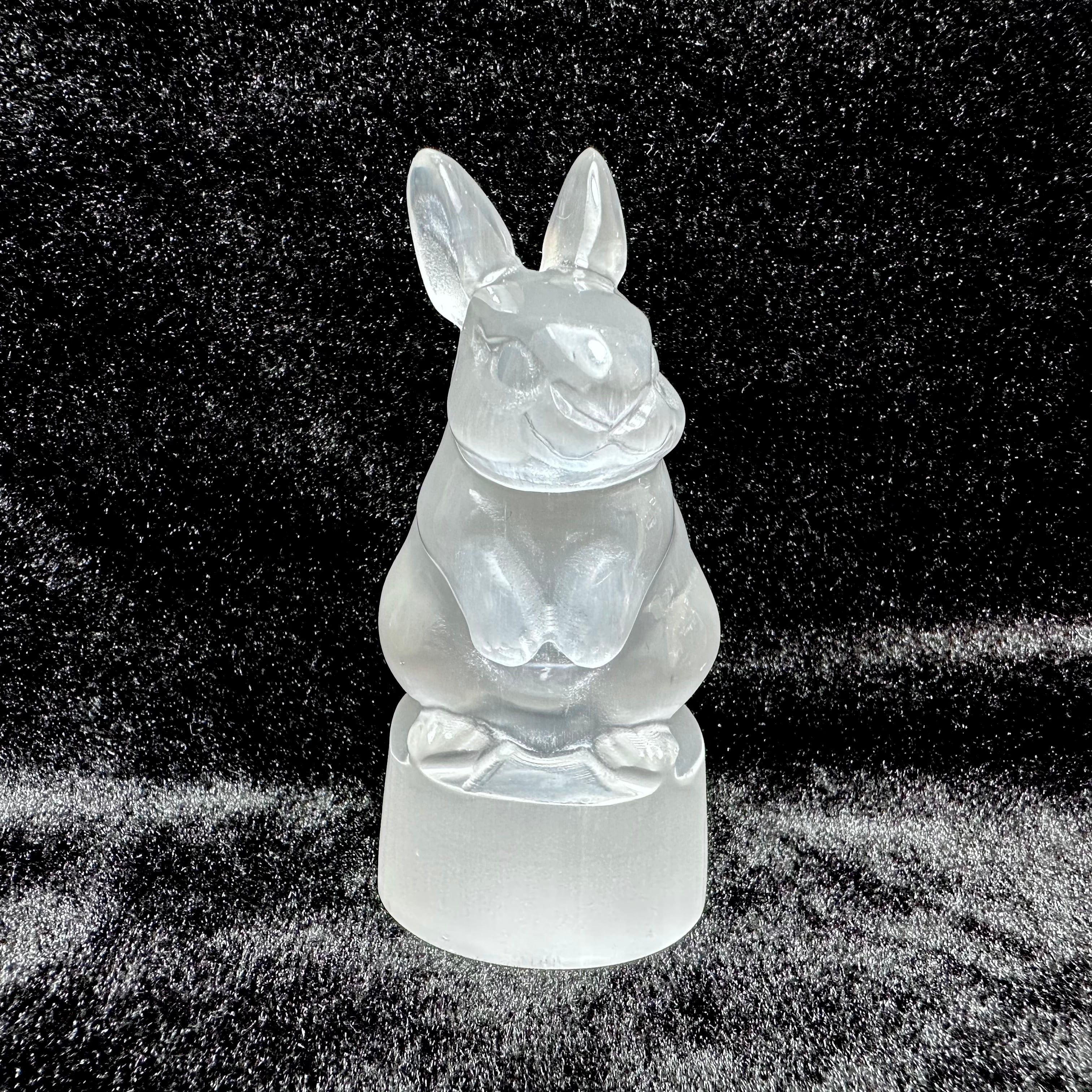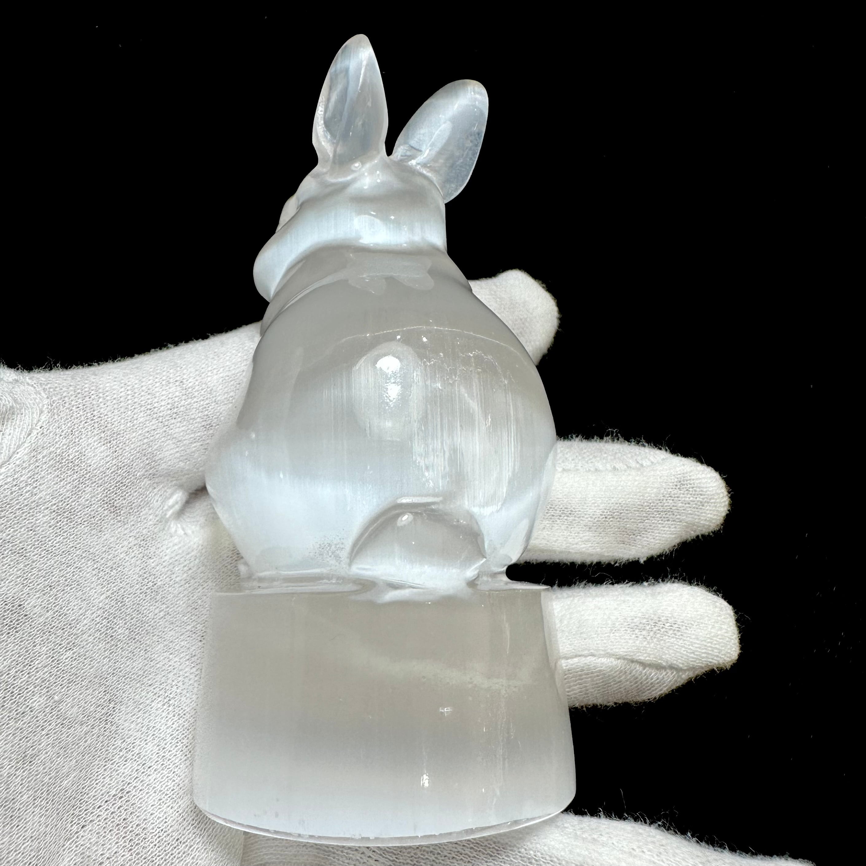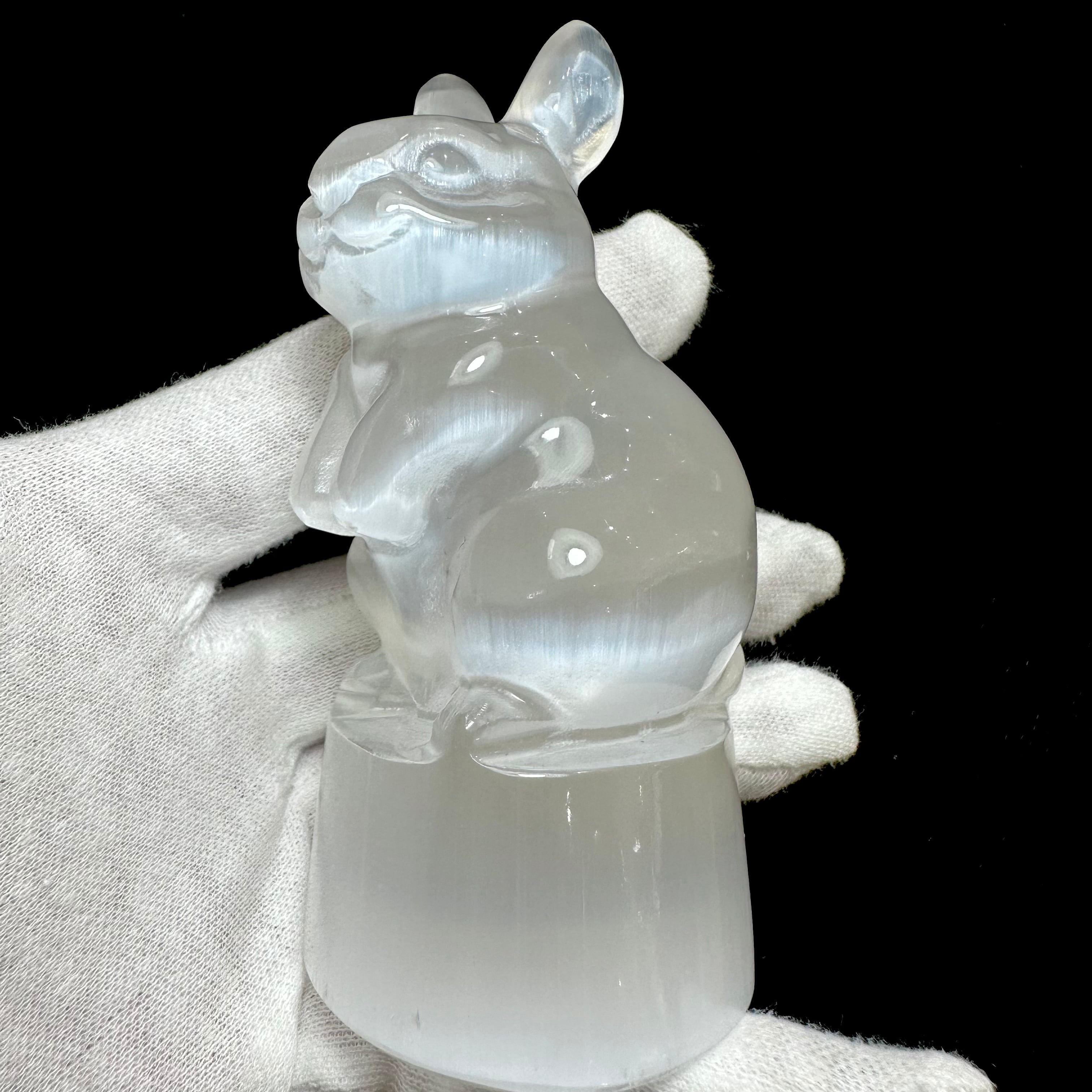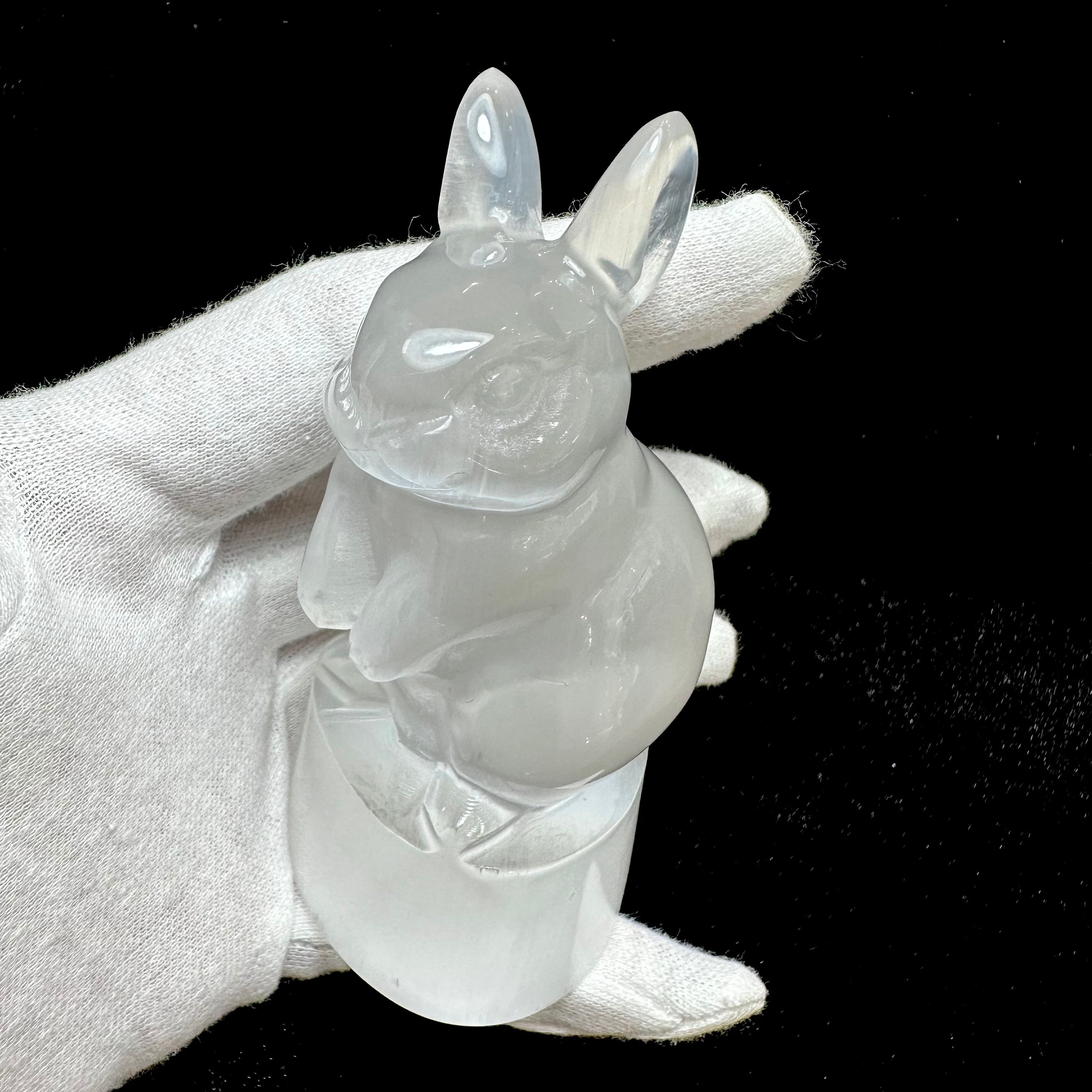 セレナイト特有のなんとも表現し難い美しい輝きがとても楽しめる高品質の原石を使用し、一点一点手彫りされたとても可愛いウサ日の置物です。