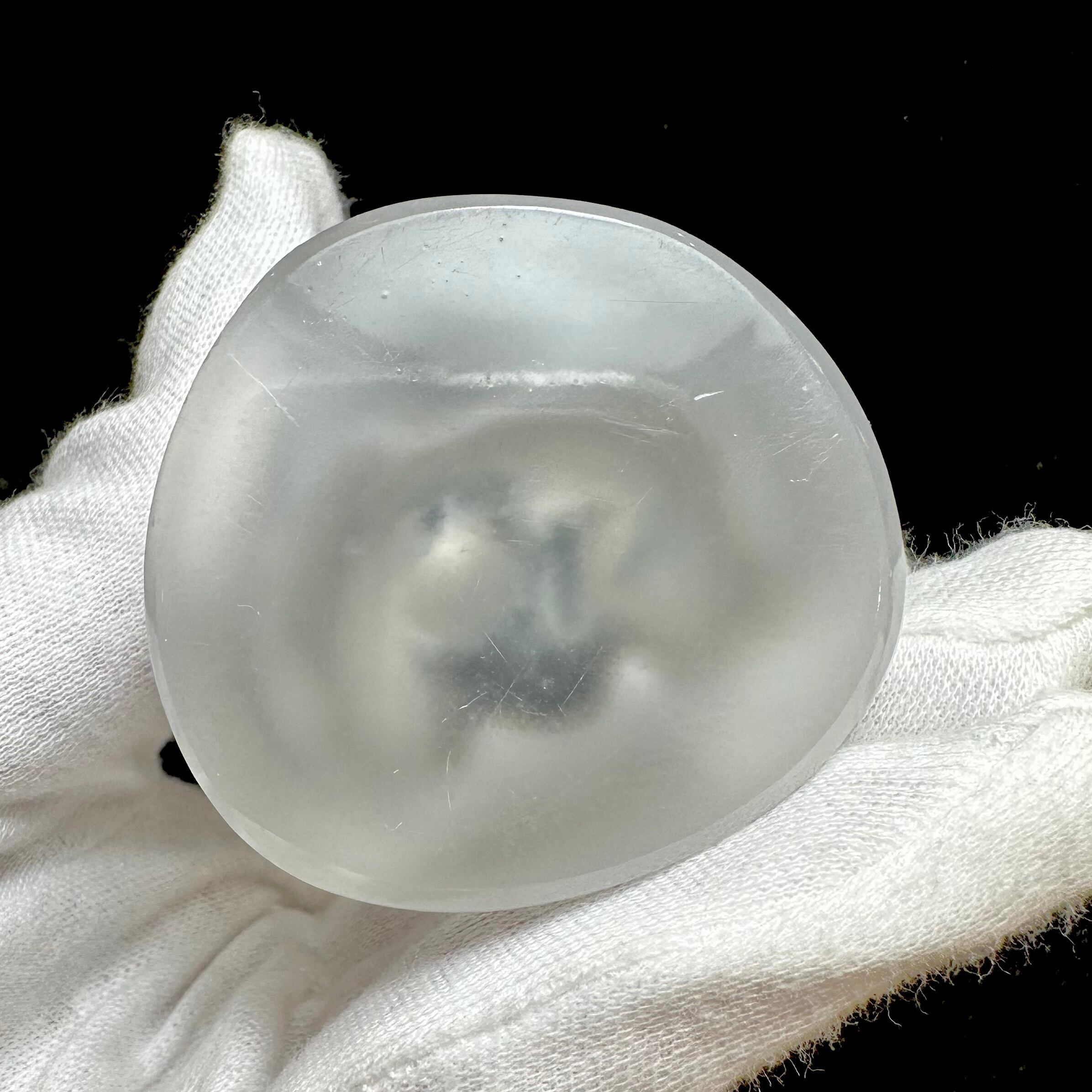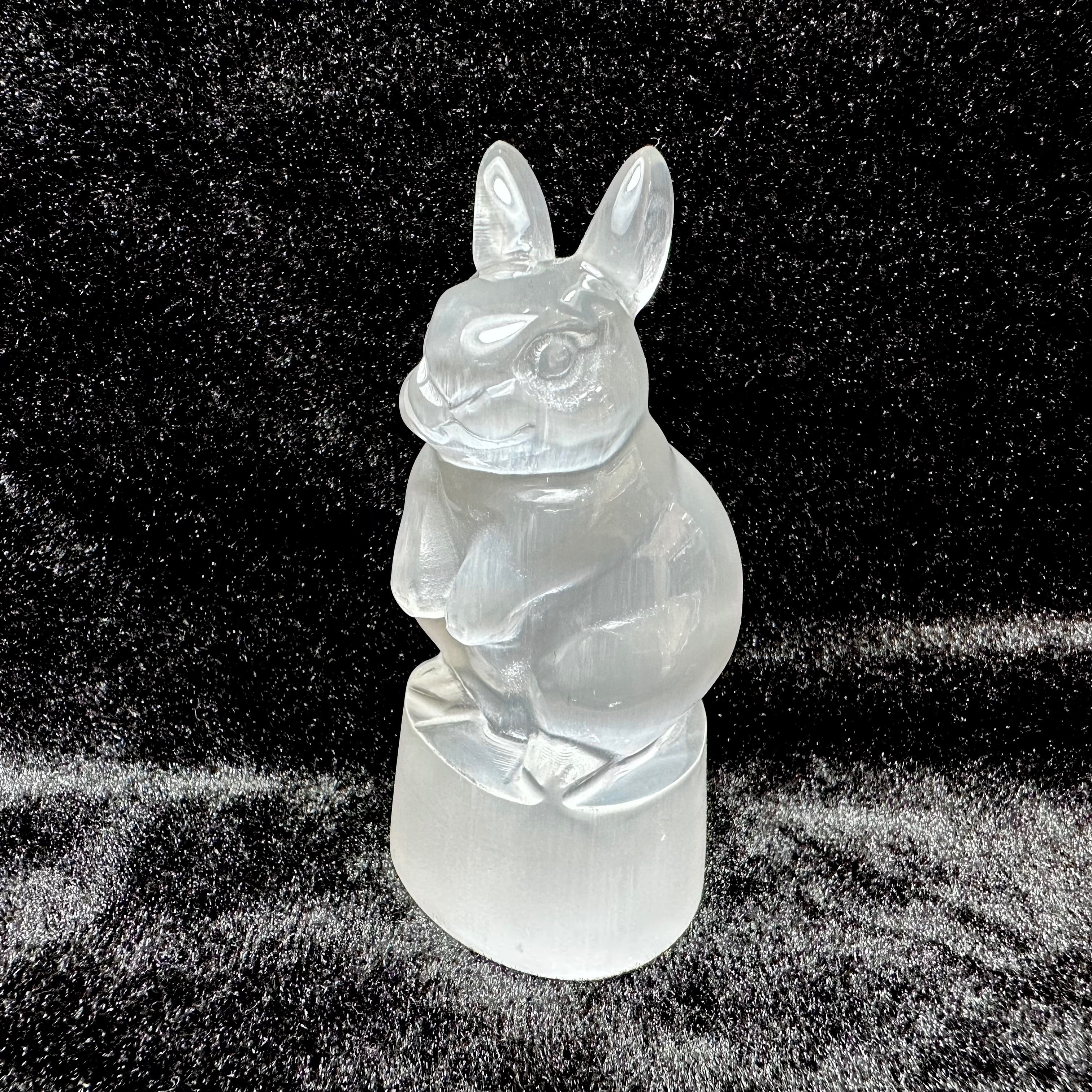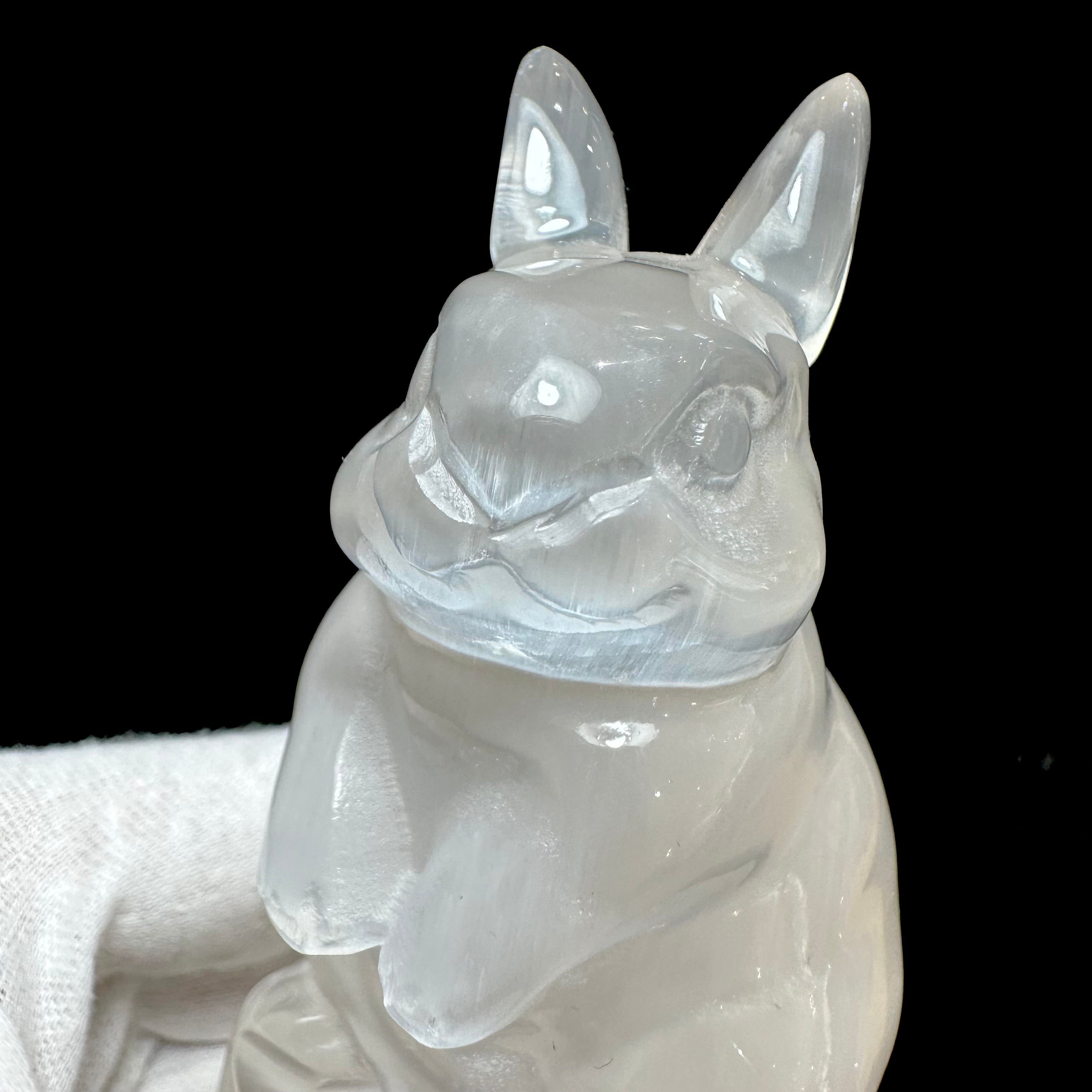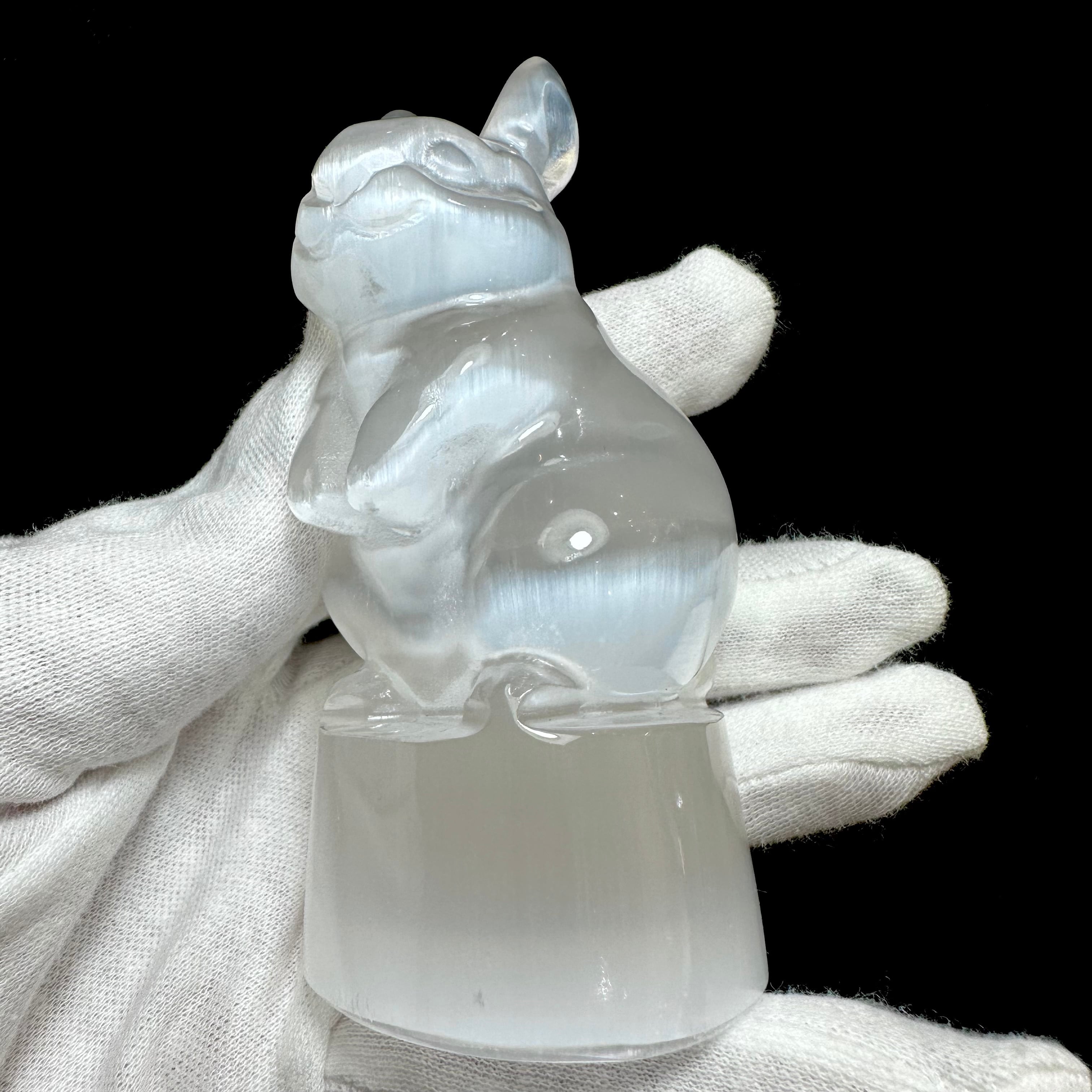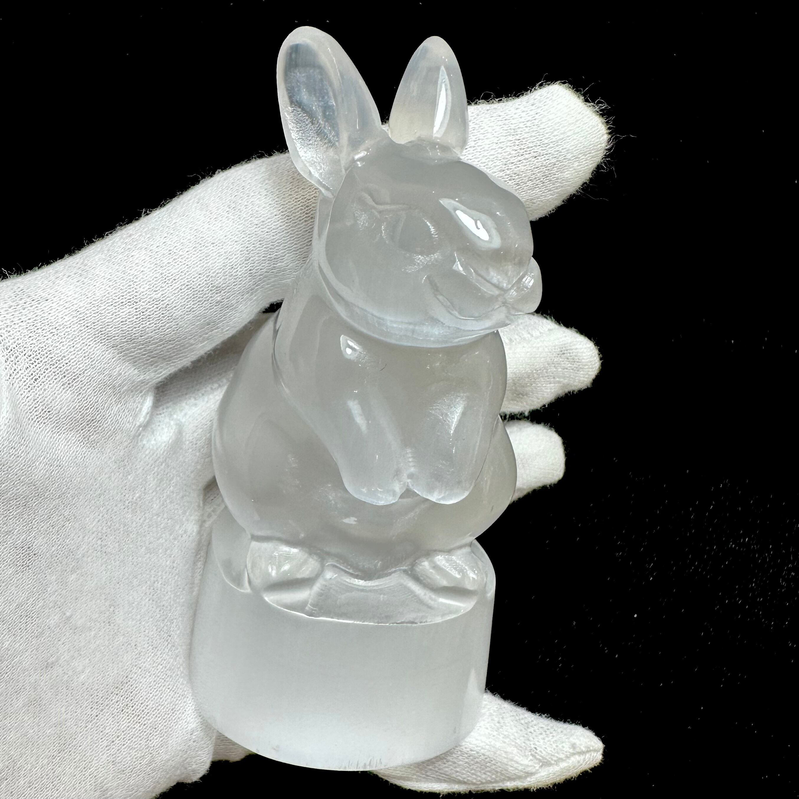セレナイト特有のなんとも表現し難い美しい輝きがとても楽しめる高品質の原石を使用し、一点一点手彫りされたとても可愛いウサ日の置物です。