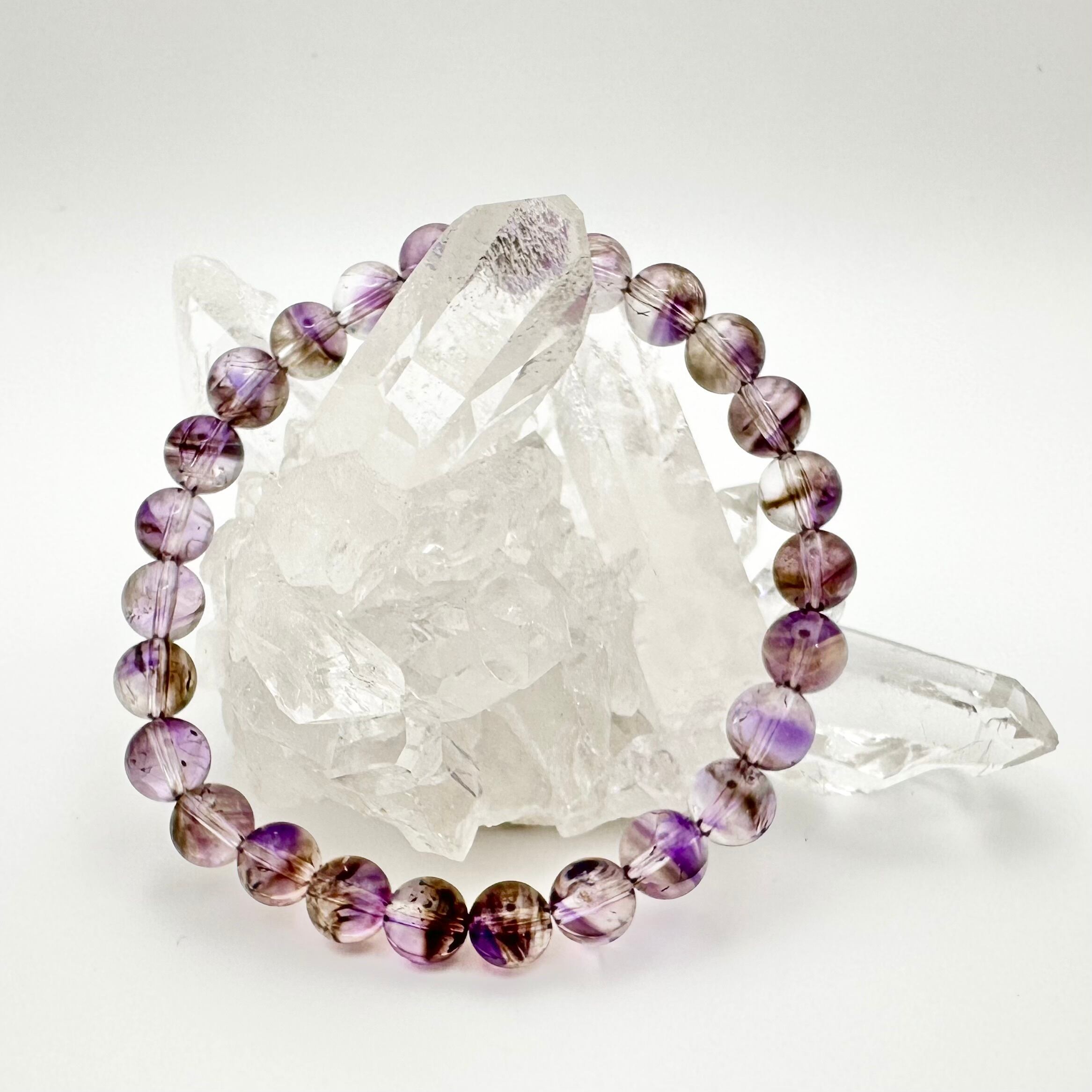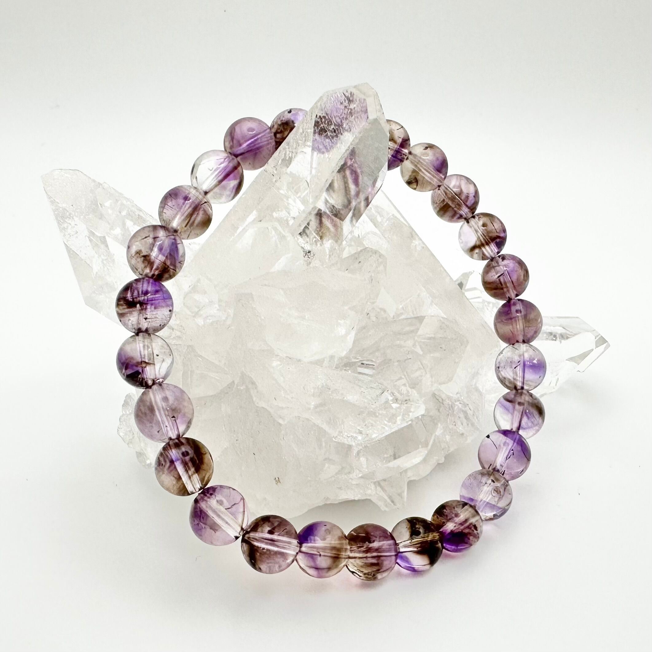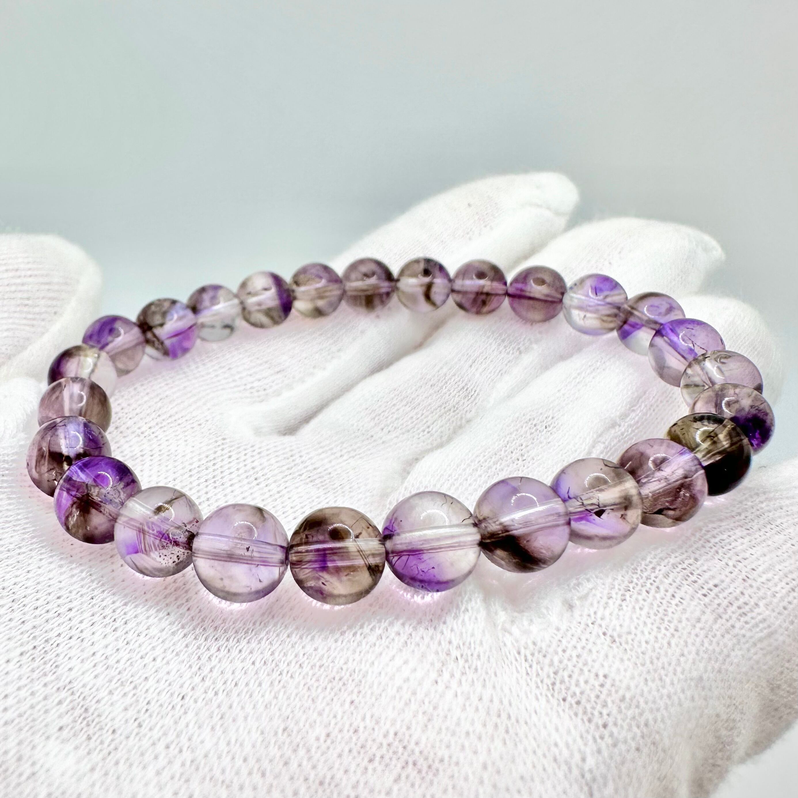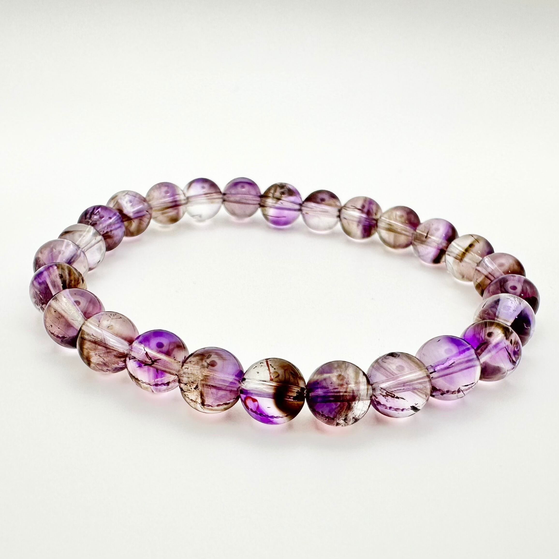 こちらのブレスレットは透明度も高く、エレスチャルの魅力であるムラサキと水晶の混ざりやゲーサイトなどの内包物をしっかりと楽しめる大変美しい子です。