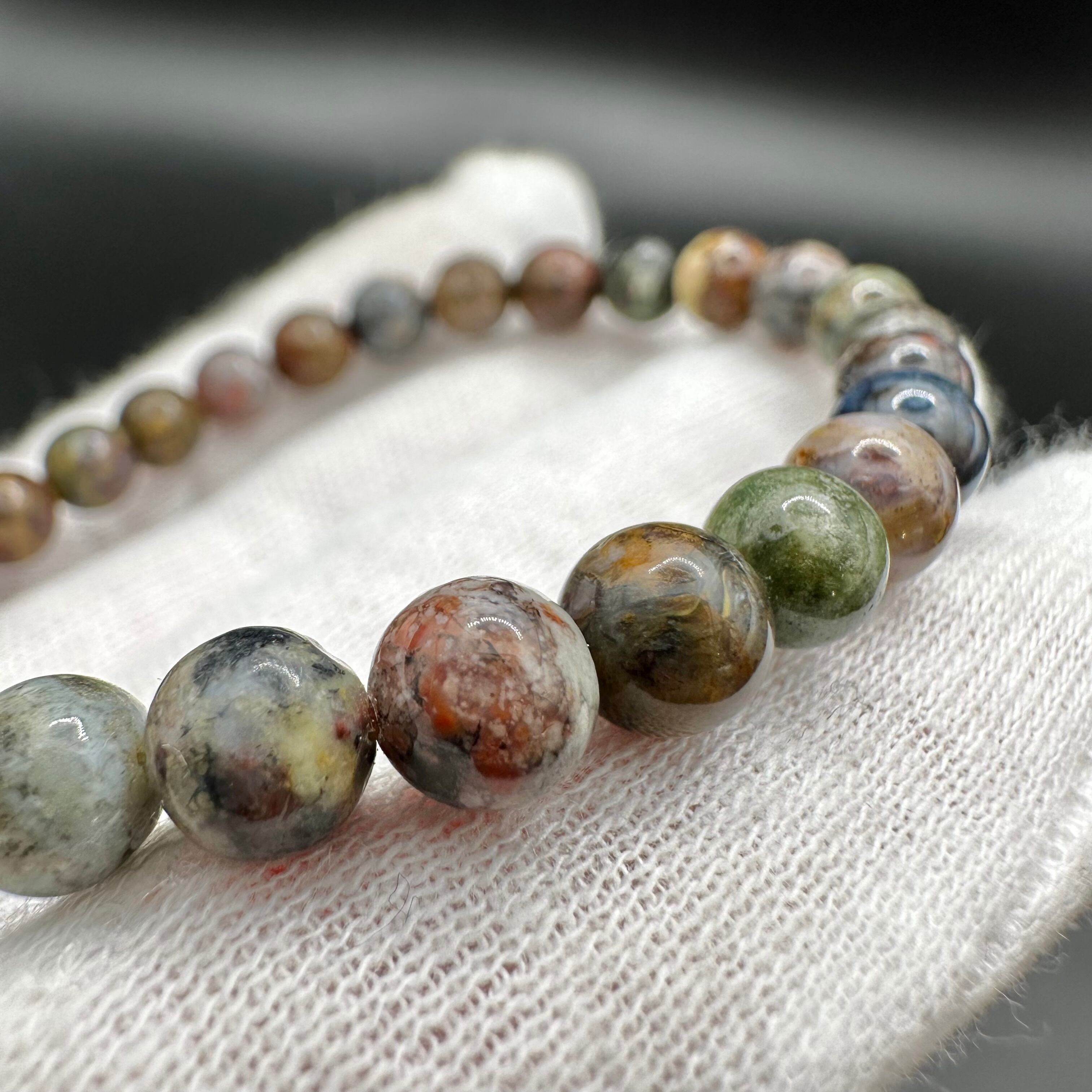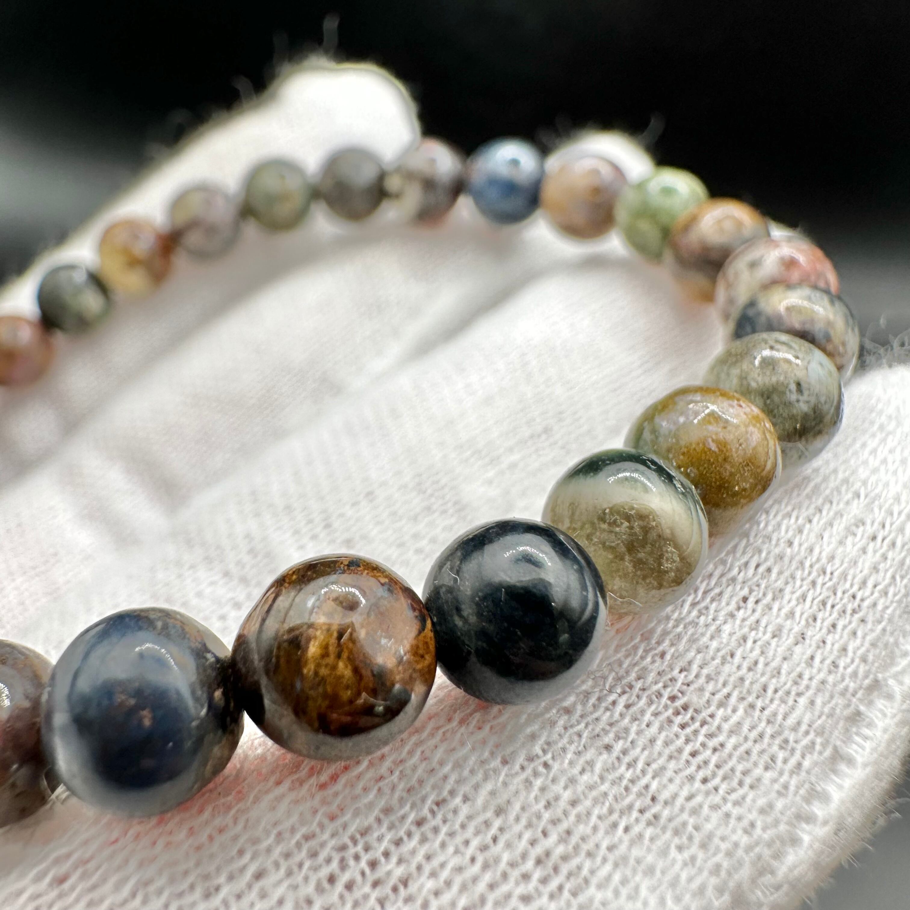 玉が小さいのでピーターサイト特有の輝きは分かりにくいですが、さまざまな鉱物が混ざった不思議な模様や色味はとても良く見られます。