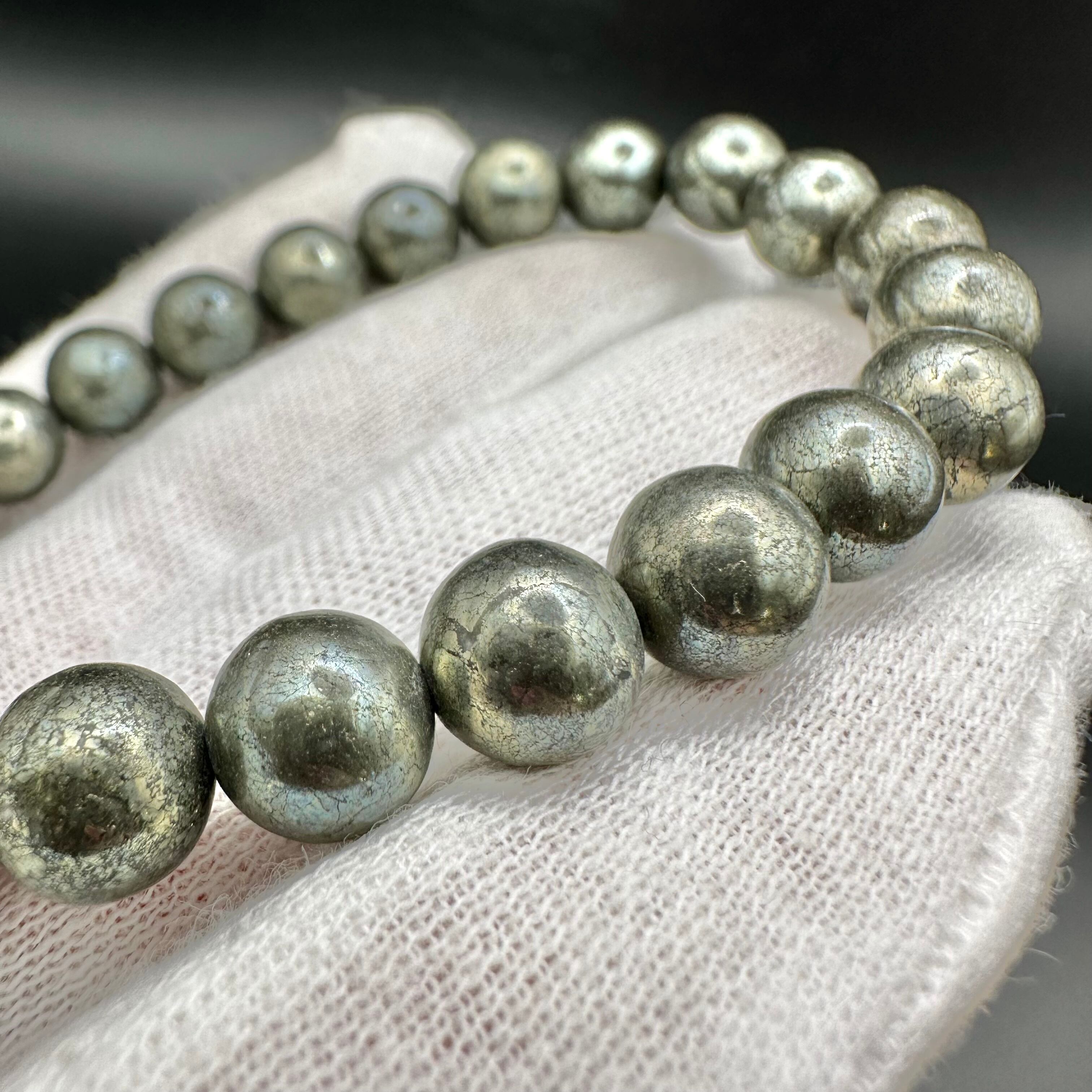 形が美しいため原石で出回ることが多いパイライトですが、ブレスレットになると渋いゴールドがとってもアンティークっぽくて素敵です。