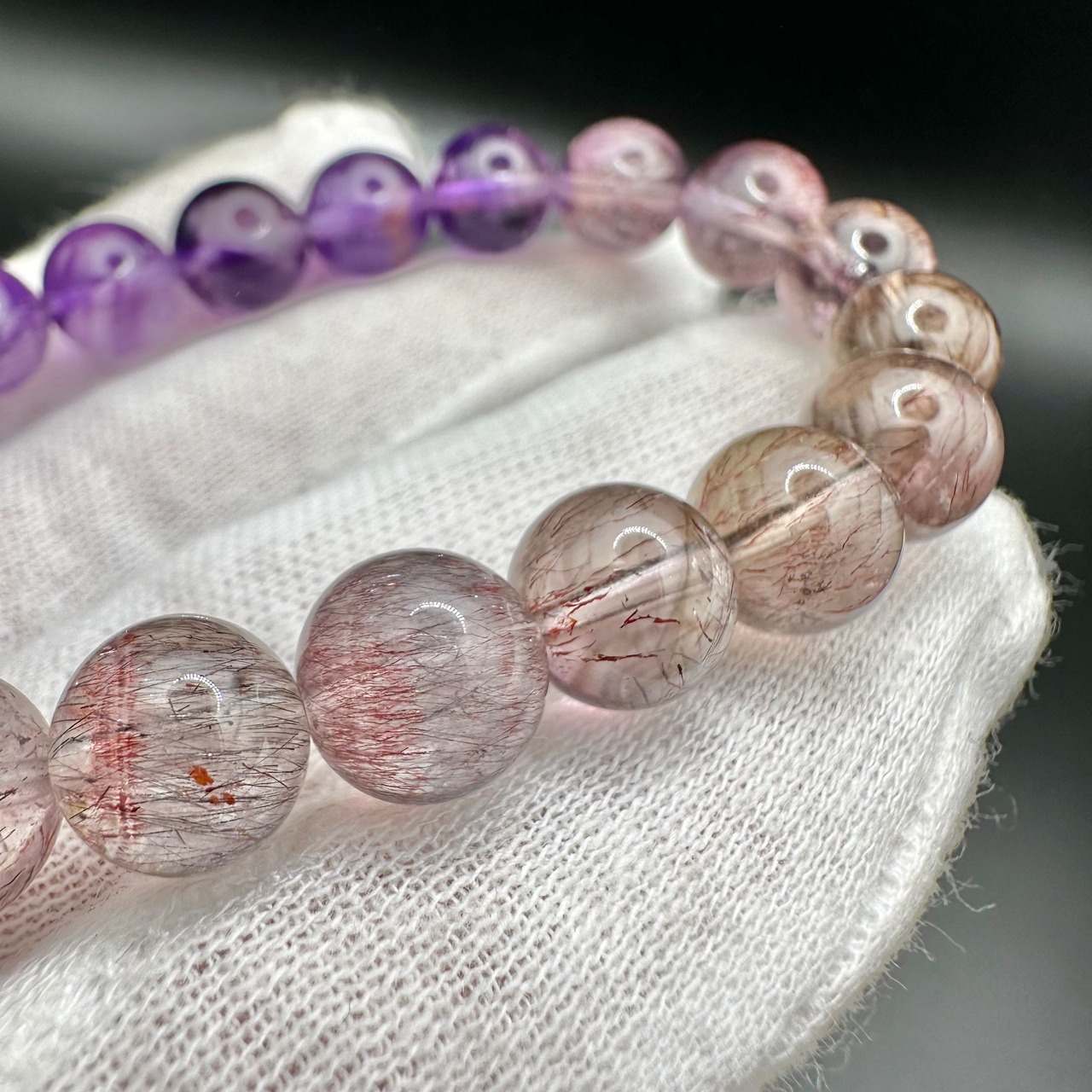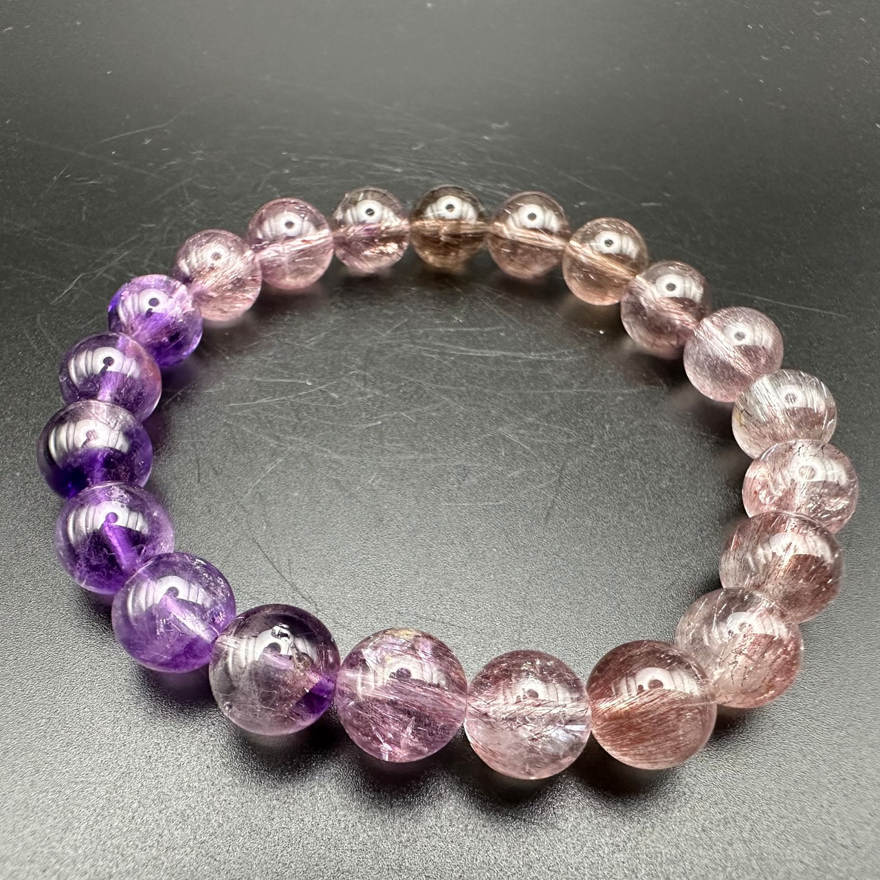 こちらはゲーサイトの入り方がとても美しく、スモーキーやアメシストの部分にもしっかりと内包物が入ったクオリティが高くて美しくブレスレットです。