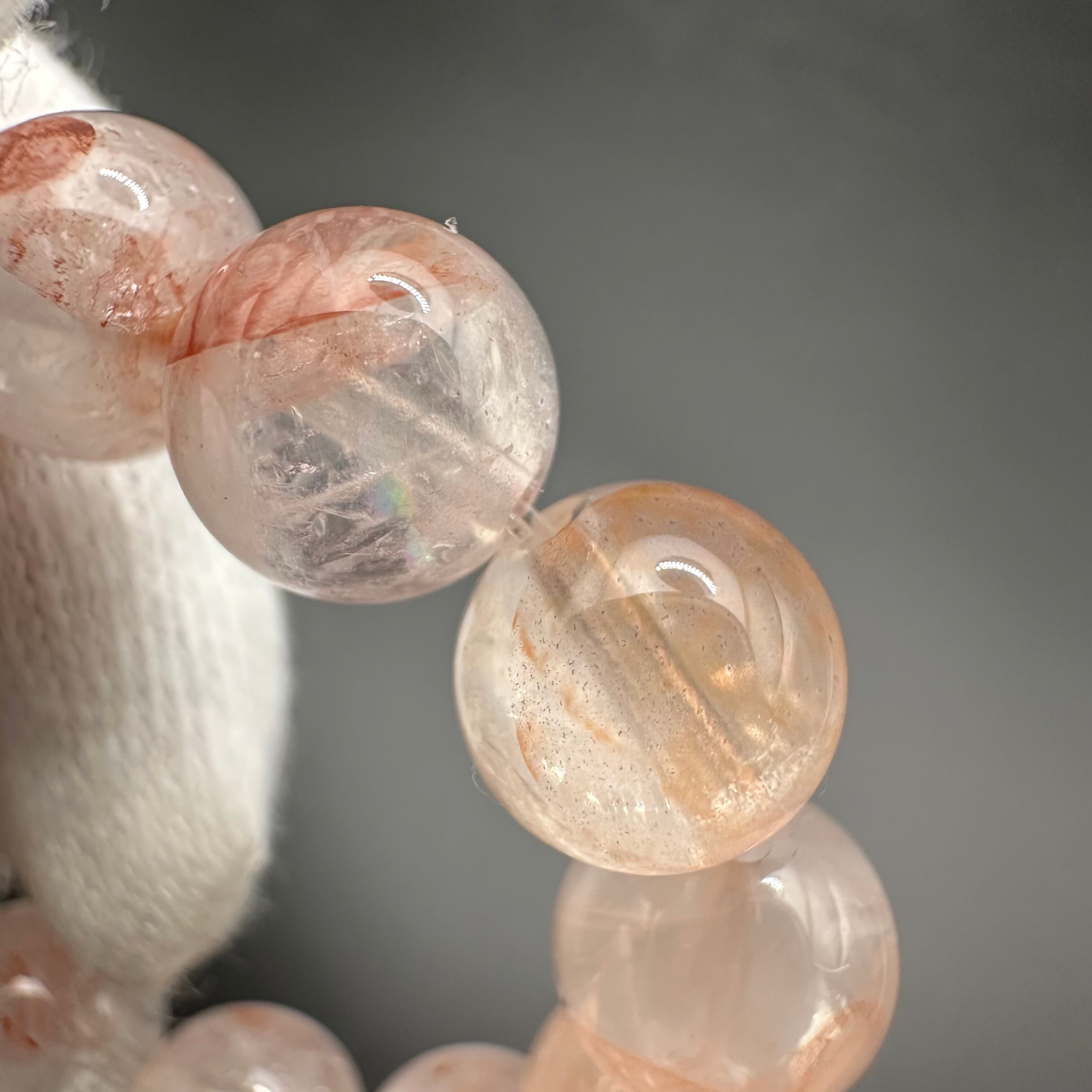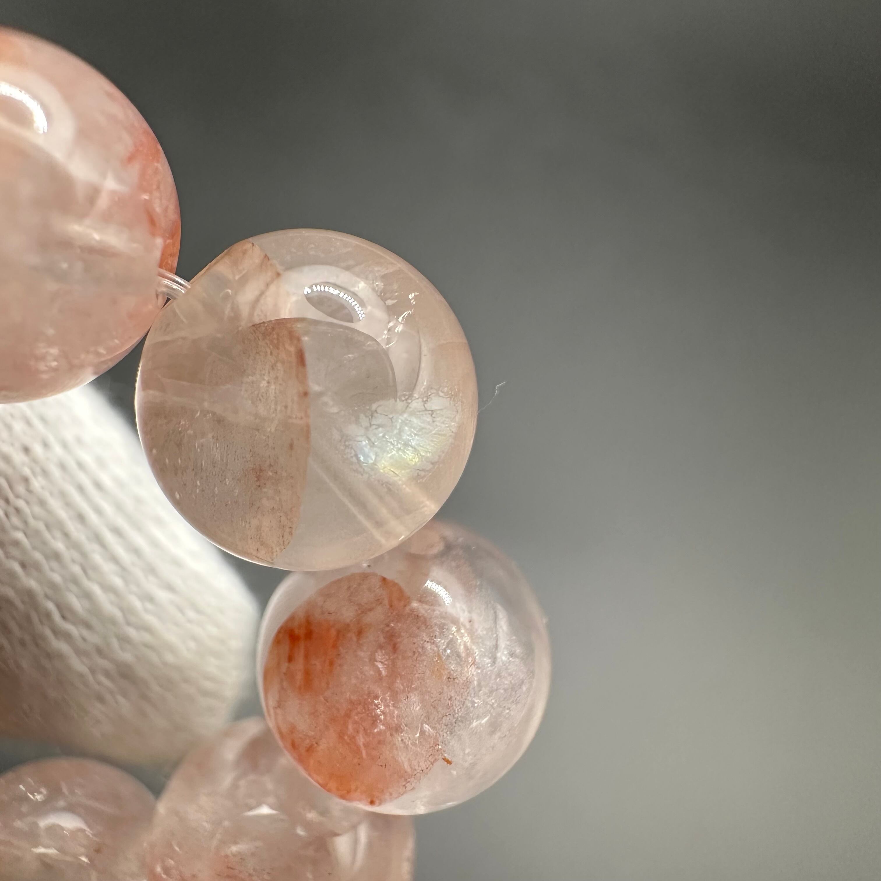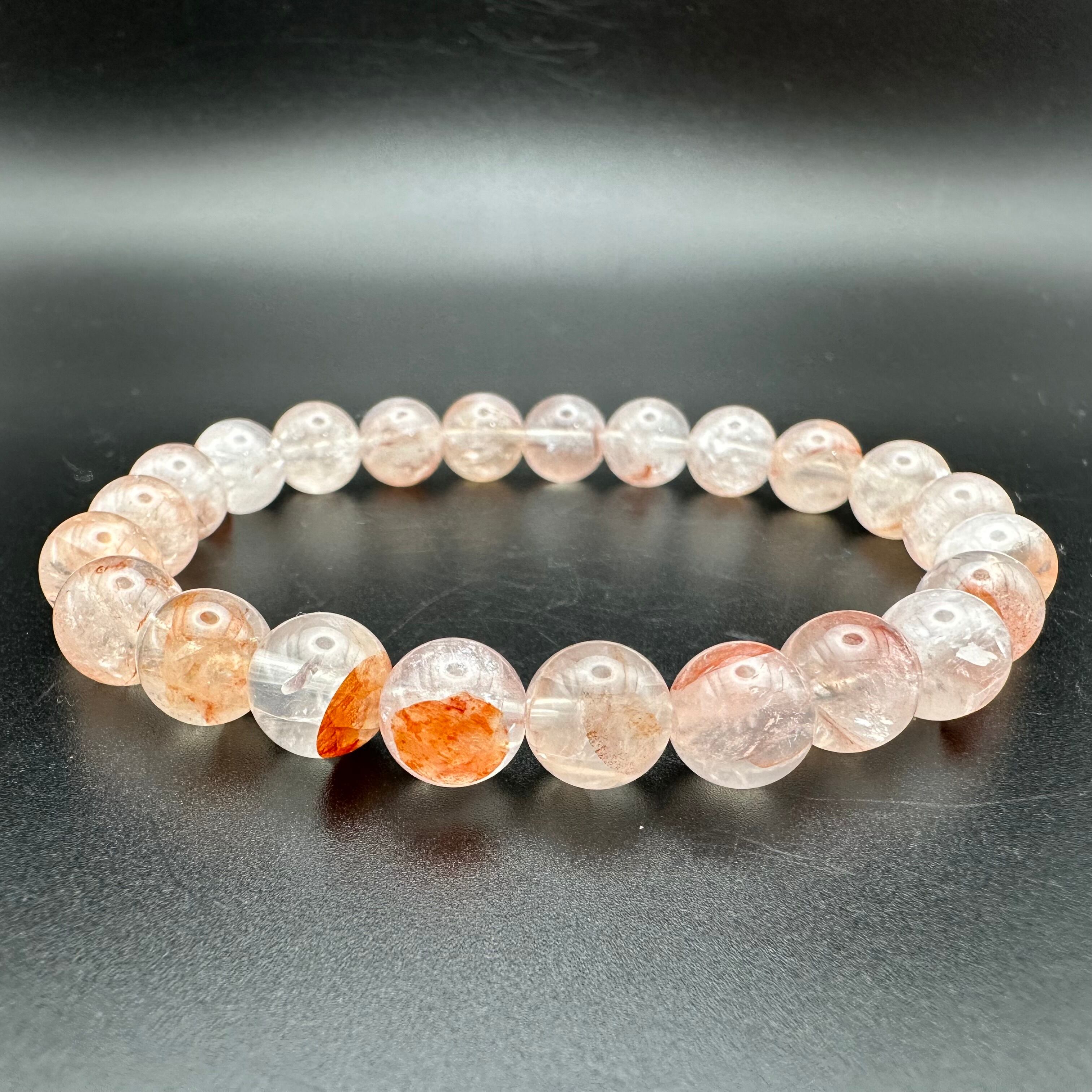 こちらのブレスレットは鉄系成分が薄かったうえ、水分の蒸発がゆっくりだったため水晶全体がピンクっぽい色味になったと思われます。