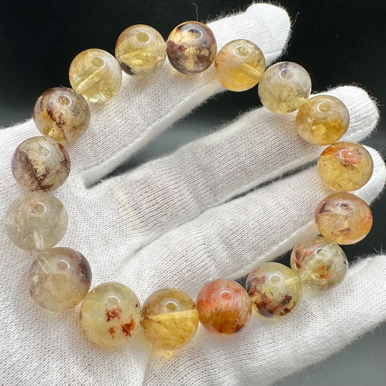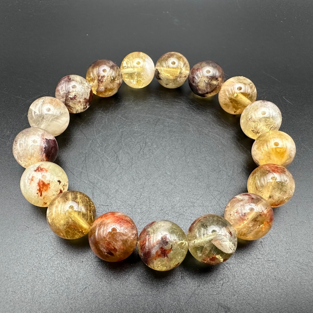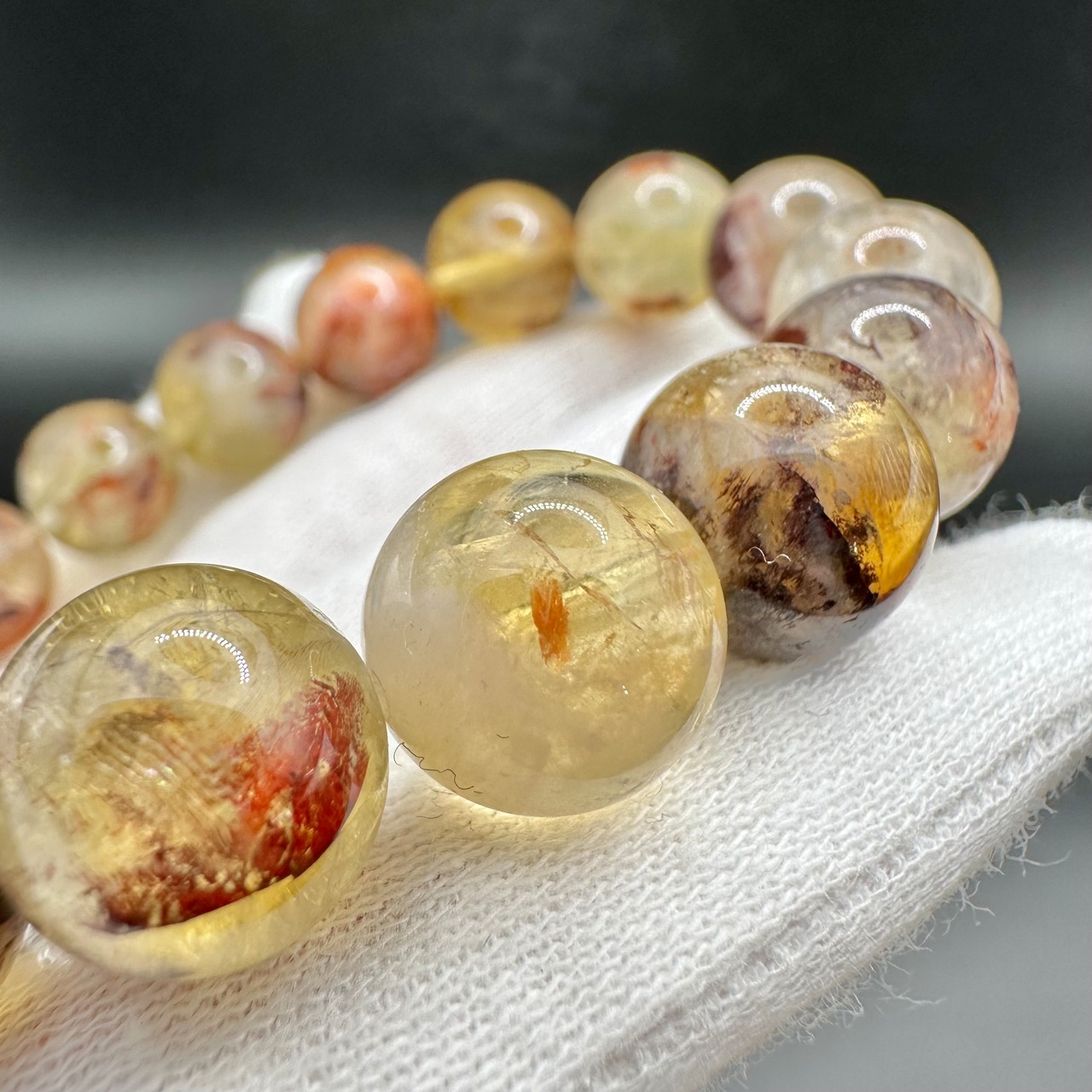 スーパーセブンの様に一つのブレスレットに全部の成分(鉱物)が入ることは中々ありませんが、今回入荷したオーラライト23は今までアメシストのパープルが全面に出ているものが多かった中で、透明でかつ、内包されているカコクセナイトが黄色や赤く輝くとても不思議なブレスレットです。