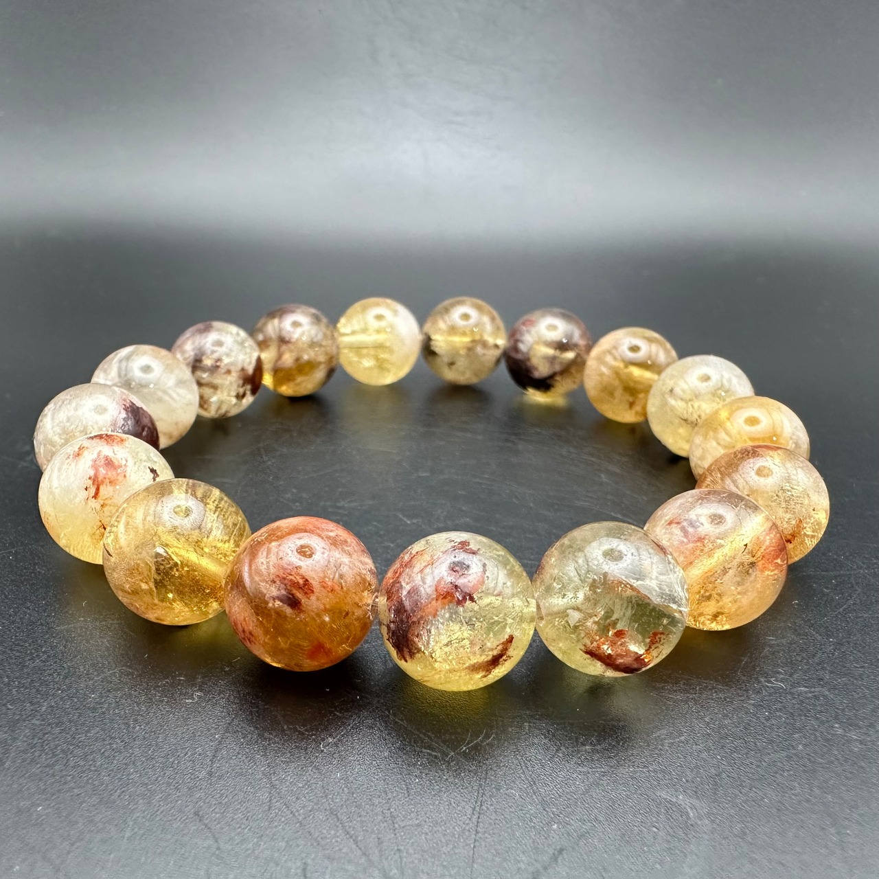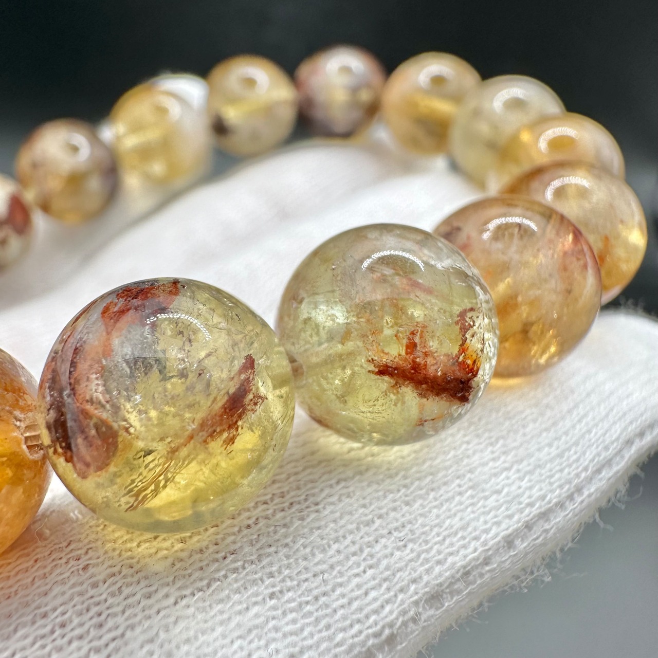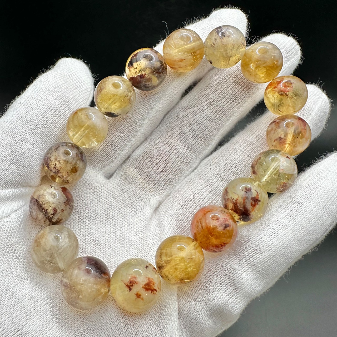 スーパーセブンの様に一つのブレスレットに全部の成分(鉱物)が入ることは中々ありませんが、今回入荷したオーラライト23は今までアメシストのパープルが全面に出ているものが多かった中で、透明でかつ、内包されているカコクセナイトが黄色や赤く輝くとても不思議なブレスレットです。