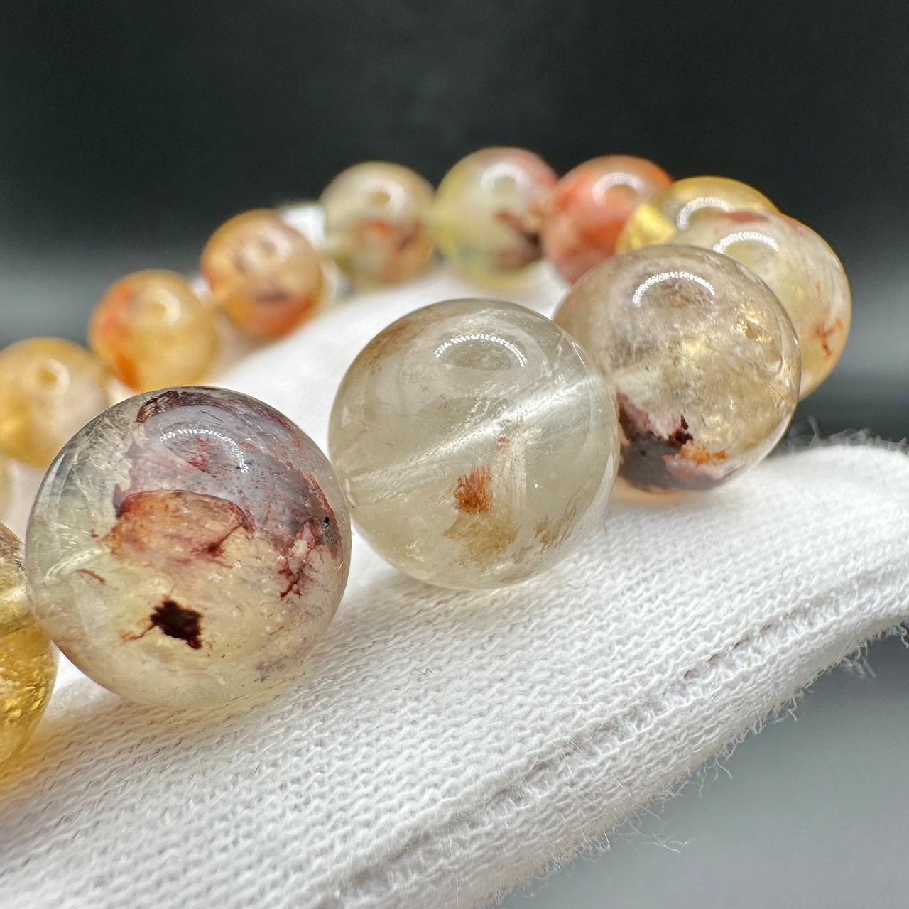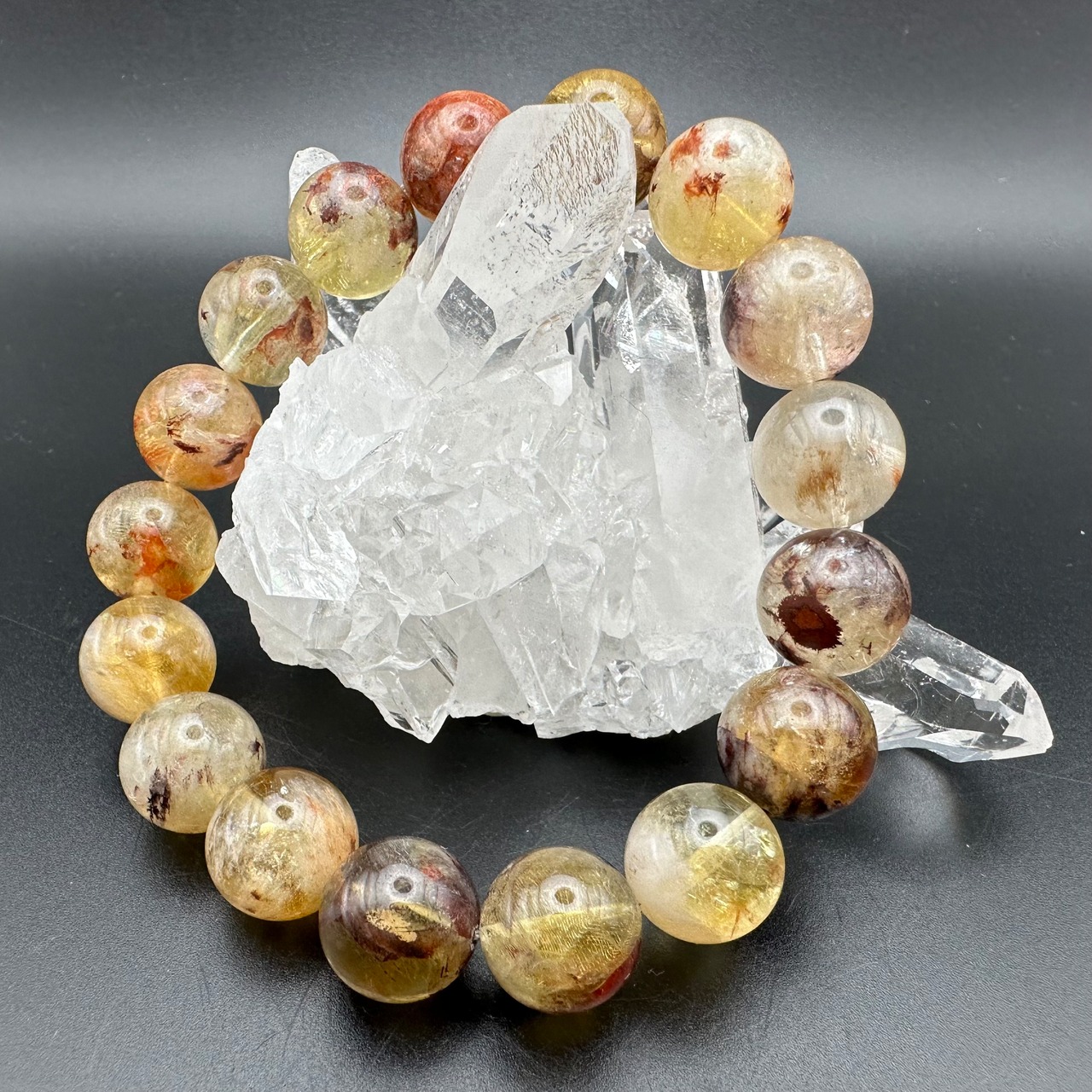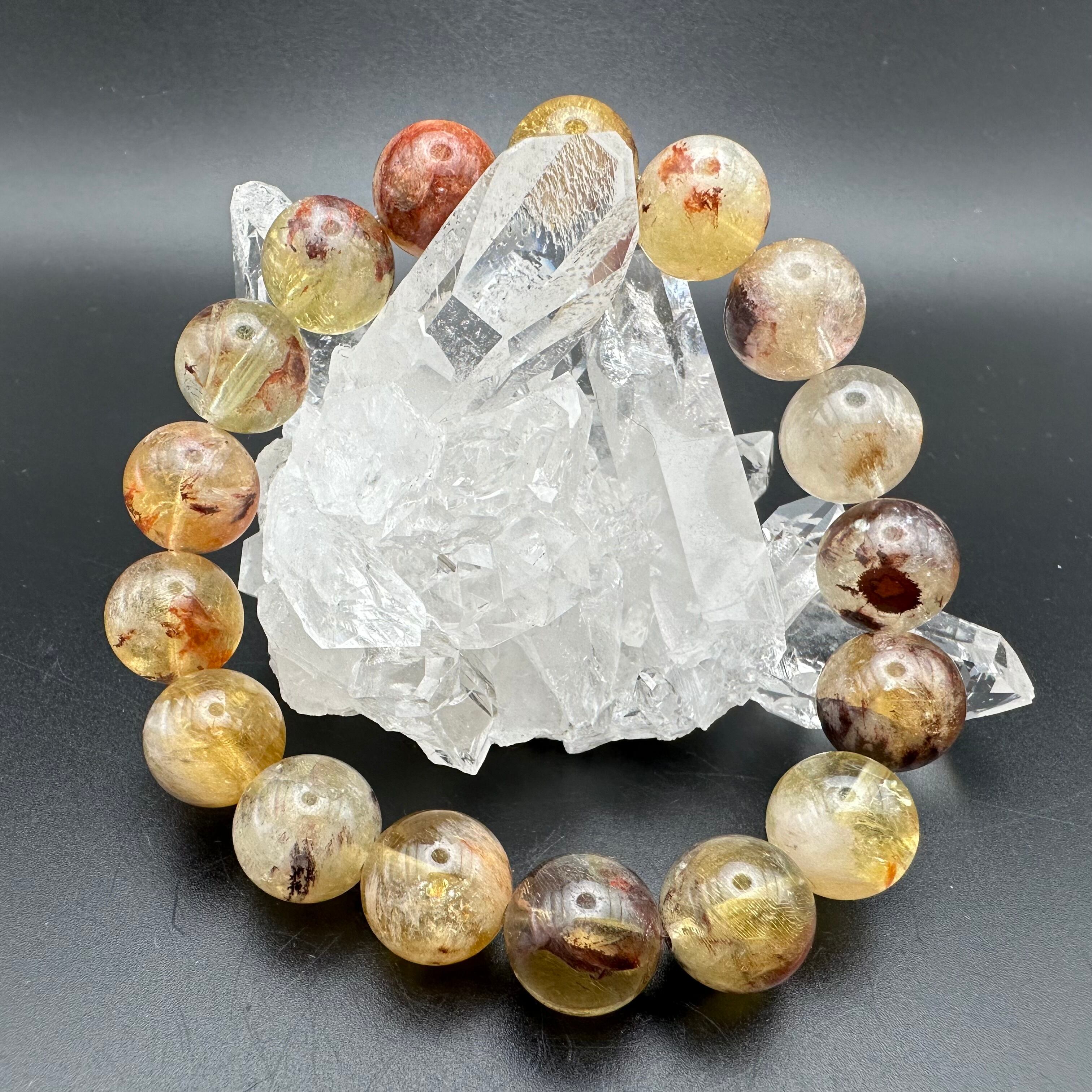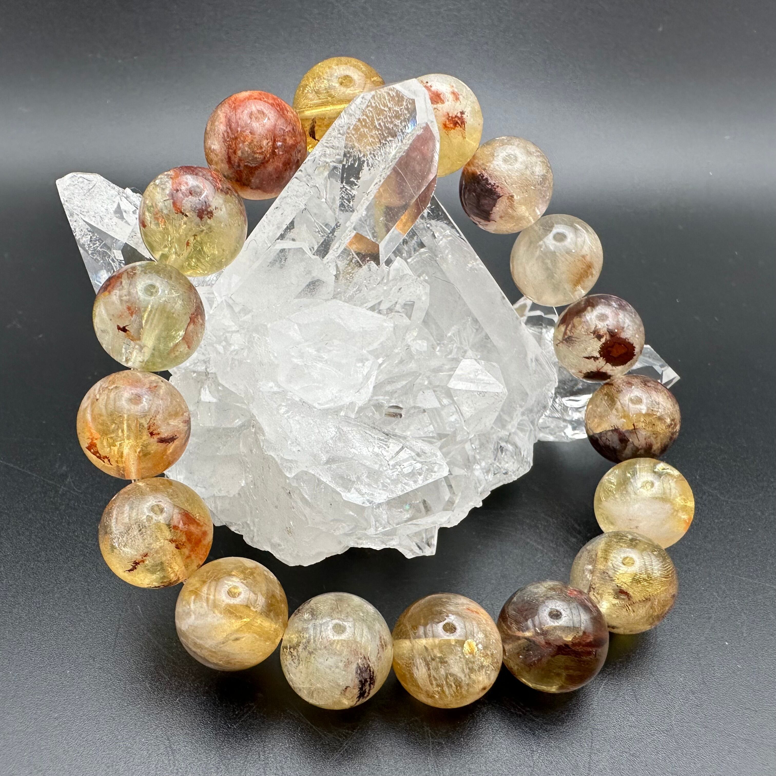 他にもゲーサイトなど様々な鉱物が透明感高い水晶の中に美しくインクルージョンされたとっても魅力的で不思議なブレスレットです。