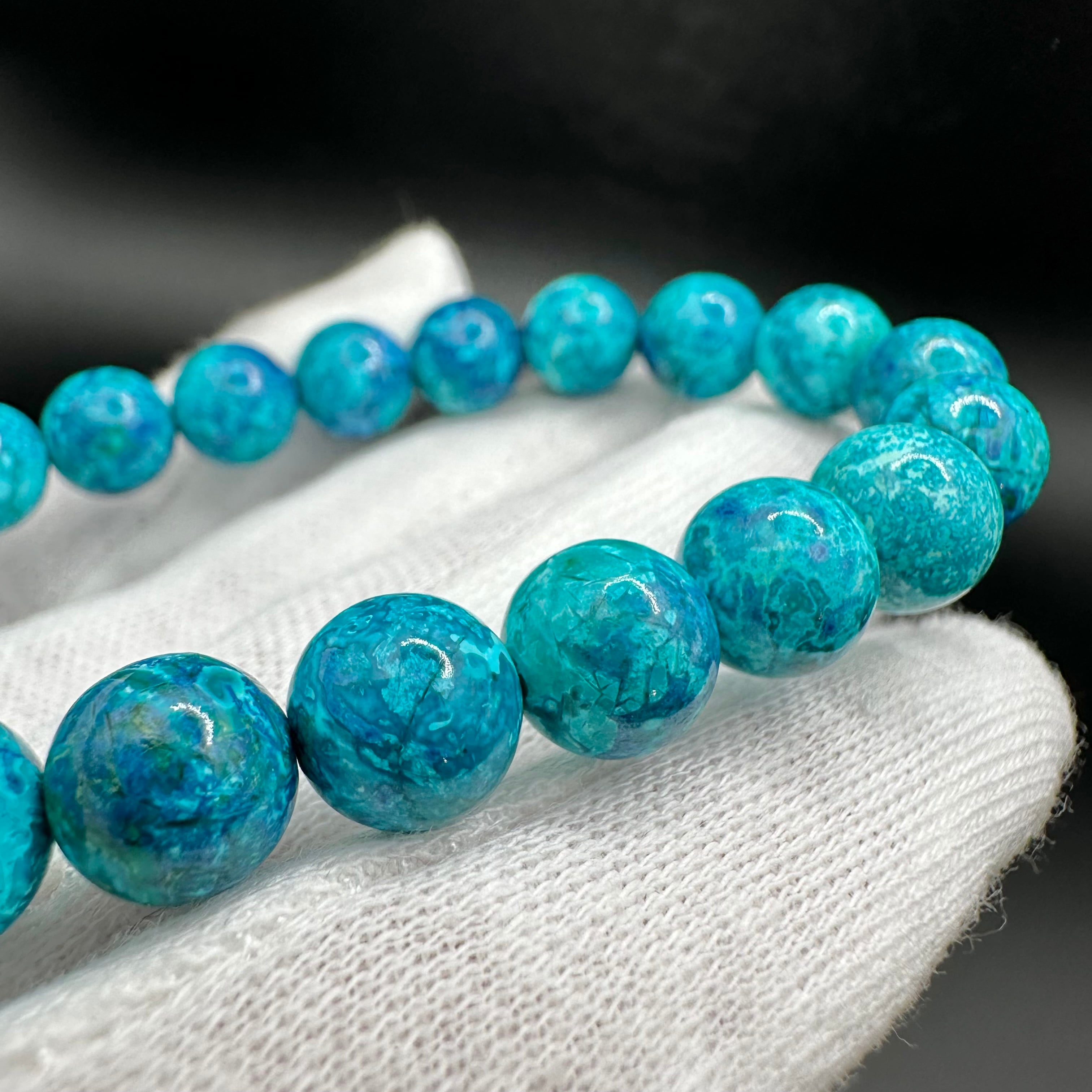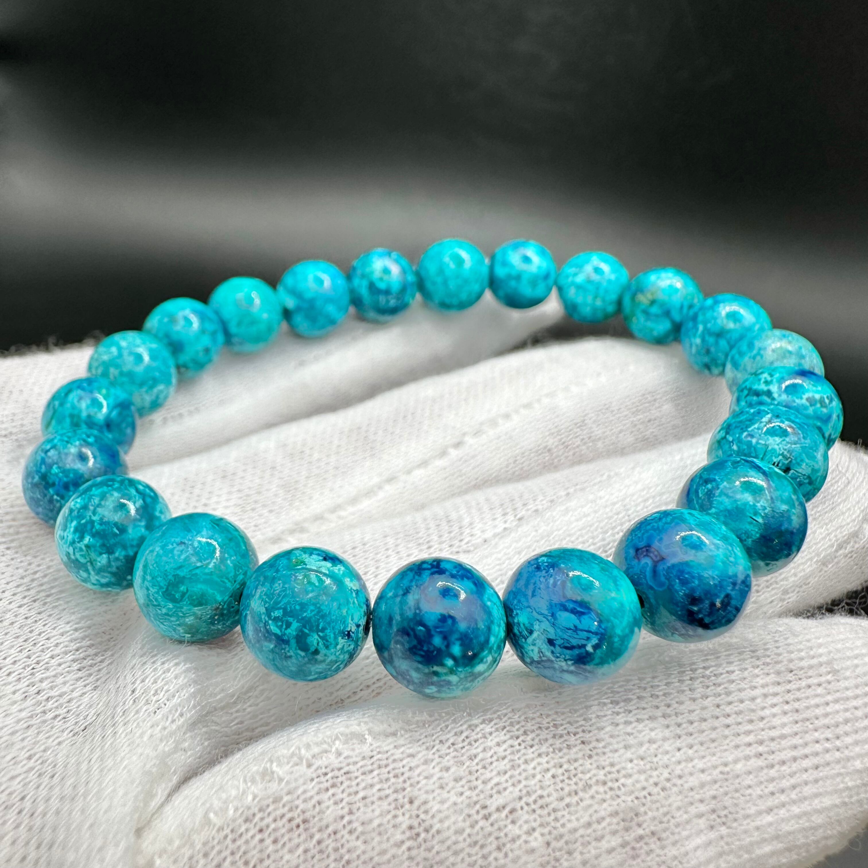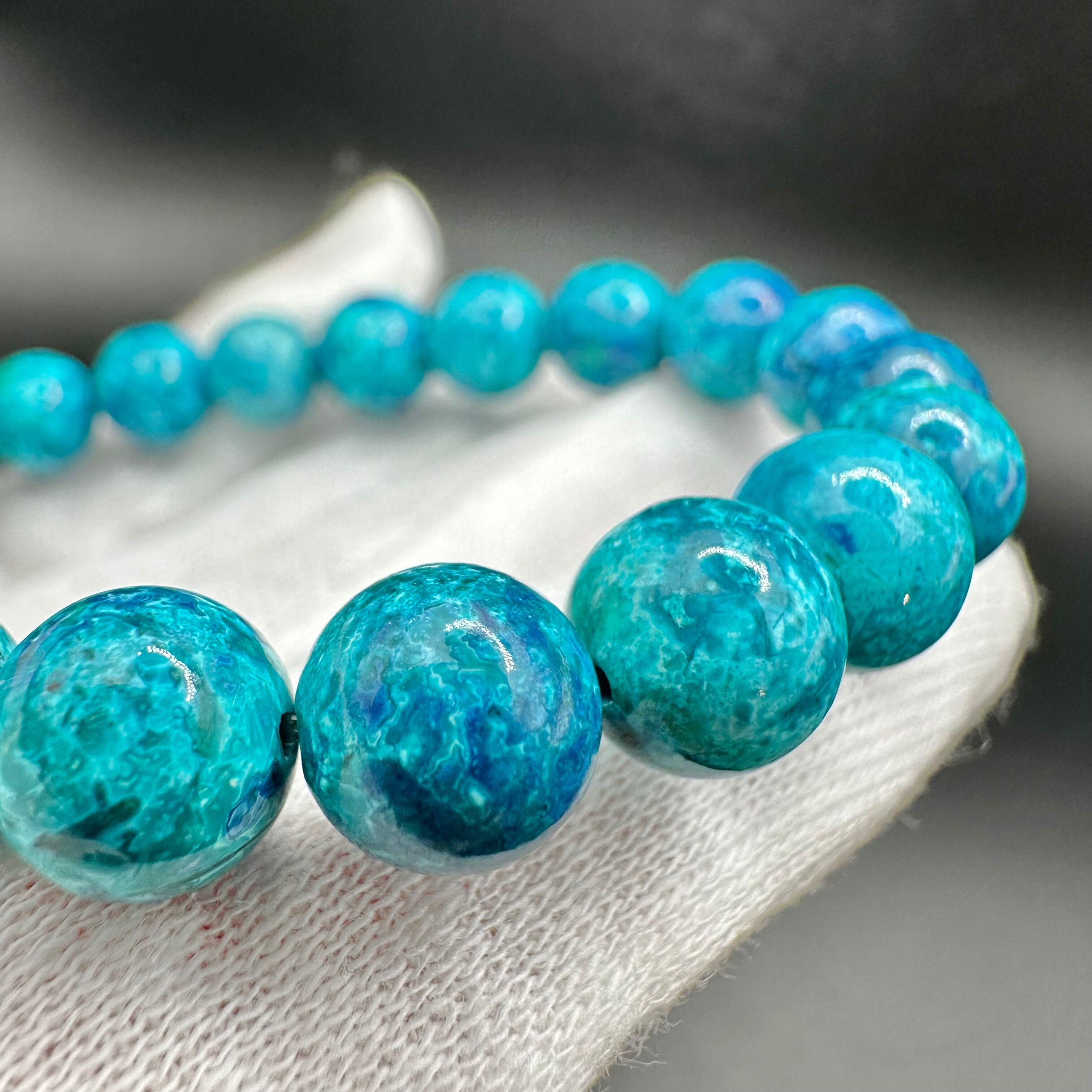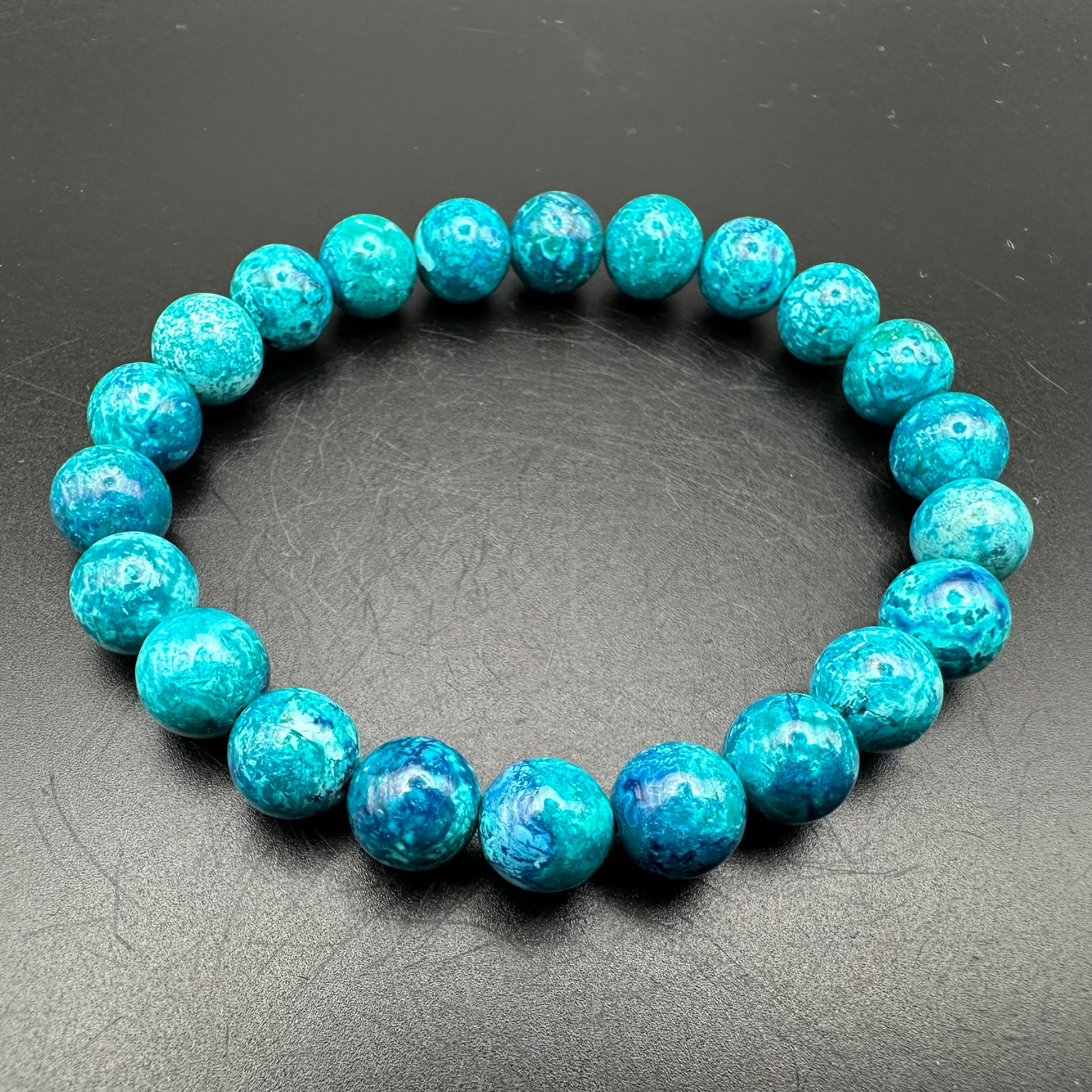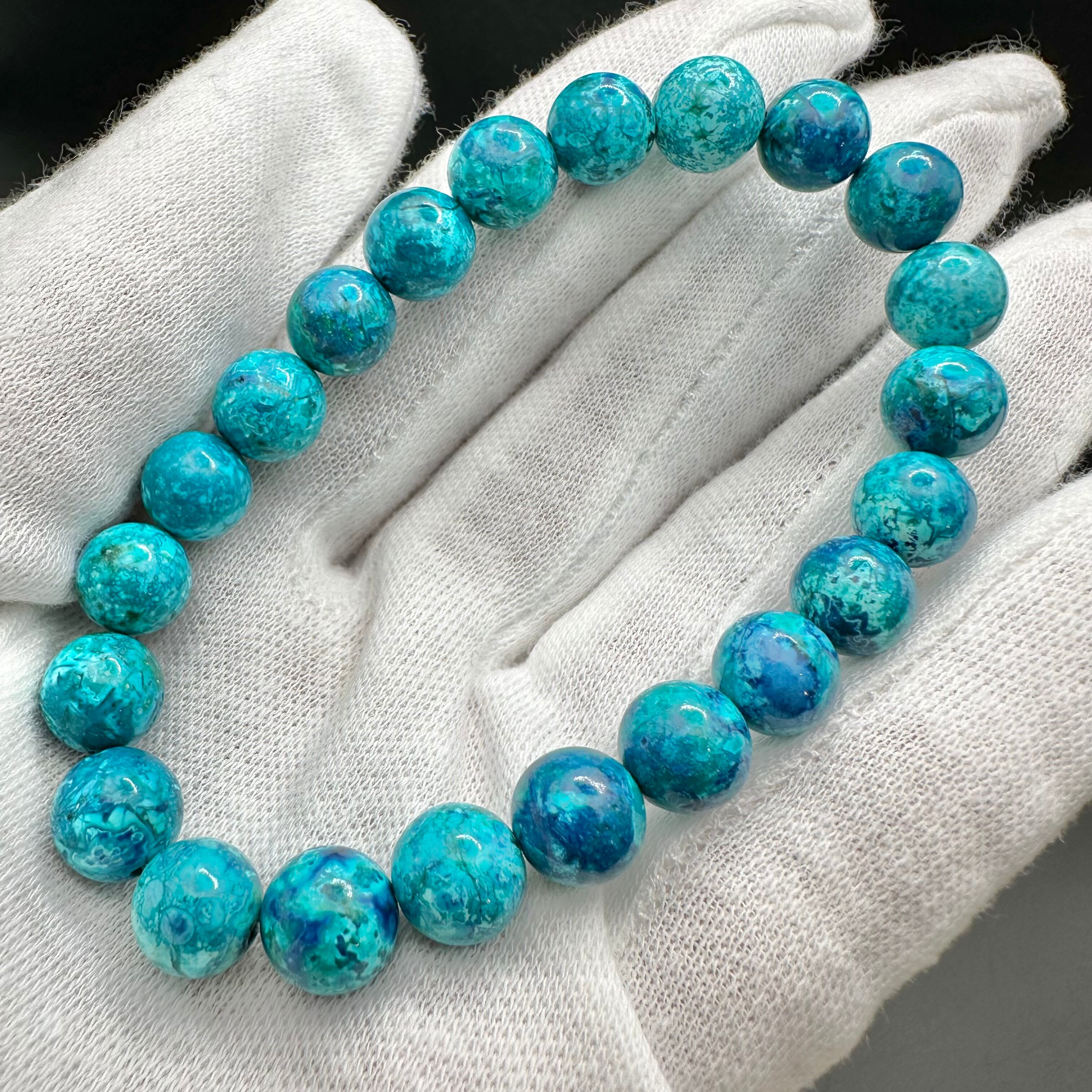 こちらは目の覚めるような様々なブルーが混ざり合う様な模様を描いており、印象的なとても素晴らしい色味のブレスレットです。