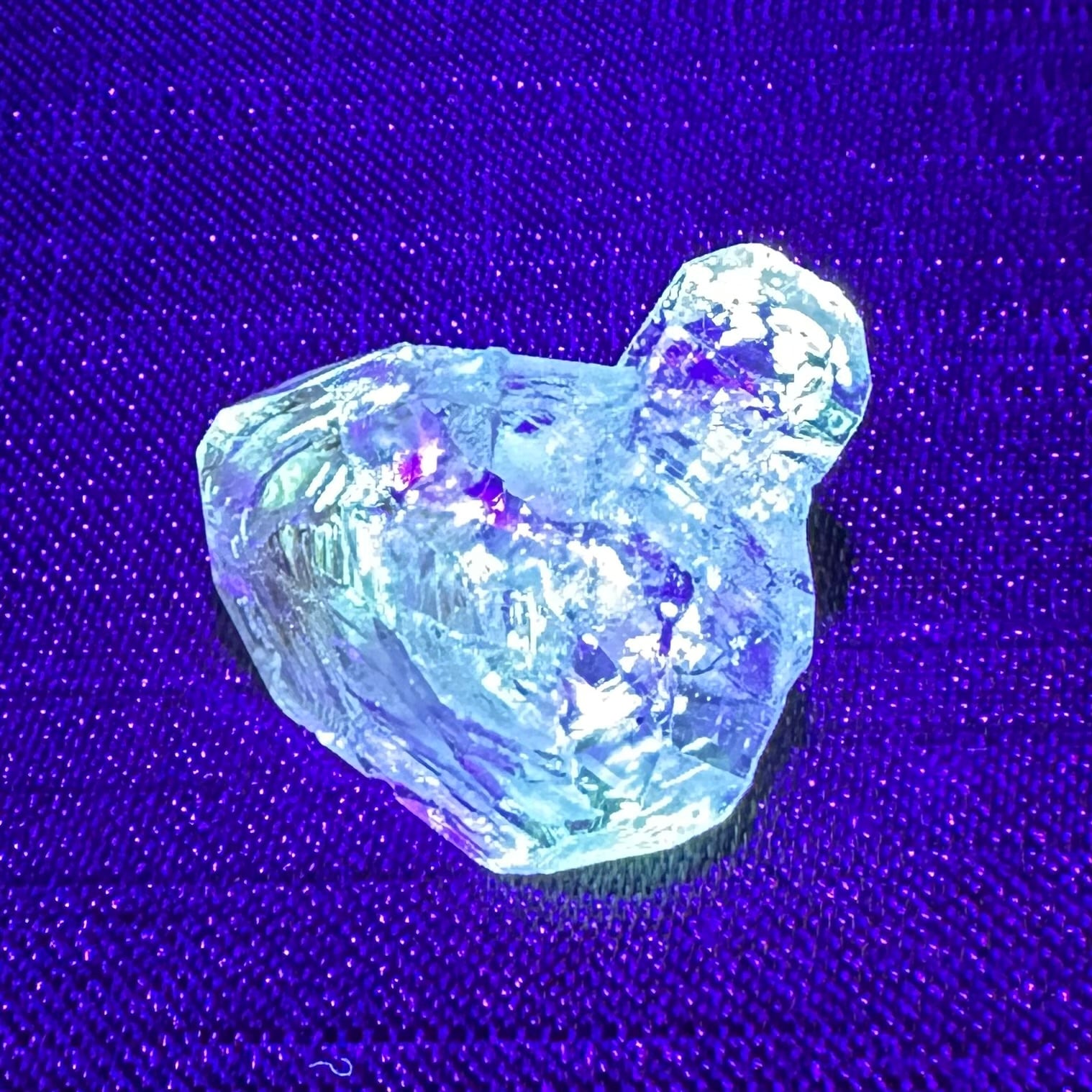 UVライトでとても強く蛍光する姿が見られ、たくさんのオイルもインクルージョンしていることが分ります。