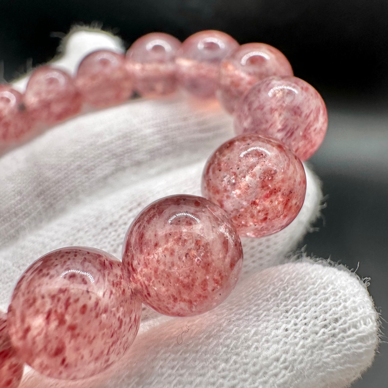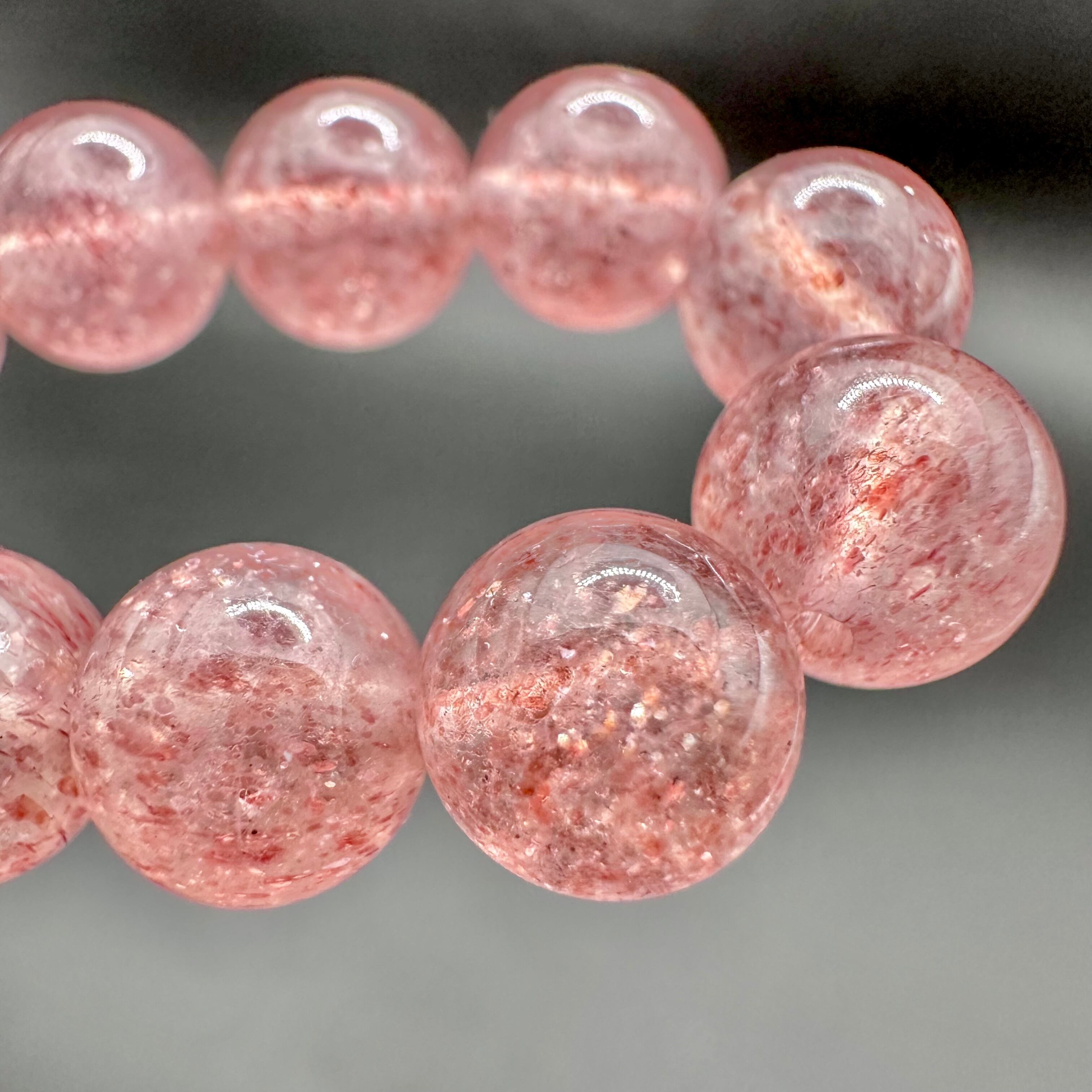 透明感がある水晶にピンクやレッドのエピドートとマイカがたっぷりと内包され、光が当たると無数のラメ状のマイカがキラキラとものすごい勢いで輝き、本当に息を呑む美しさです。