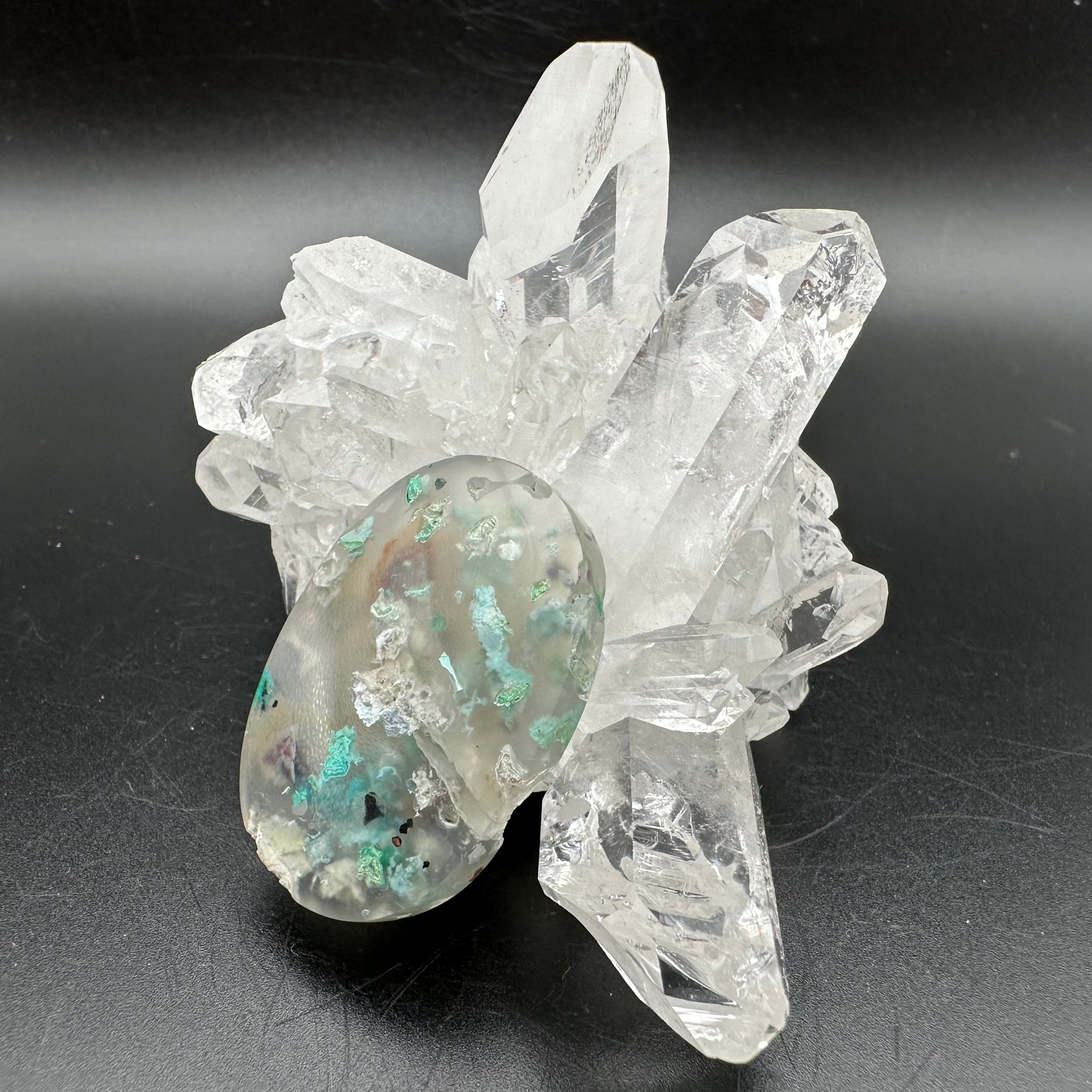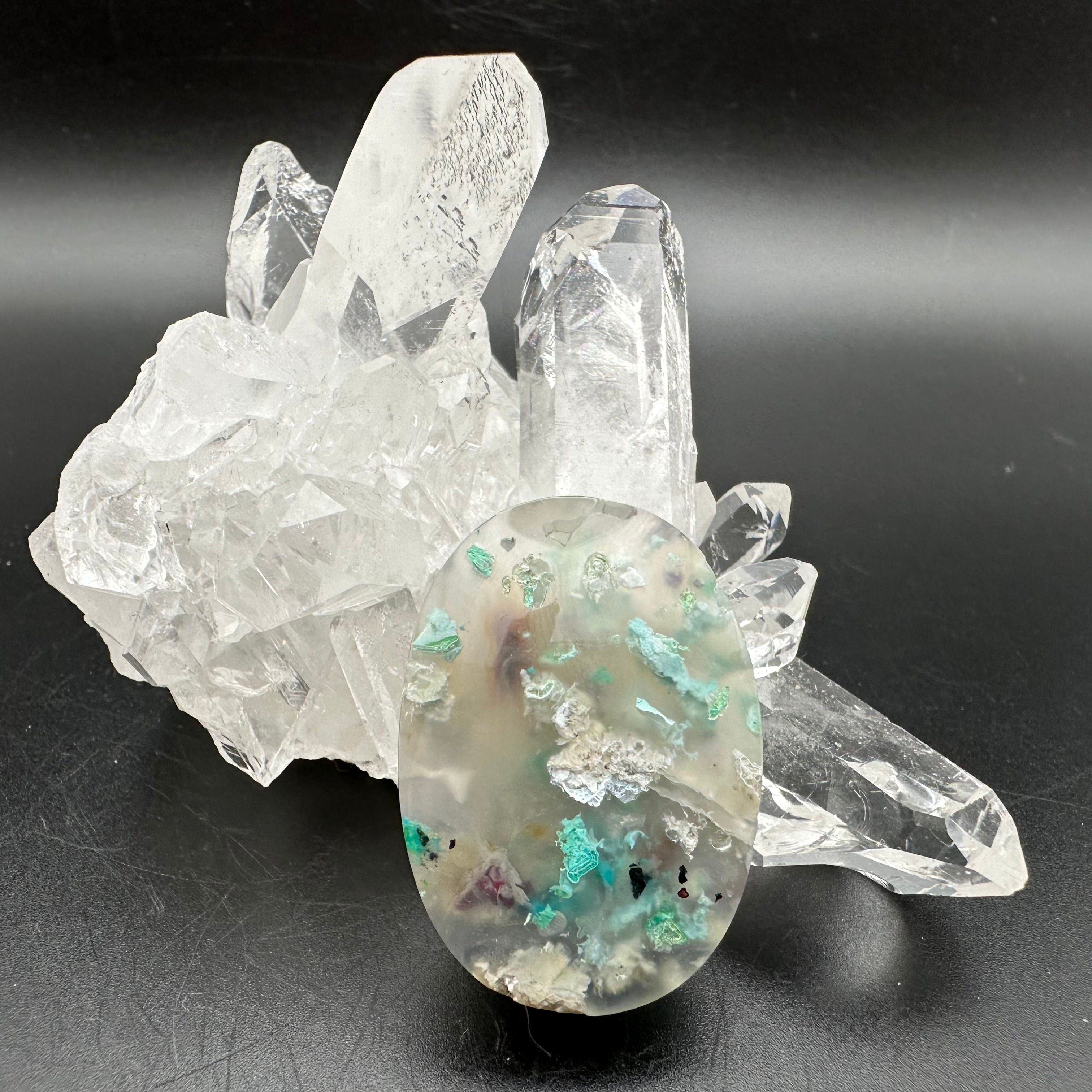 インドネシア・オビ島で産出されるクリソコラやマラカイト、そしてナチュラルコッパー(銅)が乳白色のアゲートにインクルージョンされた、すごくすごく素敵で可愛いルースです。