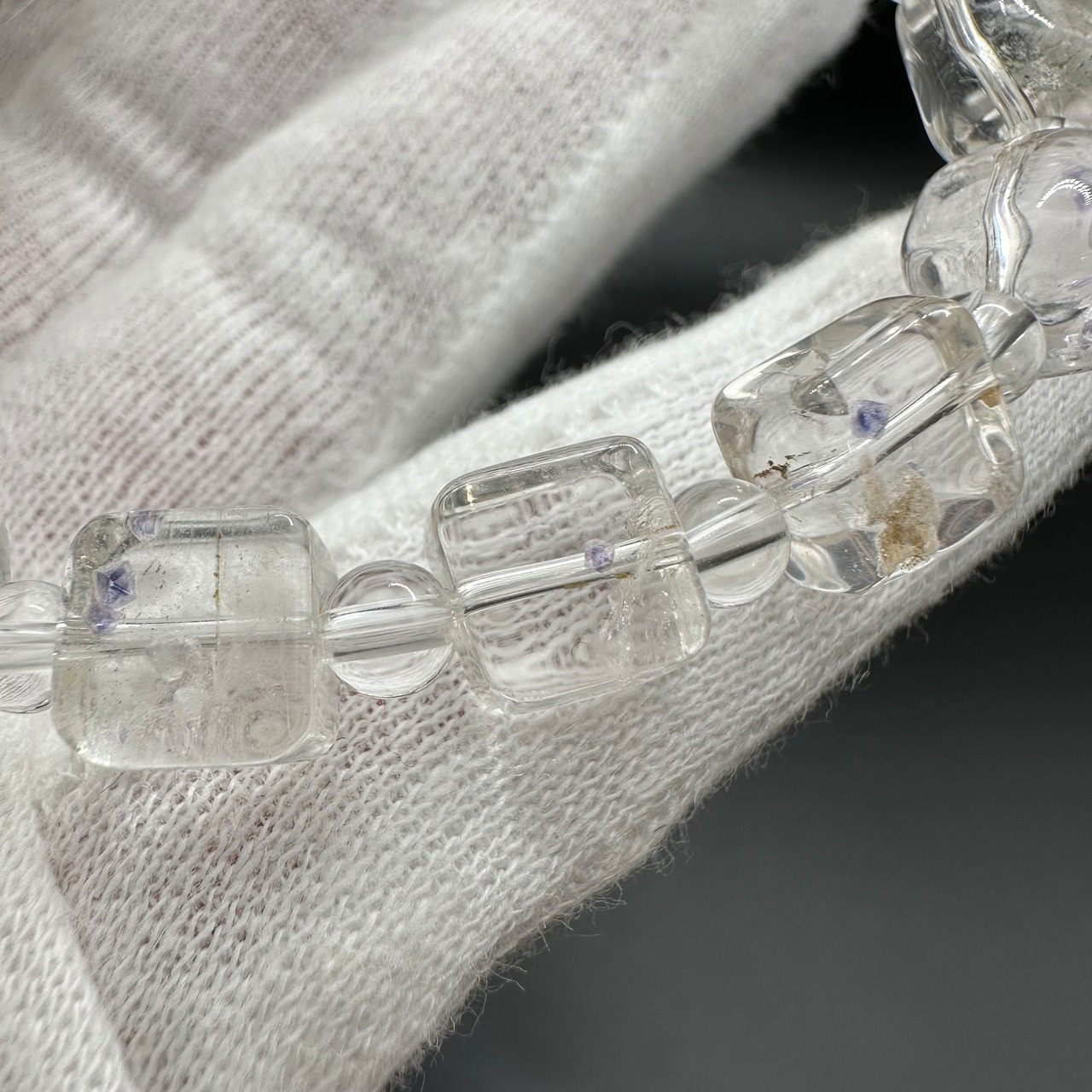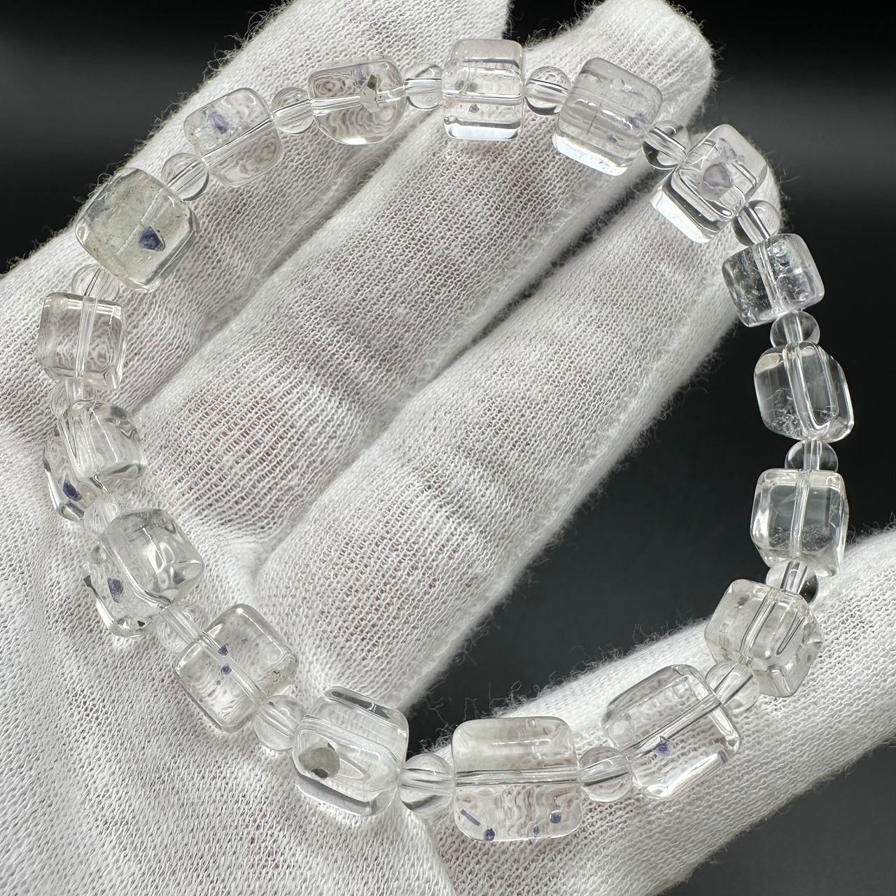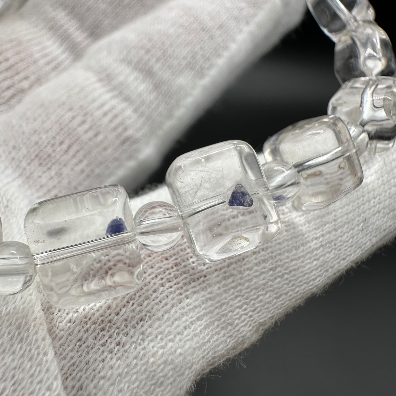 しっかり結晶の形が見られる美しいフローライトが入ったフローライトインクォーツをキューブ状にし、間に小さな水晶の丸玉ビーズを入れたブレスレットです。