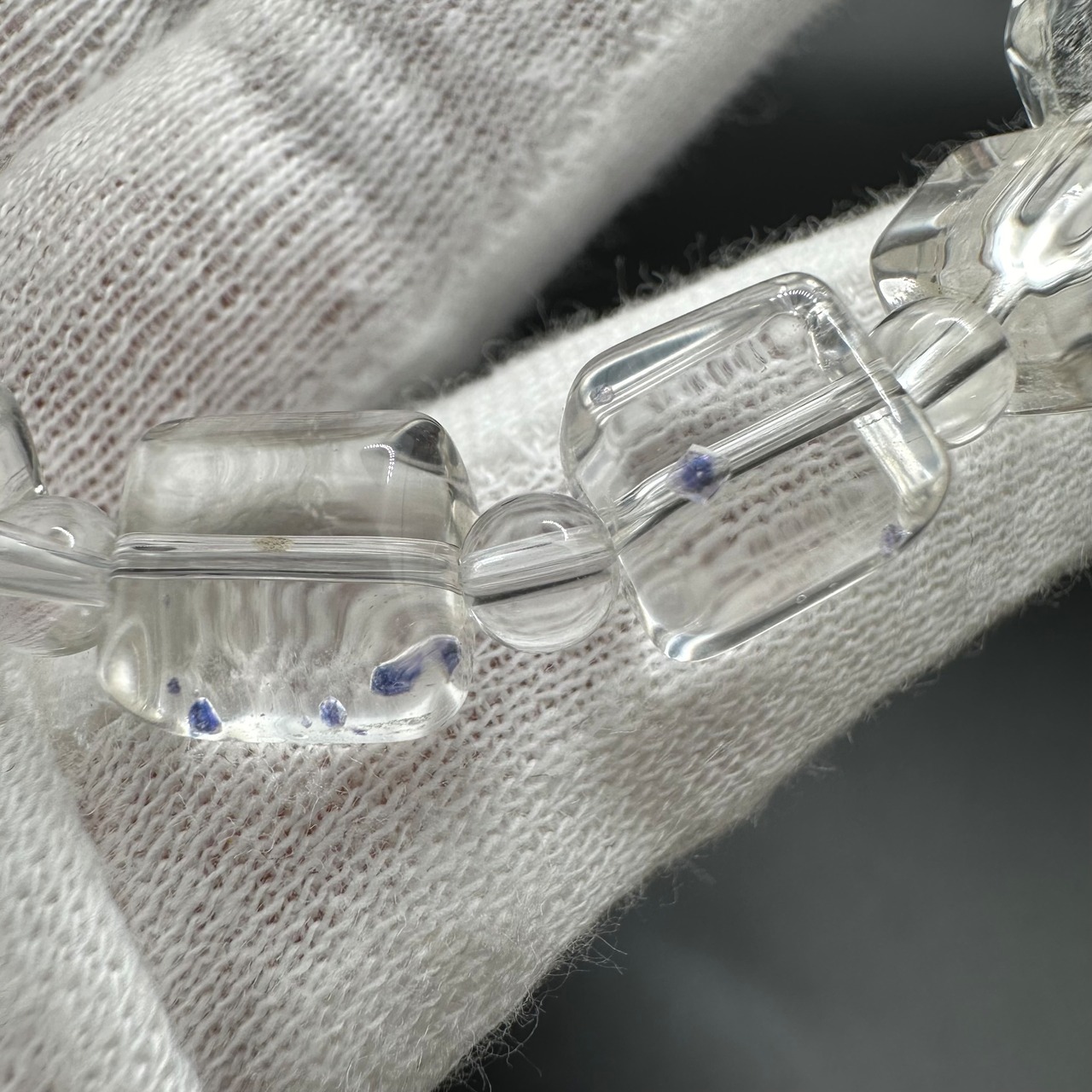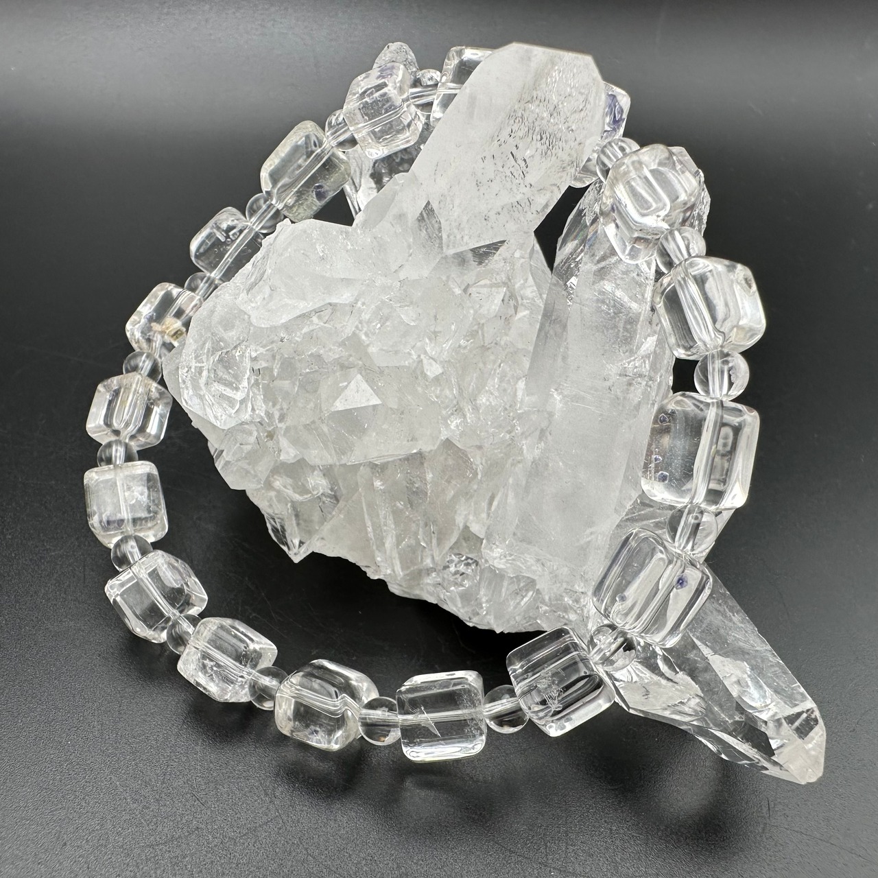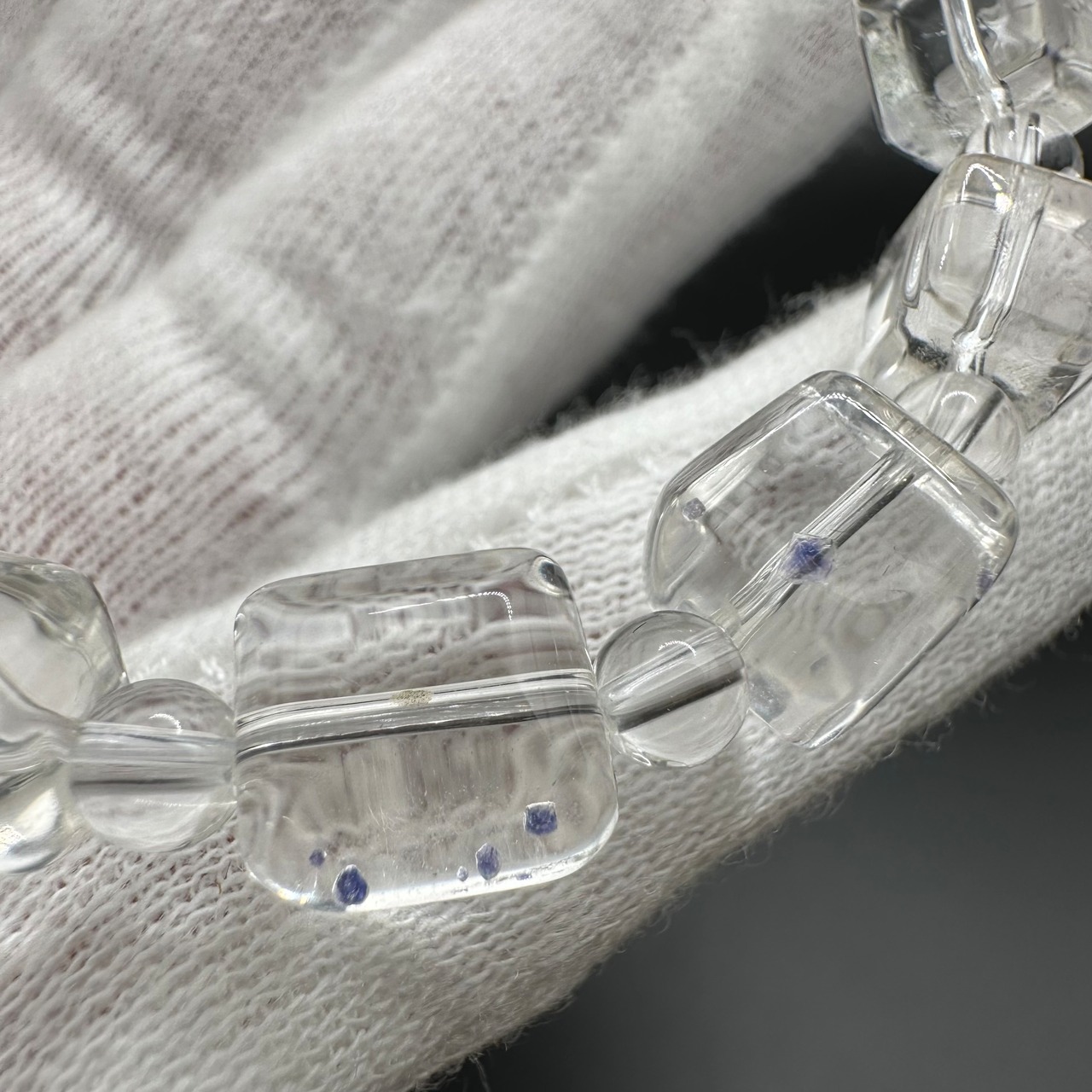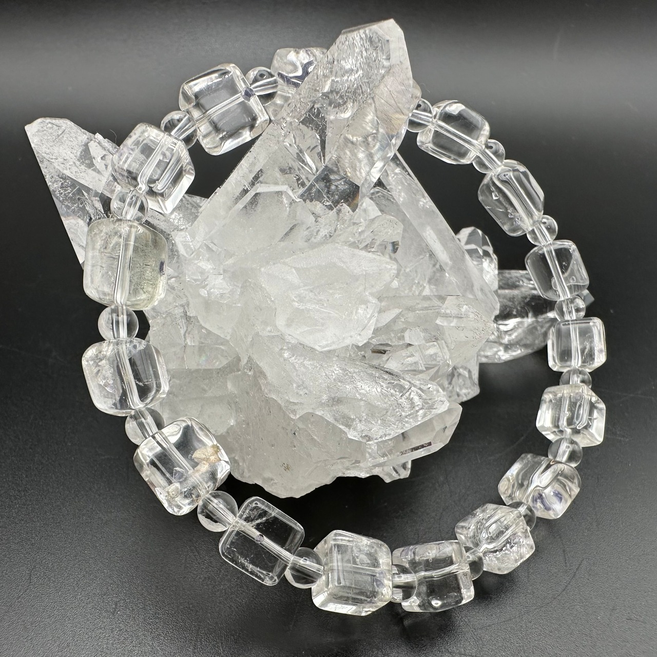 しっかり結晶の形が見られる美しいフローライトが入ったフローライトインクォーツをキューブ状にし、間に小さな水晶の丸玉ビーズを入れたブレスレットです。