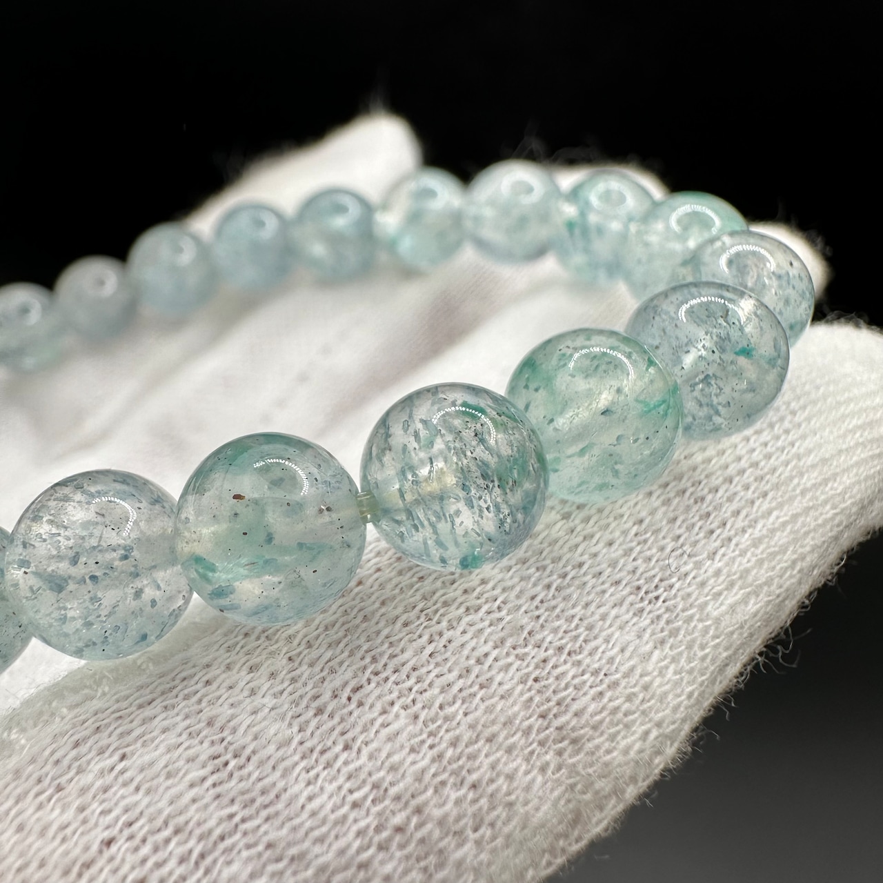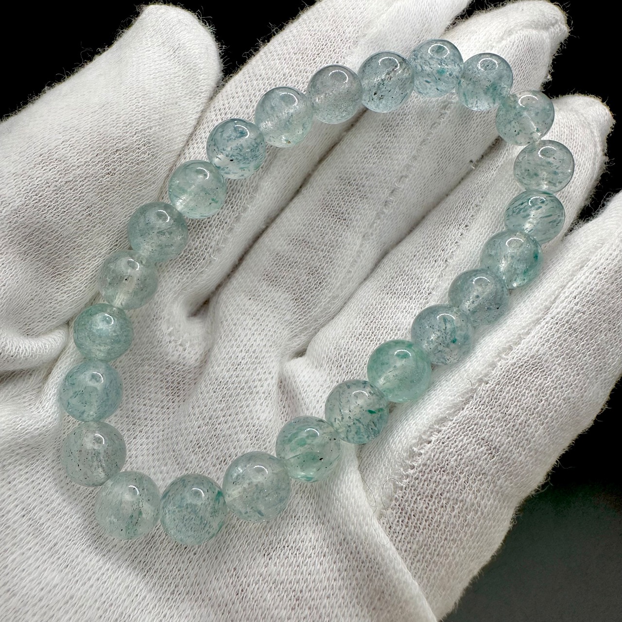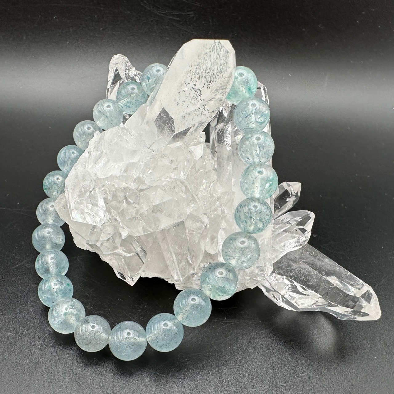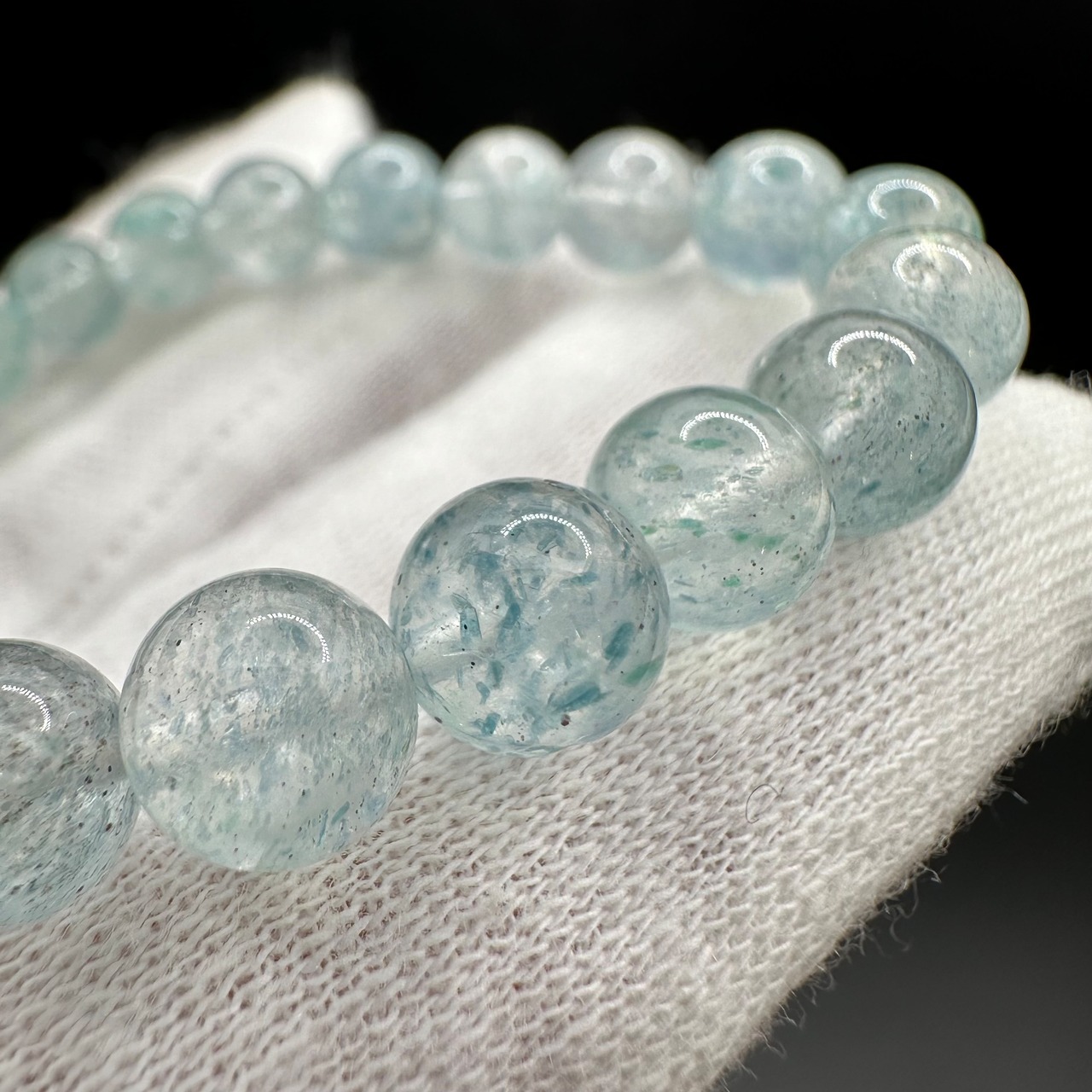 一見、淡いブルーの透明感があるブレスレットに見えますが、よく見るとしっかりと花びらが舞い散った様に細かなカイヤナイトが水晶に入り込んでいます。