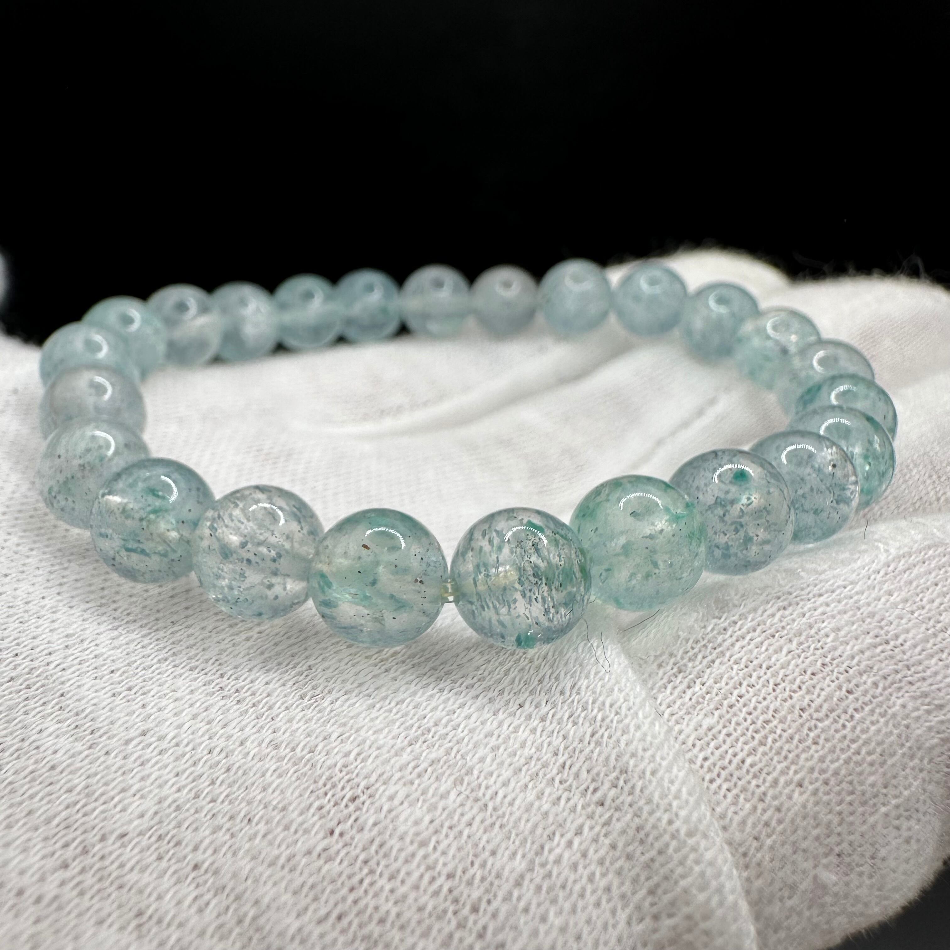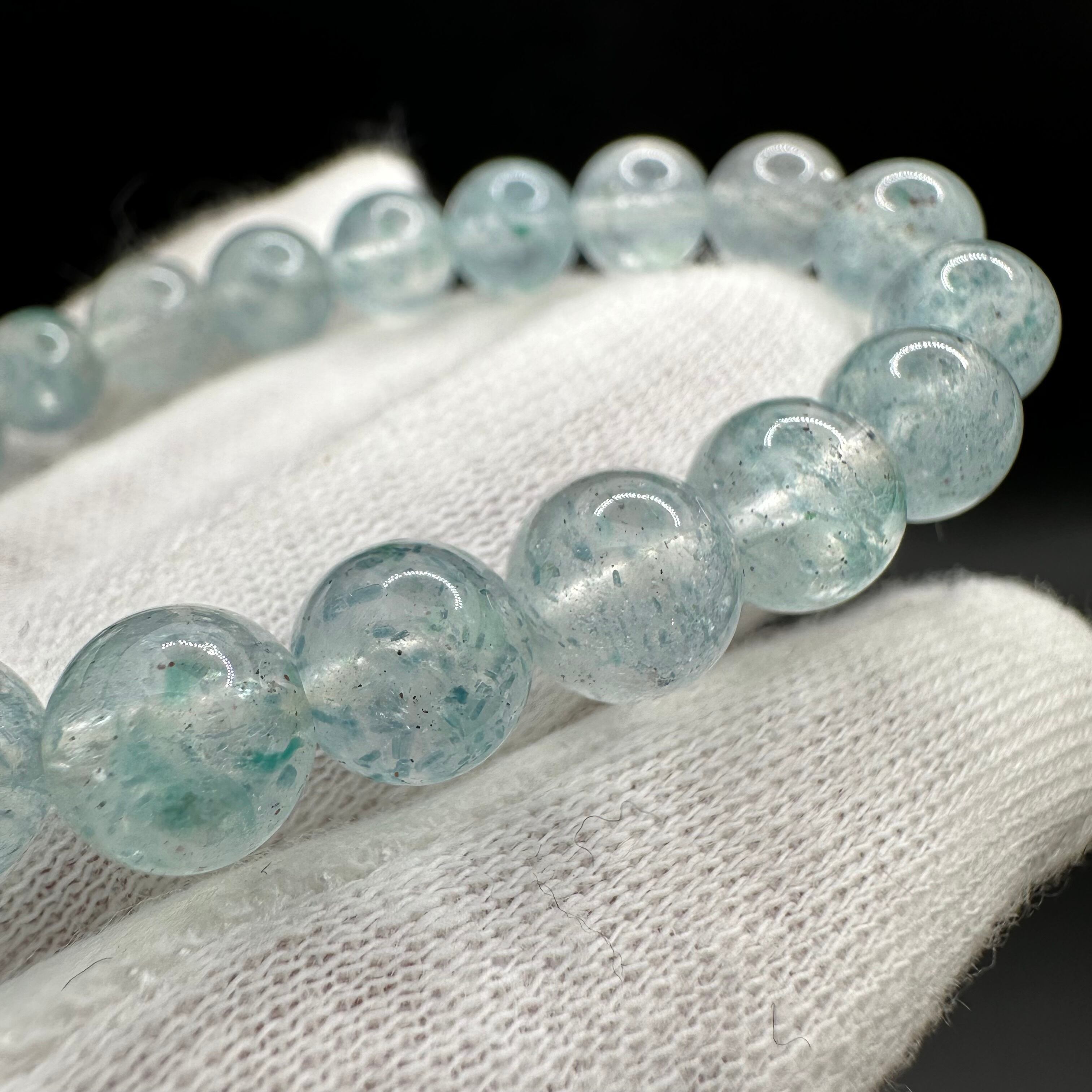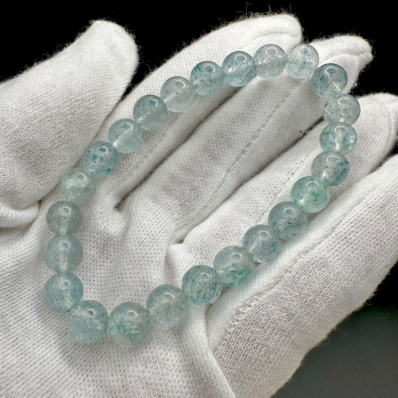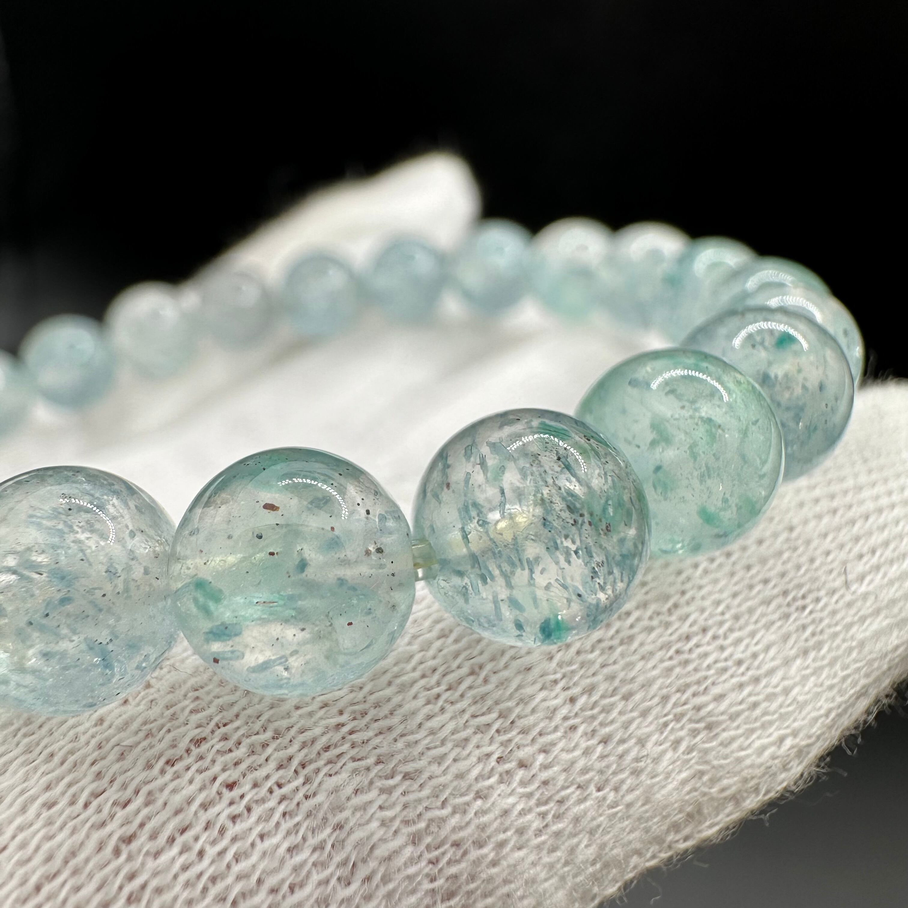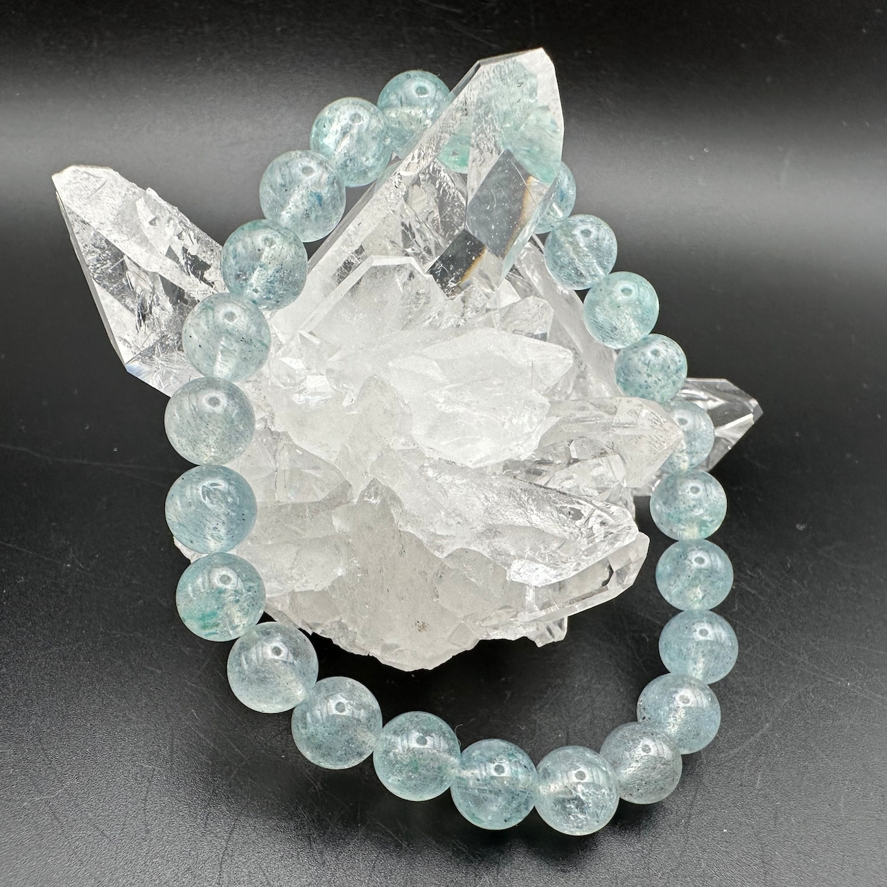 一見、淡いブルーの透明感があるブレスレットに見えますが、よく見るとしっかりと花びらが舞い散った様に細かなカイヤナイトが水晶に入り込んでいます。